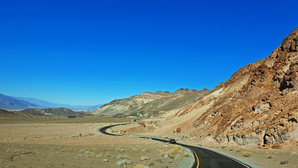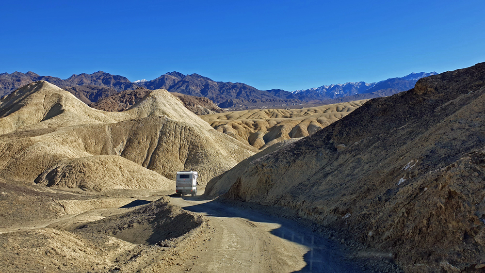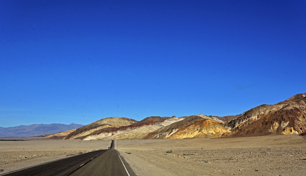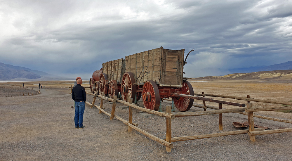 Der heutige Tag ist den farbigen Bergen und Hügeln gewidmet: Zunächst geht es durch den leuchtend gelben Twenty Mule Team Canyon, dann zum vielfarbigen Zabriskie Point und als Dessert über den überwältigenden Artists Drive. Nachdem wir uns an den leuchtenden Farben sattgesehen haben, fahren wir zügig rund 60 km auf der die Augen entspannenden, ungeteerten Westside Road, wo uns ein kleiner Wagentreck begegnet. Angesichts der doch eher eintönigen Strasse sind wir froh um unsere PS.