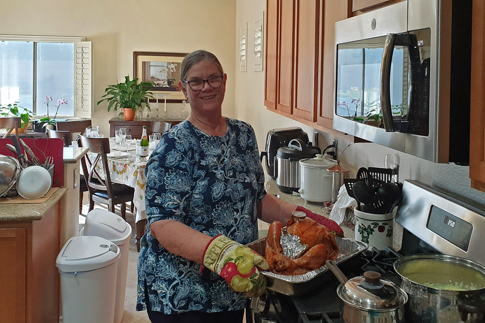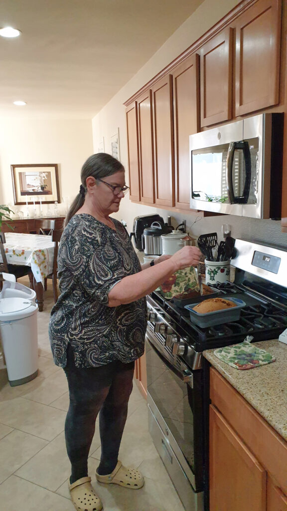 Das Highlight unseres Aufenthalts jedoch, dass Vicki für uns kurzum das Thanksgiving Dinner vorverlegt!  Sie beginnt schon Tage vorher mit den Vorbereitungen zu diesem traditionellen amerikanischen Erntedank-Essen, denn zum – absolut herrlichen – Truthahn tischt sie zahlreiche klassische Beilagen wie die Füllung, Kartoffelstock, glasierte Süsskartoffeln, überbackene grüne Bohnen, Erbsen und Rüebli, Kürbisbrot, Sauce und Preiselbeeren auf! Und als Dessert hat sie eine wunderbare Pumpkin Pie gebacken (die dann allerdings etwas später verspeist wird… 😉 ).