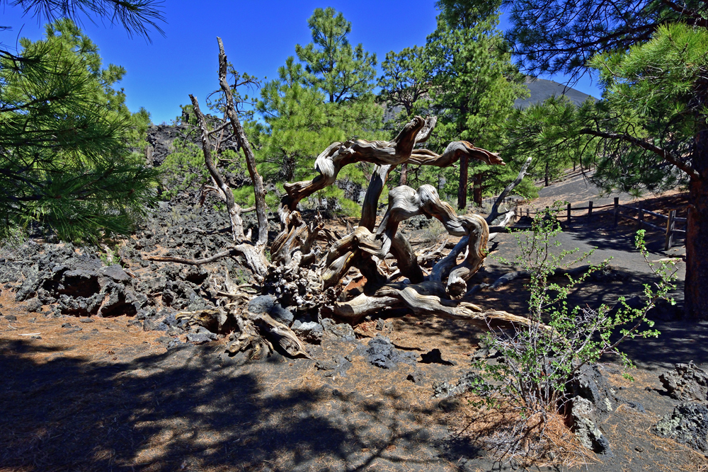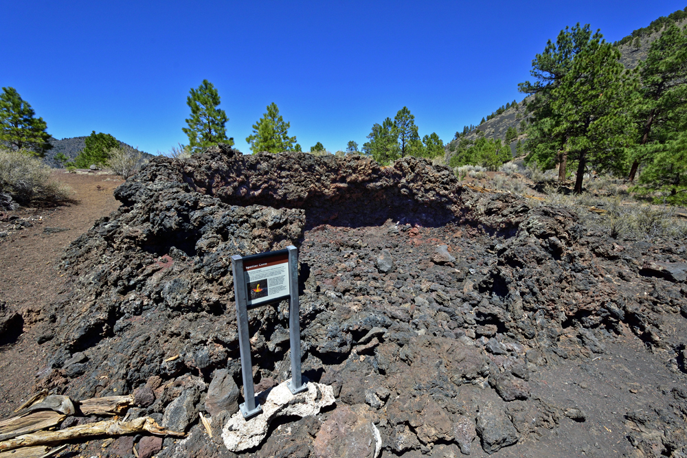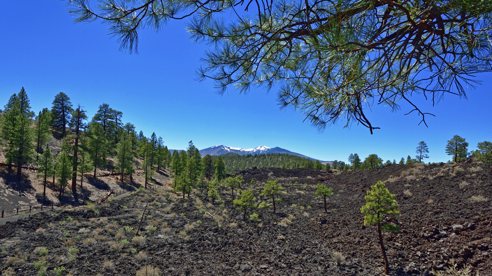 Dieser Tag ist den Vulkanen und Pueblos gewidmet. Sunset Crater, der vor etwa 1000 Jahren ausgebrochen ist, ist der der jüngste «Cinder Cone» in einer ganzen Reihe von Vulkanen. Ein Rundweg führt uns durch das noch frisch aussehende Lavafeld, vorbei an «spatter cones» und «squeeze-ups» mit schönen Ausblicken auf den schwarz-roten Vulkankegel und die schneebedeckten San Francisco Peaks. Auch in dieser «Lavawüste» gibt es zahlreiche kleine Pflanzen und auch einige grosse Föhren, die hier Fuss fassen konnten.