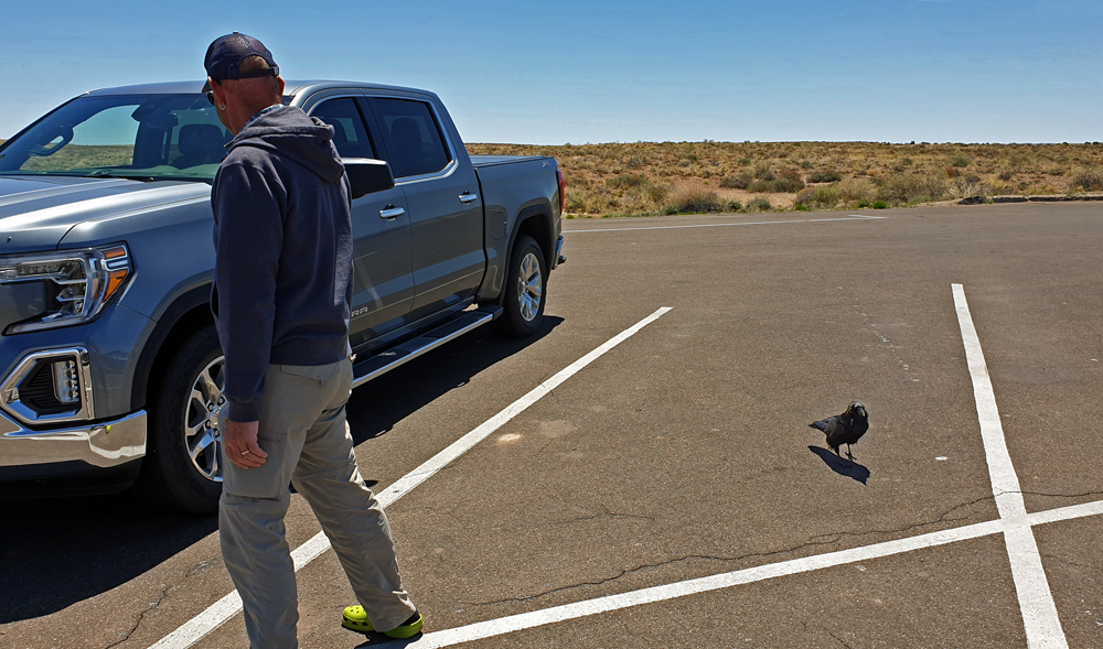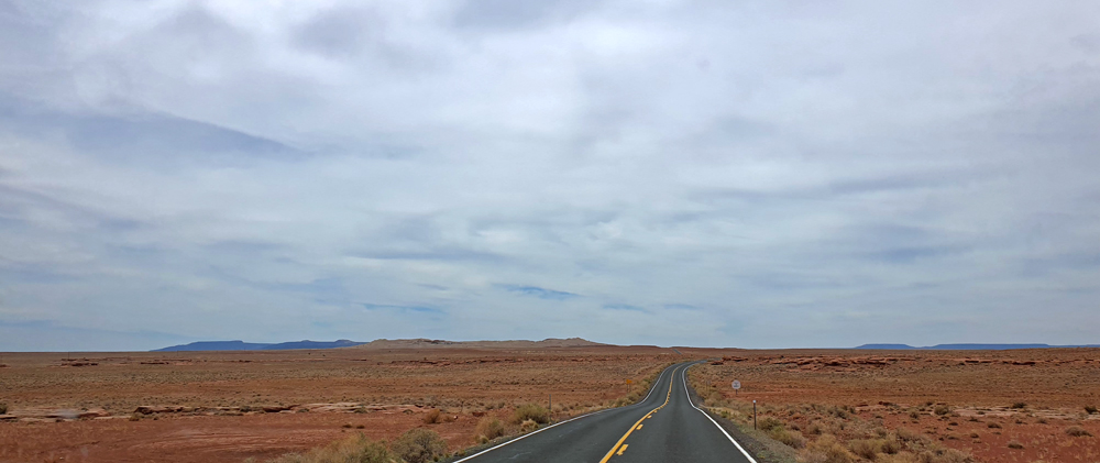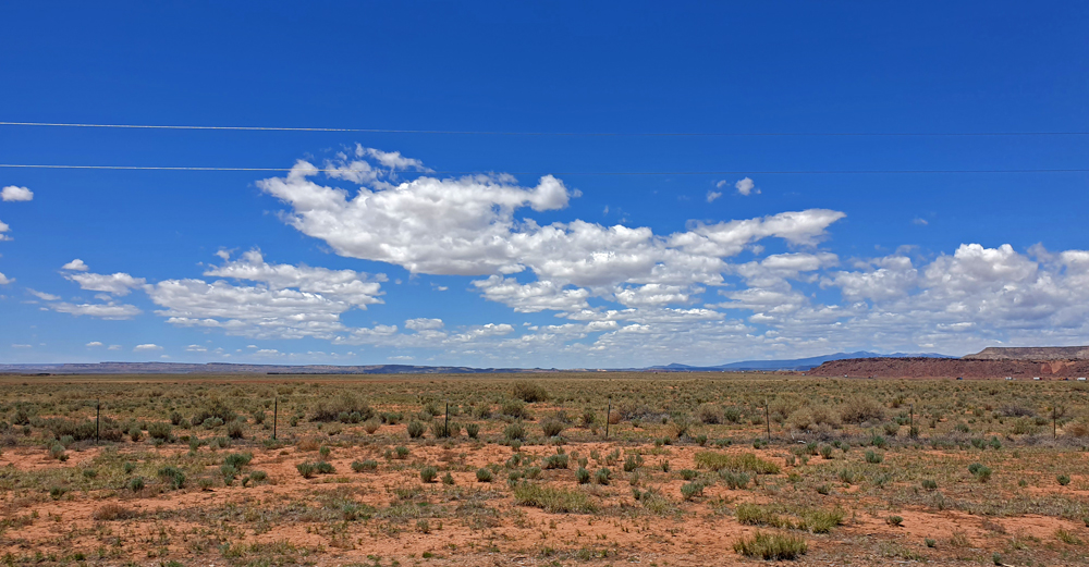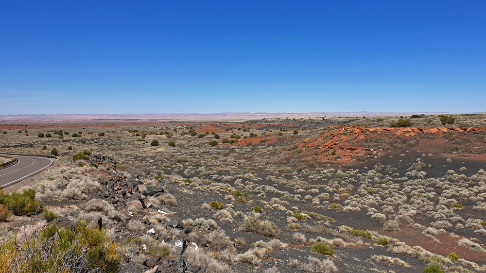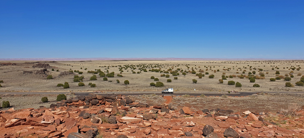 Nach dem Abstecher zum Meteorkrater folgen wir der I-40 über einen sehr spärlich bewachsenen Abschnitt des Colorado-Plateaus. Es ist heiss (30 °C) und es gibt hier – abgesehen von einem kurzen Blick in die Schlucht des Kleinen Colorado Rivers – nicht besonders viel zu sehen. So kommen wir bei unserem Hörbuch ein schönes Stück weiter. Das nächste Highlight steht aber schon morgen auf dem Programm: Der Petrified Forest NP.