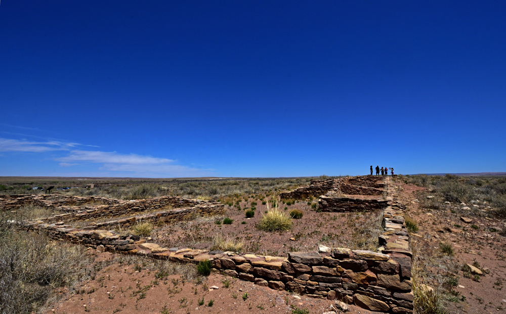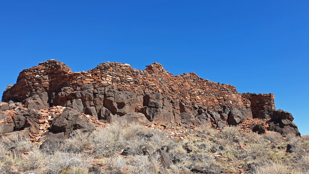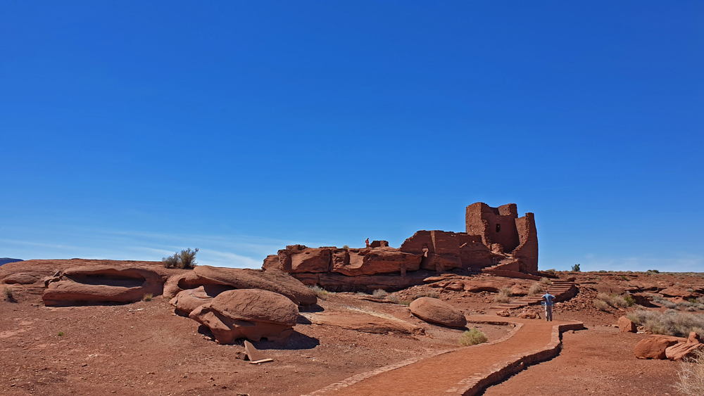 Auf einer Verbindungsstrasse gelangt man zum nahegelegenen Wupatki National Monument, unterbrochen von schönen Ausblicken auf die mit olivgrünen Rabbitbrush und dunkelgrünem Wacholder bestandenen schwarzen Flächen mit der rot leuchtenden «Painted Desert» («Bemalte Wüste») in der Ferne. Bald tauchen spannenden Formationen des roten Moenkopi-Sandsteins aus dem schwarzen Lavasand auf. Wir besuchen die «Wukoki» und «Zitadelle»-Ruinen, beides dreistöckige «Hochhäuser» der Kayenta Ancestral Puebloans aus dem 12. Jh., die auf markanten Felsvorsprüngen errichtet wurden. Beide weithin sichtbaren Gebäude, die 15-20 km auseinanderliegen, waren möglicherweise «Brennpunkte» für die umgebenden Kayenta und Sinagua.