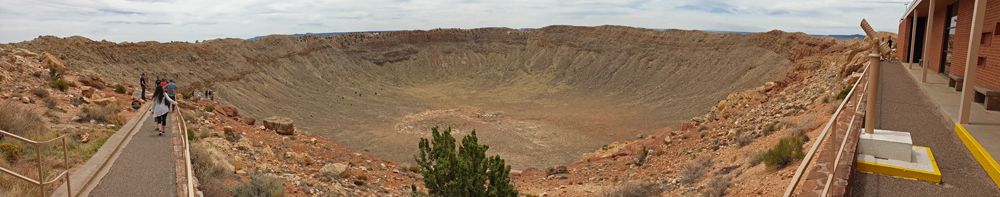 Wir machen einen Abstecher zu einer von weitem nicht besonders spektakulären Erhebung, die schon Meilen vorher durch Tafeln angekündigt wird. Von nahem ist das «Loch» des auf der Erde am besten erhaltenen Meteorkraters jedoch sehr beeindruckend! Vor rund 50’000 Jahren ist hier ein vermutlich nur etwa 45 m grosser Eisen-Nickel-Meteorit mit grosser Geschwindigkeit (fast 42’000 km/h) eingeschlagen. Seine Explosionskraft von über 20 Millionen Tonnen TNT hat ein Loch von 1.2 km Durchmesser und einer Tiefe von 168 m herausgesprengt. Wir bestaunen das Loch von einigen Aussichtspunkten und freuen uns dann sehr, dass in dieser privaten Einrichtung auch endlich wieder einmal das zugehörige Besucherzentrum mit einer interessanten Ausstellung geöffnet hat. Der Krater ist privat, da die Gegend noch vor der Gründung des Bundesstaates Arizona 1902 vom Bergbauingenieur Daniel Barringer gekauft wurde, der in der Folge während 26 Jahren vergeblich versucht hat, das Eisen des Meteoriten aufzufinden. Er wusste nicht, dass dieser während des Einschlags fast vollständig vergangen ist und es nie eine grosse Masse unter dem Kraterboden gab.