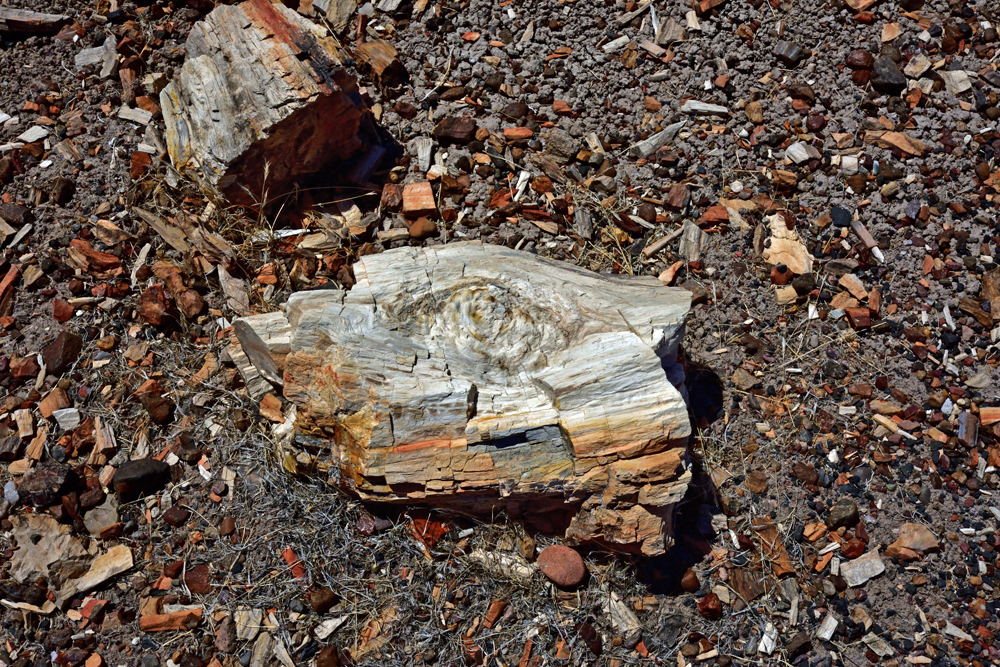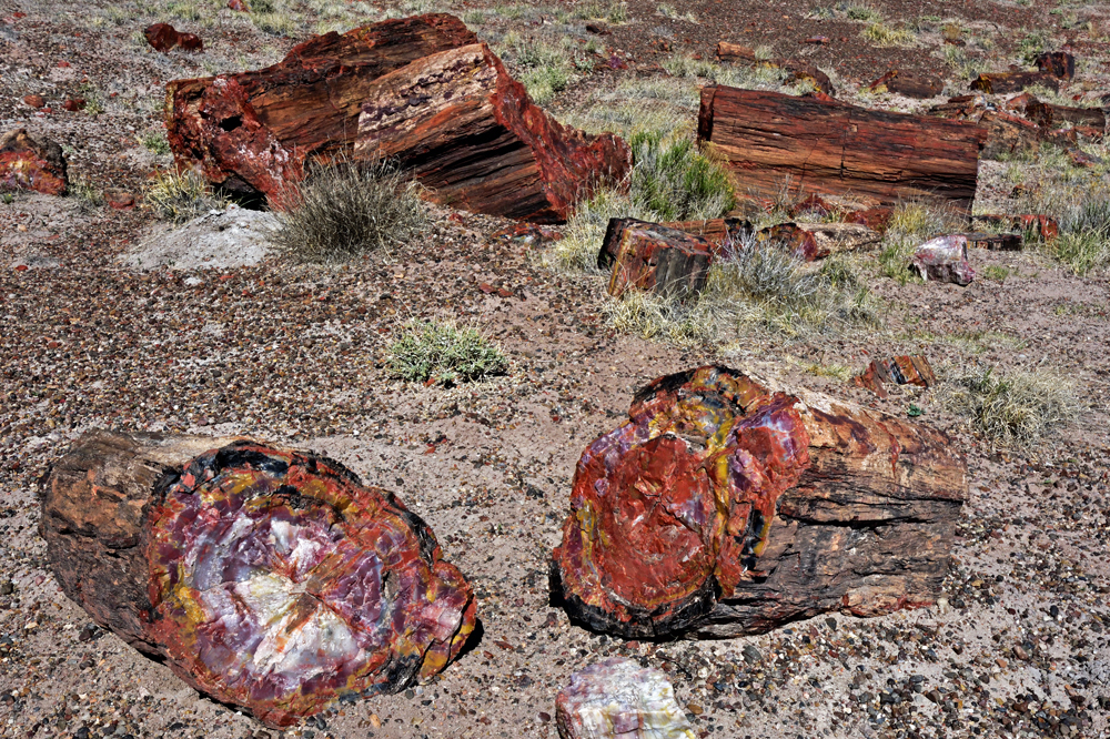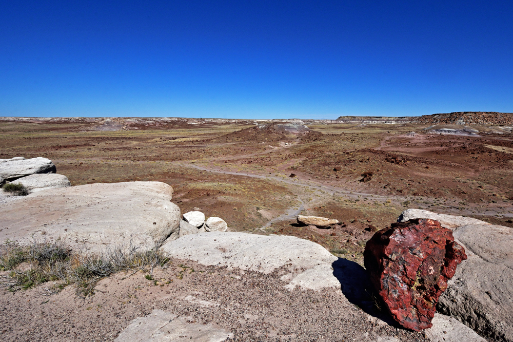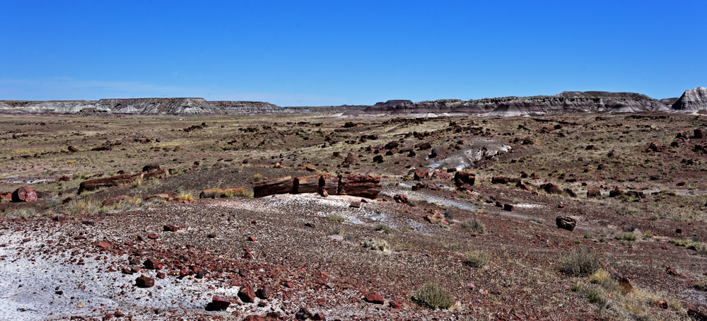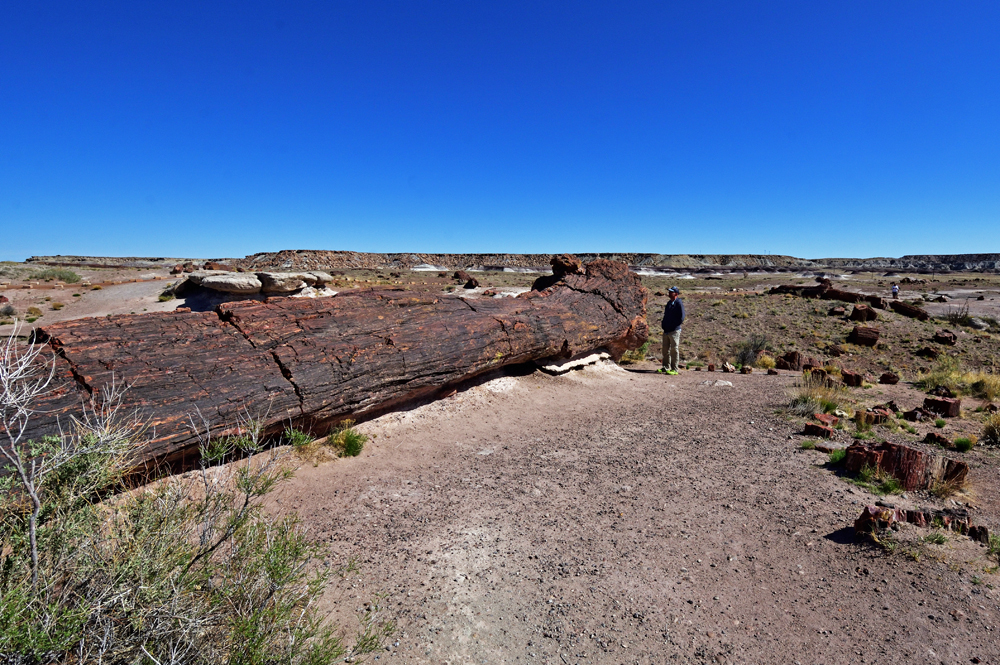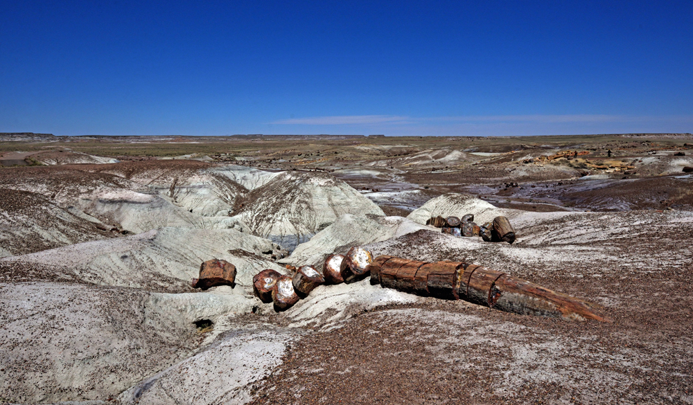 Punkt 8 Uhr öffnet sich das Tor und wir entdecken einen Tag lang diese surrealistische Gegend. Teils riesige Stämme und Stamm-Stücke liegen verstreut oder entlang alter Flussläufe konzentriert in einer farbenfrohen hügeligen Mondlandschaft; gleich nördlich an den Park schliesst sich ein geschütztes Stück Painted Desert, der «bemalte Wüste», an.