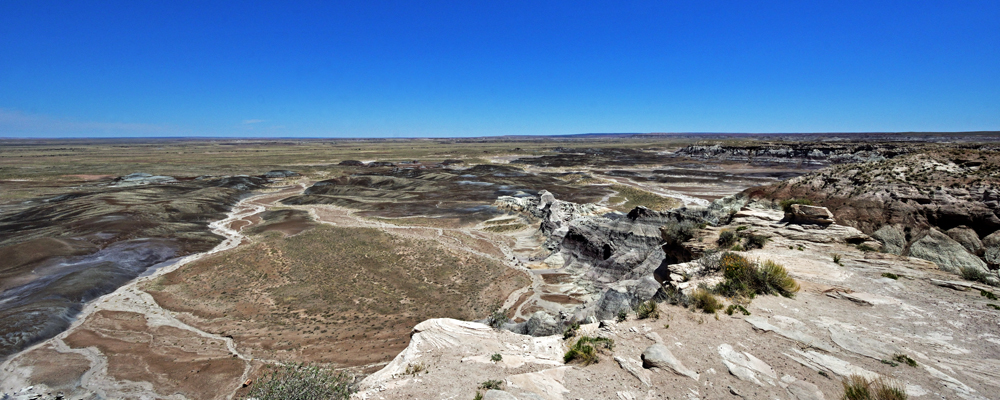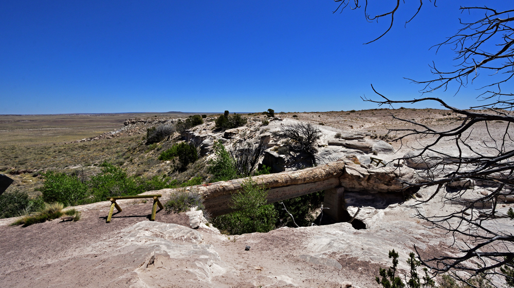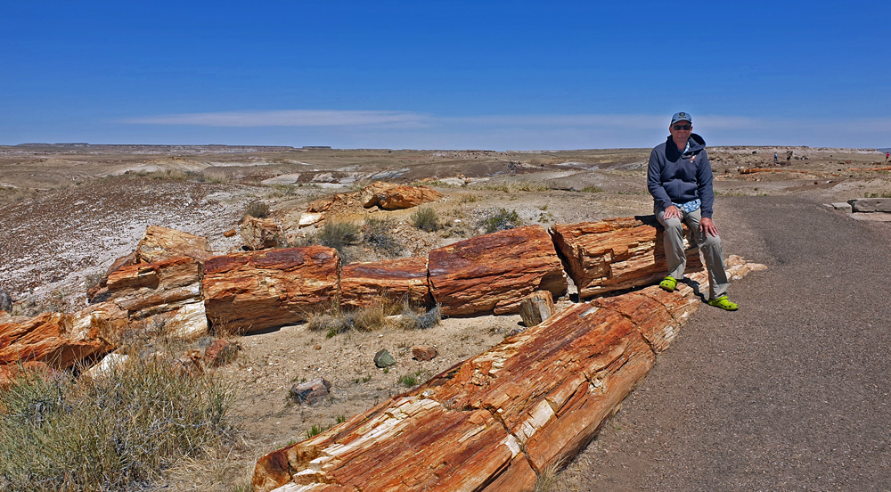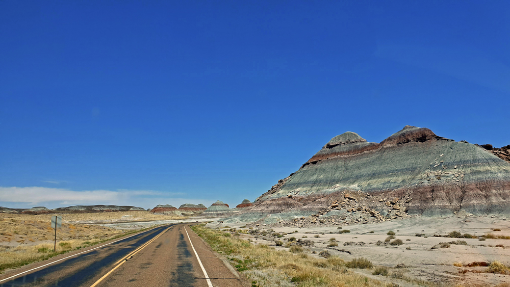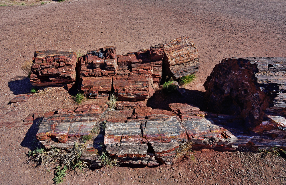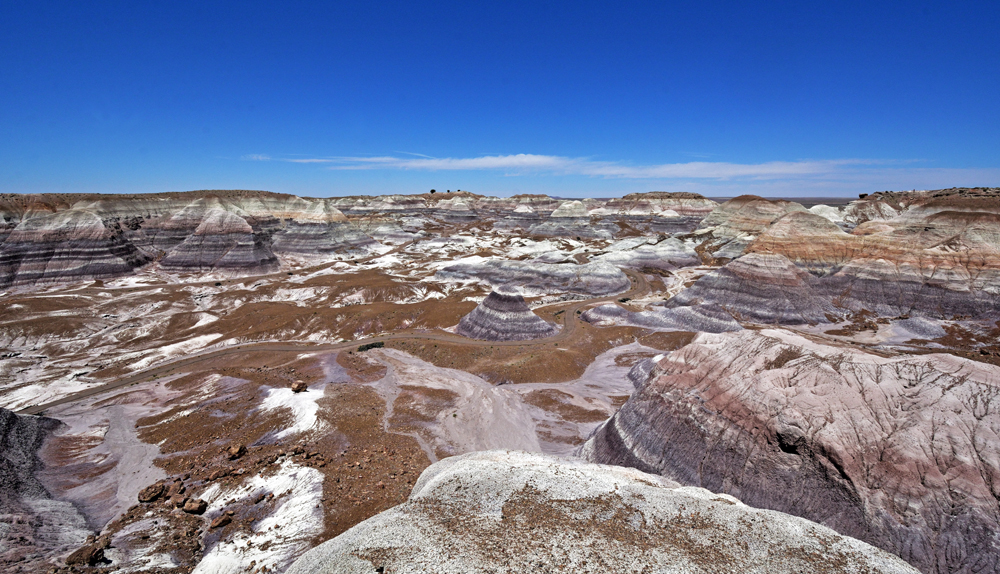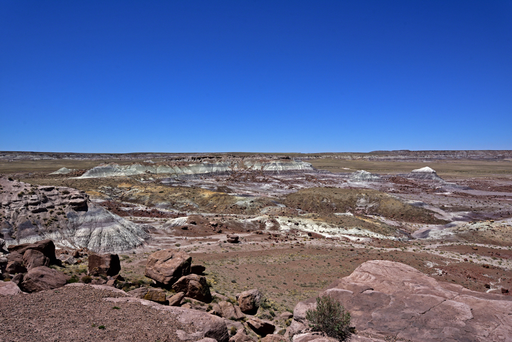 Punkt 8 Uhr öffnet sich das Tor und wir entdecken einen Tag lang diese surrealistische Gegend. Teils riesige Stämme und Stamm-Stücke liegen verstreut oder entlang alter Flussläufe konzentriert in einer farbenfrohen hügeligen Mondlandschaft; gleich nördlich an den Park schliesst sich ein geschütztes Stück Painted Desert, der «bemalte Wüste», an.