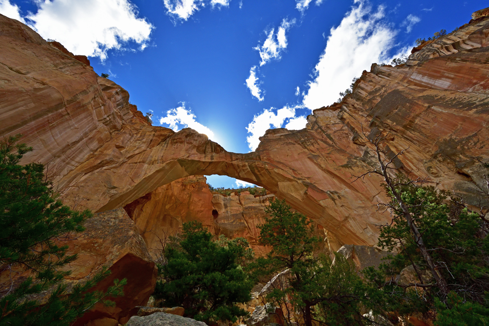 Auch am nächsten Tag scheint die Sonne und alles wirkt wie frisch gewaschen (was es ja auch ist…). Wir machen zunächst einen Abstecher zum etwas weiter südlich liegenden La Ventana Arch. Ich wage mich auf einem steilen Pfad bis fast direkt unter den Felsbogen, von wo ich durch dieses steinerne «Fenster» einen schönen Blick auf den Himmel habe.