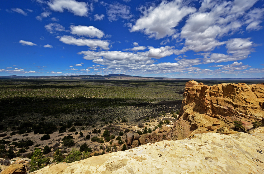 Kurz nach der Überquerung der Continental Divide (hier auf rund 2’400 m Höhe) gelangen wir zum «Land of Fire and Ice» – einer Eishöhle am Fuss des Bandera Vulkans. Dieser vor ca. 10’000 Jahren ausgebrochene Vulkan ist ebenfalls wieder Teil eines grösseren Vulkanfeldes und die ganze Gegend sieht entsprechend aus. Knorrige Wacholderbäume, Föhren und Ponderosa-Kiefen klammern sich in die aufgeworfenen schwarzen Lavaschollen und es sieht einfach „wild“ aus.
