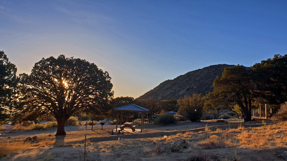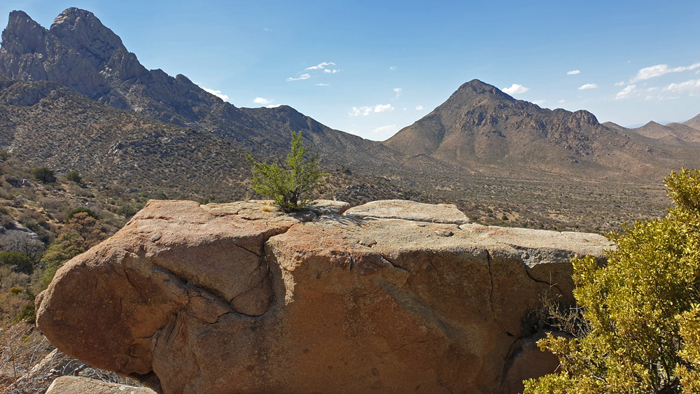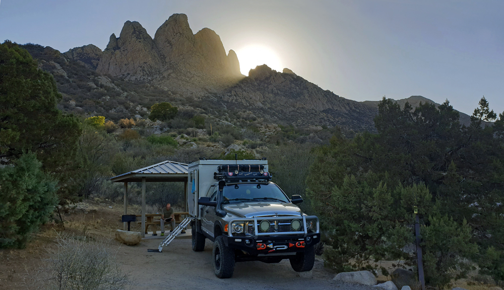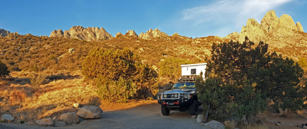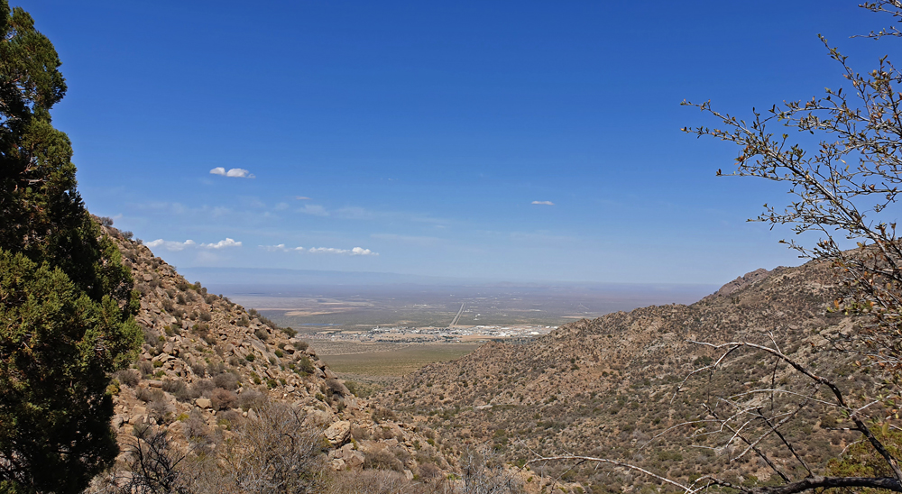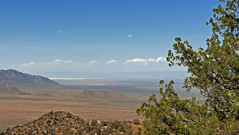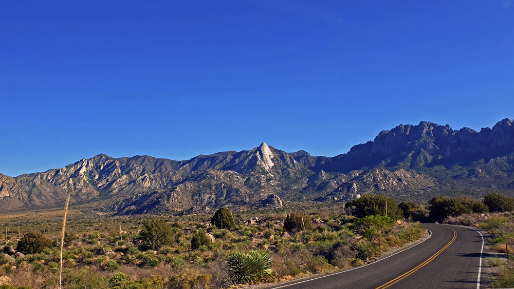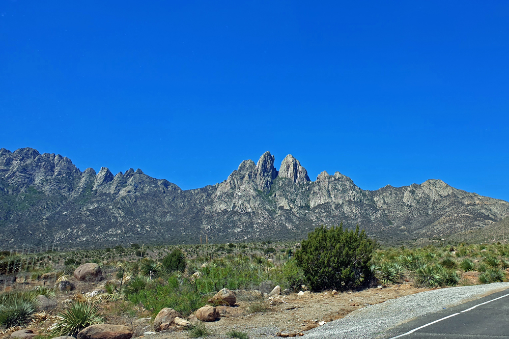 Wir folgen anschliessend auf der I-25 dem Verlauf des «Grossen Flusses» nach Las Cruces, vorbei an Reservoiren, Pecan-Plantagen und Orten mit interessanten Namen wie Socorro («Hilfe») oder «Truth or Consequences». In Las Cruces können wir unsere Vorräte wieder auffüllen und dann geht es zum Übernachten auf den BLM-Campground Aguirre Springs (Teil des Organ Mountains-Desert Peaks NM), wo man für 7 Dollar pro Nacht mit Blick auf die White Sands Missile Range und die Chihuaha Wüste im Tal unten übernachten kann. Die grössere Höhe macht auch die Temperaturen etwas angenehmer…