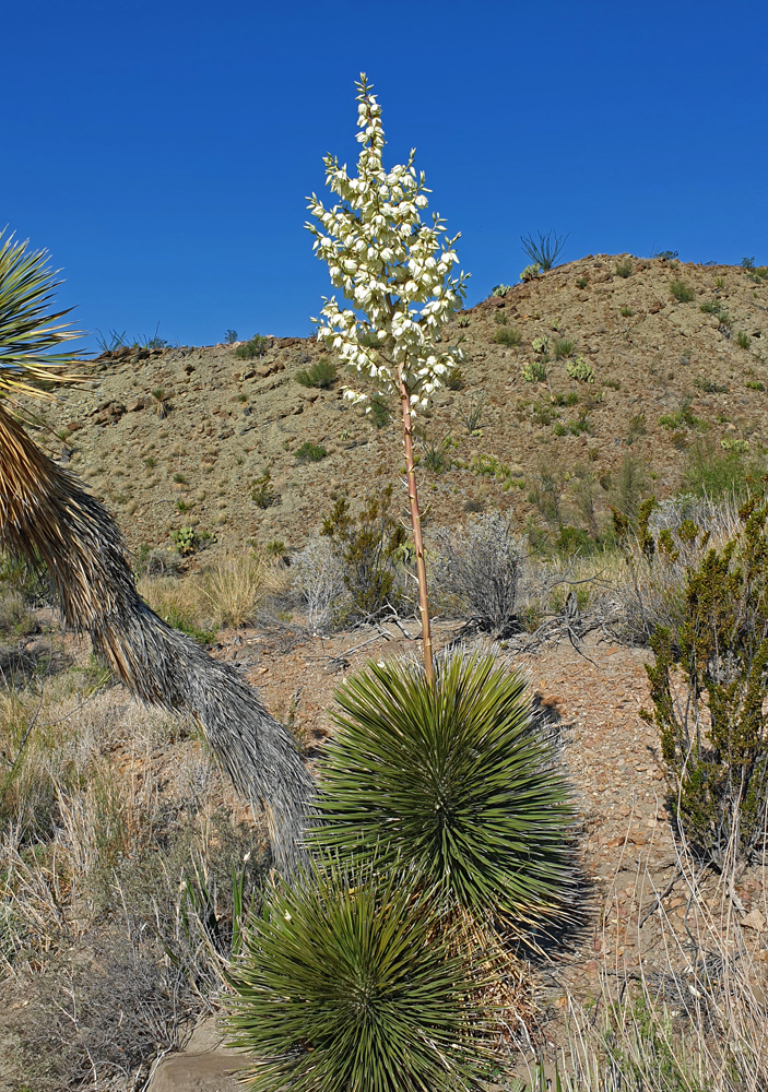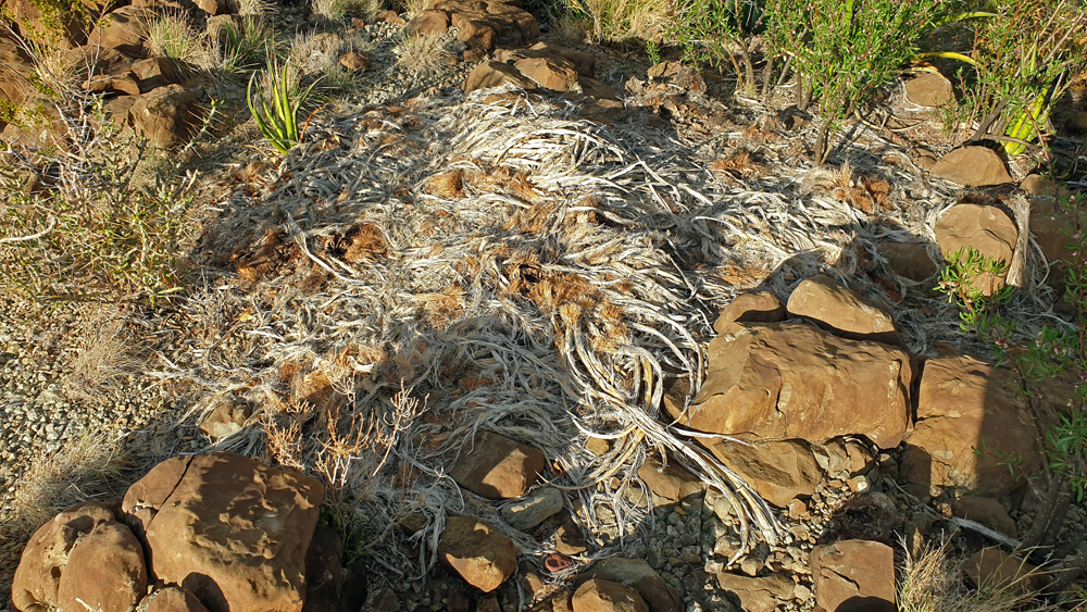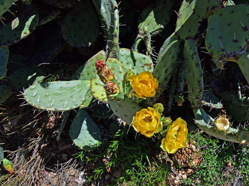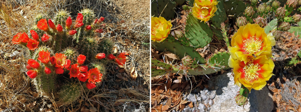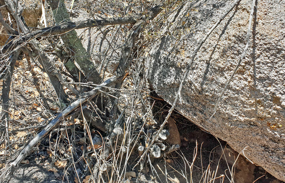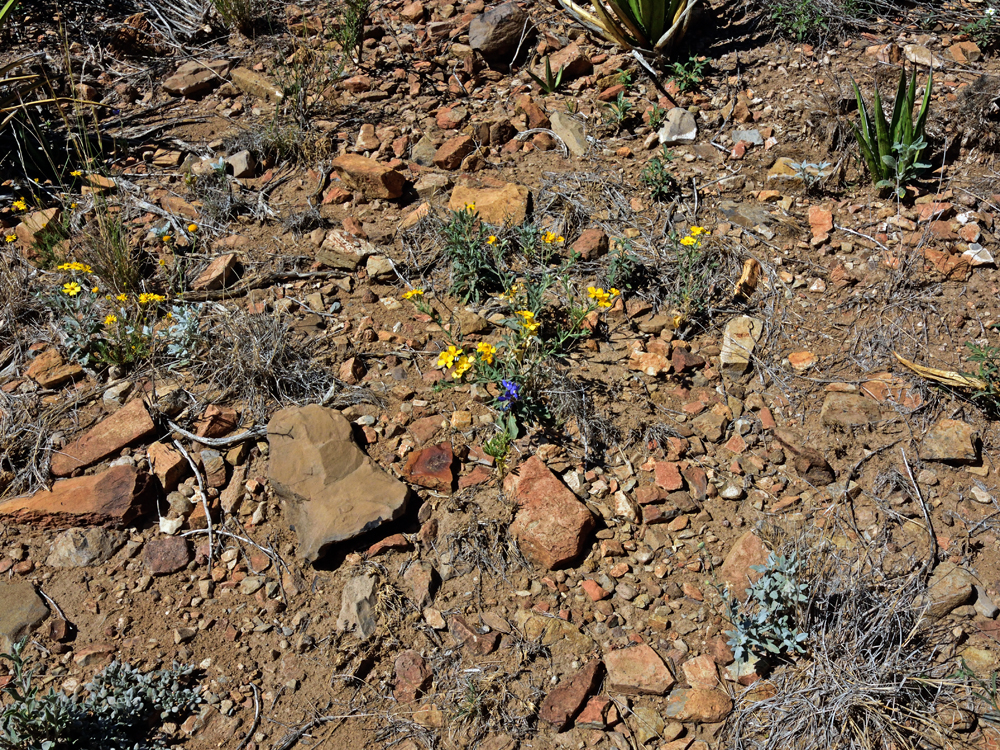 Die Plätze sind über eine grosse Fläche an den Flanken der Organ Mountains verteilt und es gefällt uns so gut hier, dass wir gleich 4 Nächte bleiben. Wir hören erstmals nach sehr langer Zeit am Morgen wieder Vögel singen und ich unternehme zwei schöne Dreistunden-Wanderungen in die umgebenden Berge (Ozy kann derweil endlich einmal unsere neue Liege ausprobieren…). Meine Wanderung führt mich über sukkulentenbestandene Berghänge und durch Eichen- und Föhrenhaine, vorbei an blühende Blumen und Kakteen. Als ich schwungvoll um eine Ecke biege, höre ich ein Geräusch, das wie die Mischung aus einem Bienenschwarm und Blätterrascheln klingt. Mehr instinktiv springe ich zurück und entdecke dann aus sicherer Entfernung eine Klapperschlange, die sich zu einem ärgerlichen Knoten zusammengezogen hat, weil ich sie beim Sonnen gestört habe… Mir klopft das Herz bis zum Hals und ich bin so auf die Schlange fixiert, dass ich ganz vergesse, zu fotografieren… Glücklicherweise entrollt sich das Tierchen aber wieder und steckt den Kopf ins angrenzende Gebüsch, so dass ich schnell an ihm vorbeihuschen und meinen Weg fortsetzen kann. Erst nachher wird mir bewusst, dass ich schon weiter unten an einer Klapperschlange vorbei gekommen sein muss, wo ich dieses Geräusch (viel leiser) gehört hatte und irgendwie nicht einordnen konnte…