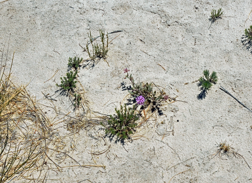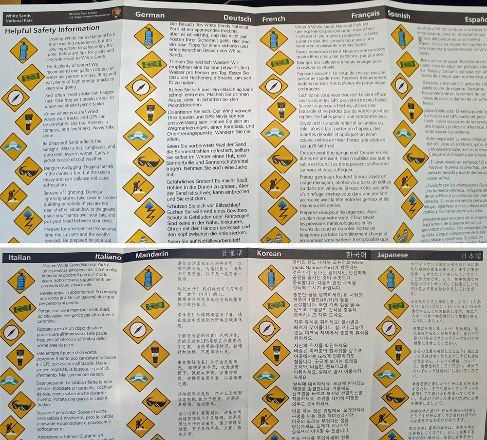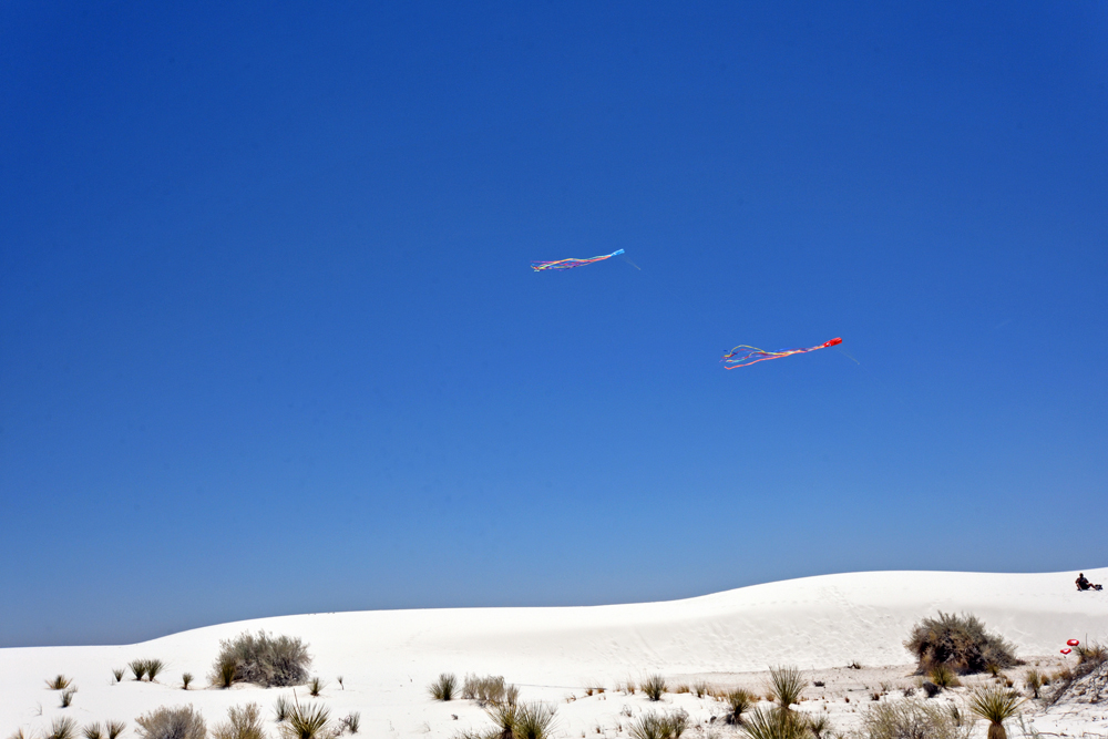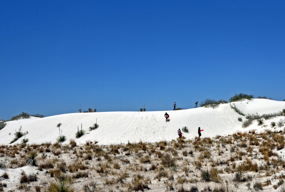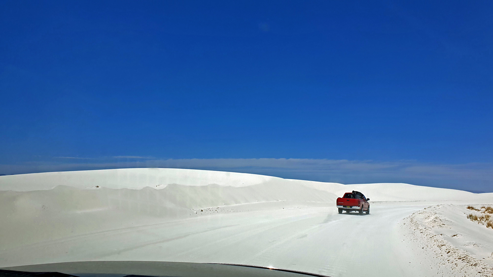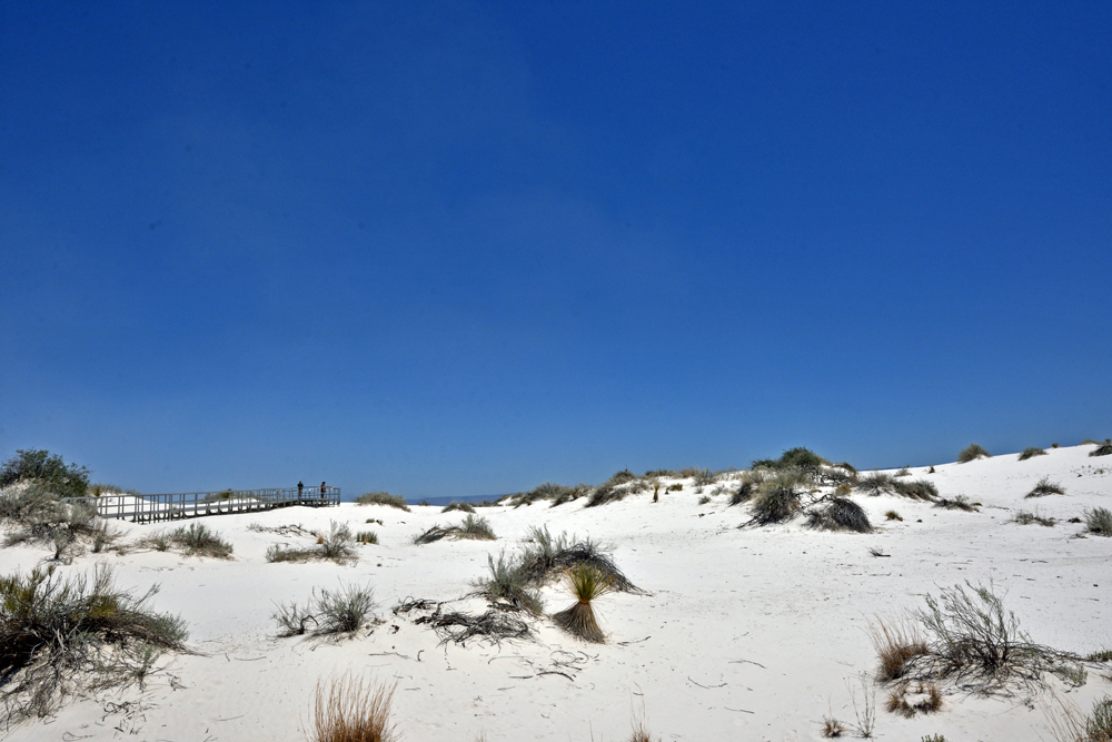 Wir sind immer noch nicht so von diesem Nationalpark überzeugt und fahren einfach mal auf dem grossen Loop weiter. Und plötzlich ist er da: der „imposante Ort mit weissen Sanddünen“! Die geteerte Strasse verschwindet unter dem Sand und im starken Wind, der die Körner quer darüber weht, ist ihr Verlauf kaum noch zu erkennen. Im hinteren Teil des Parks findet sich nur noch spärlicher Bewuchs in den Dünentälern und man kann frei die blendend weissen und glitzernden Sandberge erklimmen. (Auf Wunsch kann man mit gemieteten «Schlitten» auch wieder hinunterrutschen). Der Blick schweift über das mit über 700 km2 grösste Gipsdünenfeld der Welt und ich kann gut nachvollziehen, warum in 8 Sprachen davor gewarnt wird, sich unvorbereitet von der Strasse zu entfernen: die Fussspuren verschwinden wegen des stetig wehenden starken Windes fast sofort und die Täler und Dünen sehen irgendwie alle gleich aus. Dazu ist es auch noch sehr, sehr heiss… (wegen der ausgefallenen Besuche in der Missile Range und im Visitor Center sind wir nun natürlich punkt Zwölf in den Dünen unterwegs – super timing…).