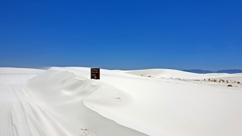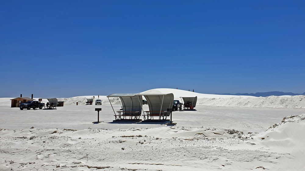 Da geht es halt direkt weiter zum White Sands Nationalpark. Dieser wird auf Google Maps als «imposanter Ort mit weissen Sanddünen» beschrieben. Von aussen macht die Sache allerdings nicht so viel her und den Besuch des Visitor Center schenken wir uns, da die in der prallen Sonne ausharrende Besucherschlange schon fast ums ganze Gebäude reicht (auch hier gibt es noch Einschränkungen wegen Covid…). Auf einem Boardwalk erfahren wir aber auch etwas über die Flora und Fauna, die in dieser unwirtlichen Gegen (über)lebt. Es ist schon erstaunlich, was sich die Natur immer wieder einfallen lässt!