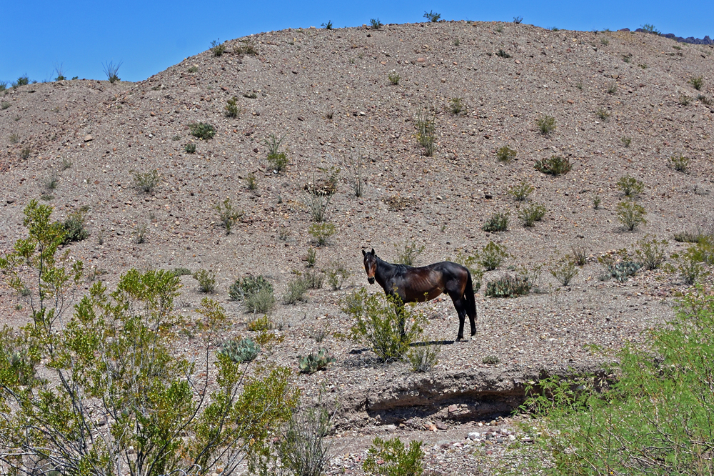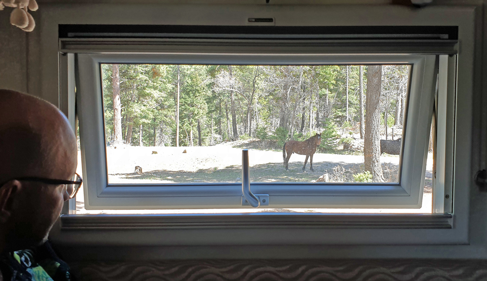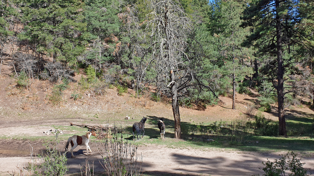Nun suchen wir aber Zuflucht im Lincoln National Forest. Vorbei am auf über 2’600 m hoch gelegenen Cloudcroft fahren wir in die wunderbar kühlen Sacramento Mountains. Es ist hier so schön kühl, dass wir auch gleich zwei Tage bleiben. Dabei können wir mehrere Familienverbände wilder Pferde beobachten. Ein Ranger, der längere Zeit mit uns schwatzt und sich sehr für den Camper interessiert, erzählt uns, dass diese Pferde bzw. ihre Vorfahren aus dem nahegelegenen Mescalero Apachen-Reservat ausgebüxt sind. Die Tiere sind tatsächlich stattlicher als ihre wilden Verwandten weiter im Westen und ich fühle mich sofort in meine Kindertage zurückversetzt. – Sieht nicht der schwarze Hengst, der seine Familie beschützt, genauso aus wie ich mir Iltschi oder Hatatitla vorgestellt habe? Jetzt fehlt nur noch, dass Winnetou oder zumindest Old Shatterhand zwischen den Bäumen auftaucht! Aber halt, das wird wohl eher nicht geschehen, da diese Figuren hier in den USA so gut wie unbekannt sind.