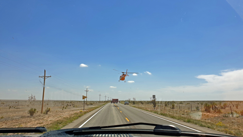 Wenig später landet der Heli auf der Strasse und es werden Bahren und eine Person umgeladen. Ganz kommen wir nicht draus und wir versuchen uns einen Reim auf das Manöver zu machen. Das Werweissen wird aber abrupt beendet, als der Sheriff mit sehr grimmigem Gesicht auf uns zu gestapft kommt. Er meint, dass er uns jetzt ganz viele Bussen für diverse bundesstaatliche Übertretungen ausstellen müsse, da es strengstens verboten sei, an einem «Road Block» vorbeizufahren.