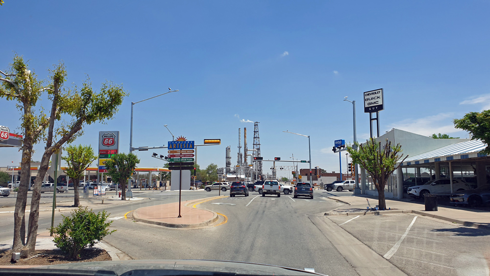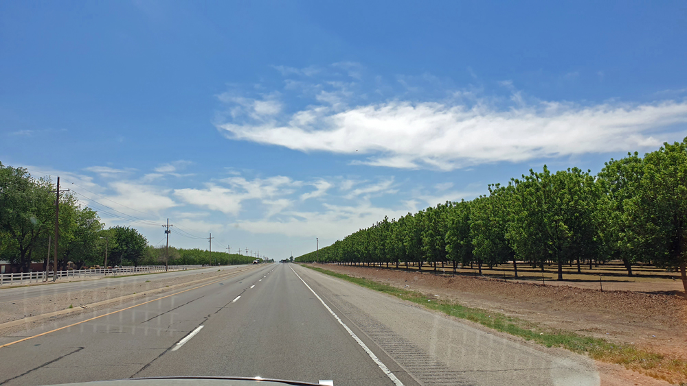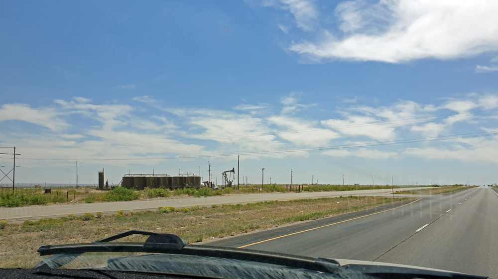 Immer noch mit einem gehörigen Schrecken in den Gliedern fahren wir weiter. Hier sind wir im Öl- und Gas-Country angekommen. Überall stehen Derriks und Vorratstanks, brennen Gasflammen, winden sich Pipelines durch die Gegend und es biegen von allen Seiten grosse Tanklastwagen in die Hauptstrasse ein. Der Pecos River wird natürlich auch hier zur Bewässerung genutzt und so können sich die Augen zwischendurch durch einen Blick auf grüne Pecan-Plantagen erholen.