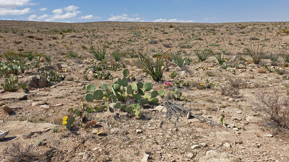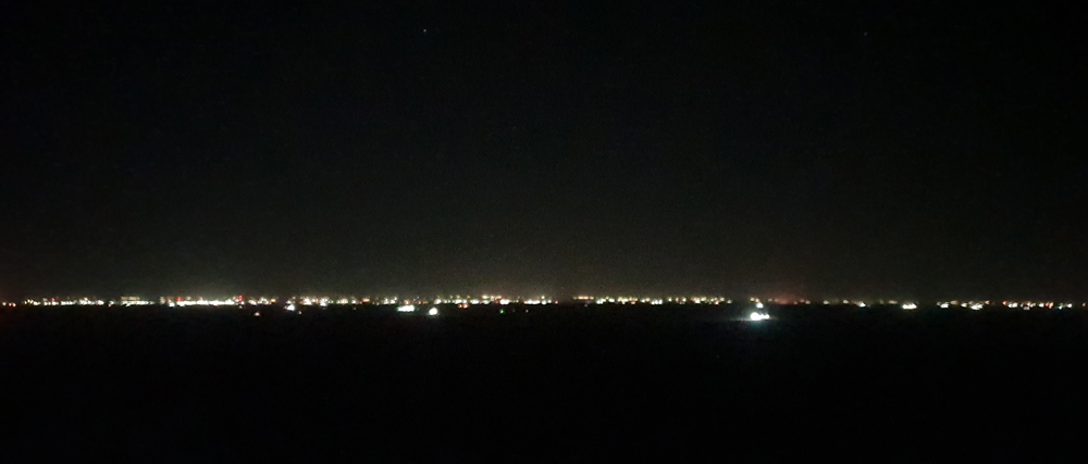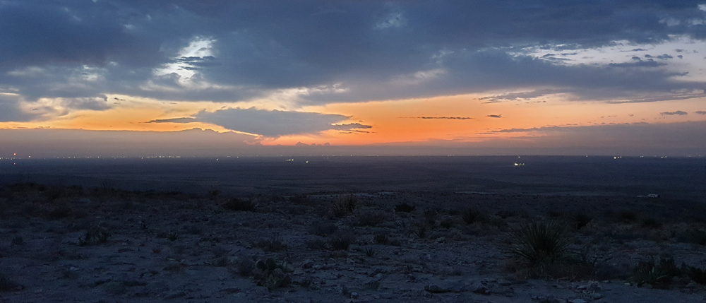 Wir übernachten auf Public Land in der Nähe der Carlsbad Caverns und von unserem erhöhten Stellplatz haben wir einen guten Blick auf die leer wirkende Ebene unter uns. Hier, auf dem erhöhten, karstigen Untergrund, treffen wir wieder auf diverse blühende Büsche und Sukkulenten. Als es dunkel wird, wandelt sich da Bild grundlegend und es sieht aus, als ob wir am Rande einer Grossstadt geparkt hätten!