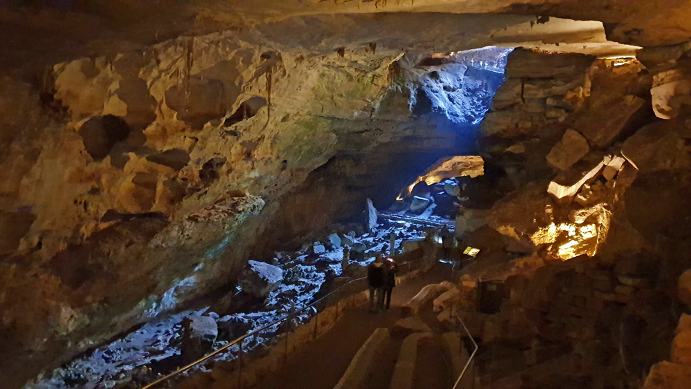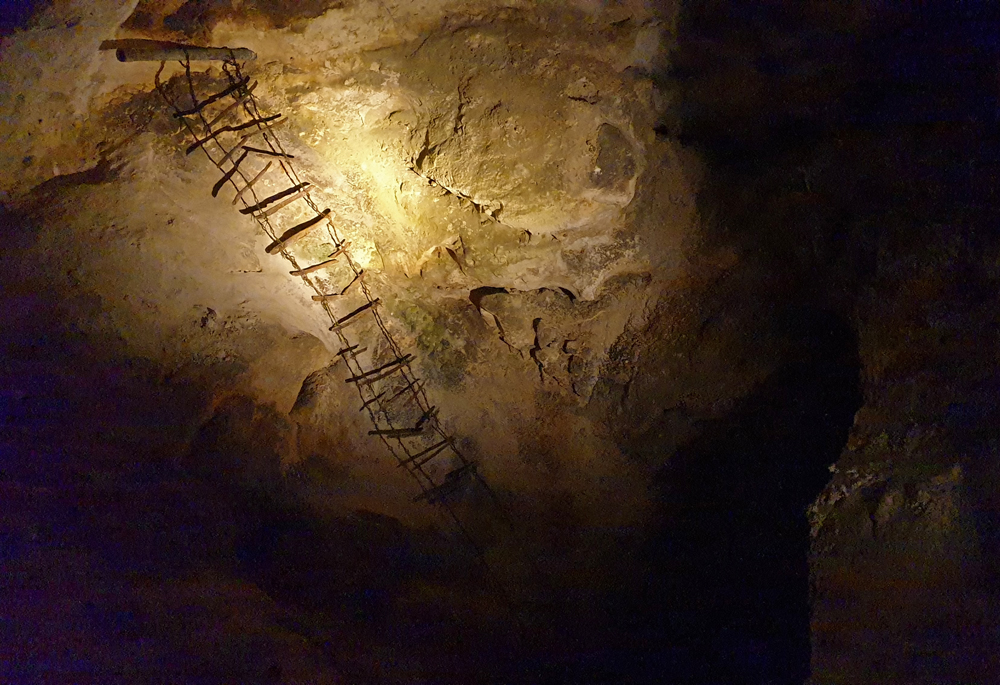 Wir waren auf unserer dreimonatigen Reise im Herbst 2015 bereits schon einmal hier. Damals kamen wir aber erst am Nachmittag an, so dass wir nur mit dem Lift hinunter durften und der hintere Teil der Kavernen bereits gesperrt war. Dieses Mal sind wir natürlich rechtzeitig und können uns auf den laaaaaangen Fussweg nach unten machen. Es ist extrem beeindruckend, dass es erst einmal eine Stunde in Serpentinen und auf gewundenen Pfaden in die Tiefe geht, bis man die eigentliche Höhle erreicht. Es ist draussen wie drinnen sehr feucht und an einer Stelle schreiten wir durch einen richtigen Nebel. Diese Feuchtigkeit stellt sich als gewisses Problem heraus: Nicht nur schwitzen wir «wie die Rösser», sondern wir sehen auch nichts, da unsere Brillen beschlagen. – Hier gilt nämlich Maskenpflicht, da «Innenraum»! (Wir sind ja schon froh, dass wir überhaupt hinein dürfen!). Wir behelfen uns dann – wie alle anderen Brillenträger auch – mit Maske über dem Mund und Nase in der Luft, da wir die Gefahr, abzustürzen als wesentlich höher einschätzen, als Covid zu bekommen…