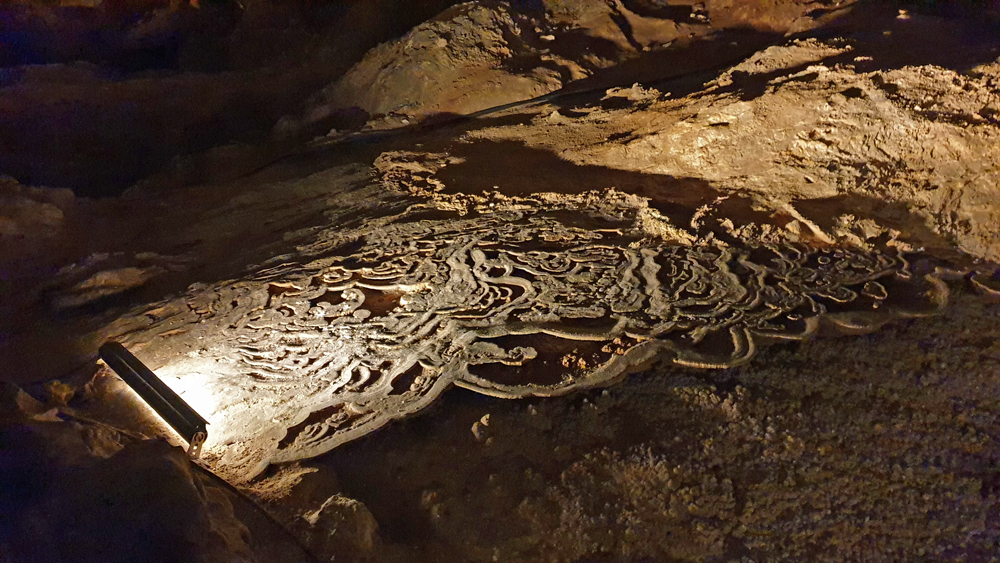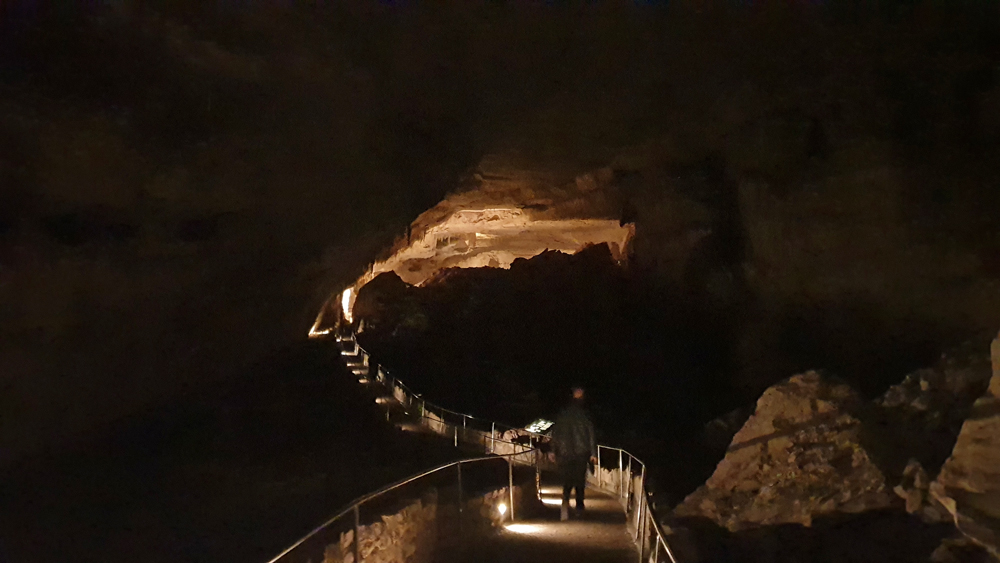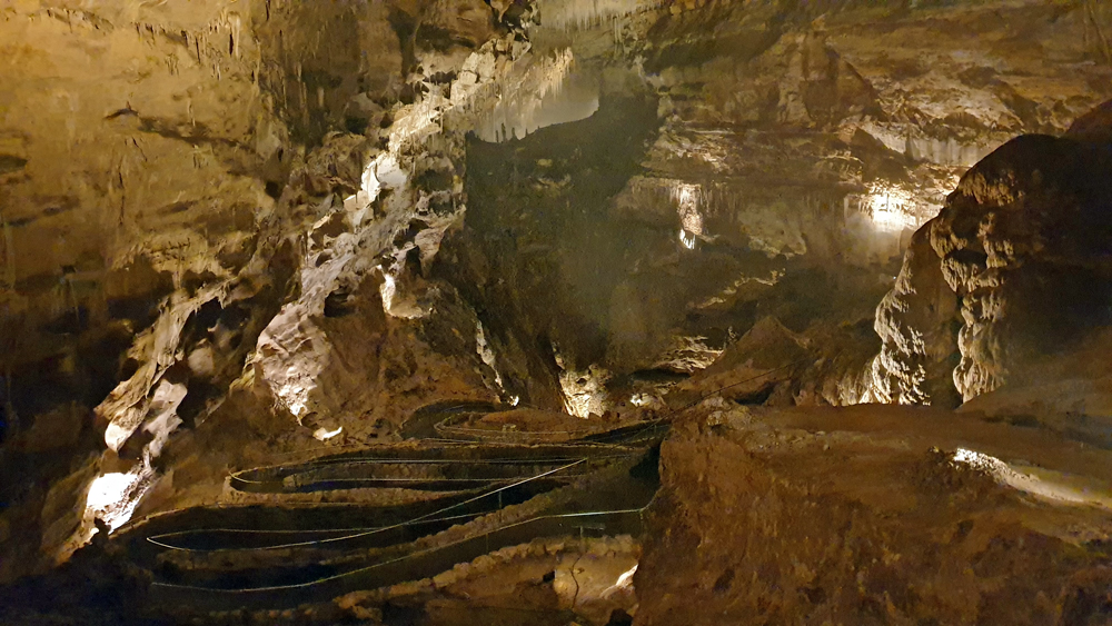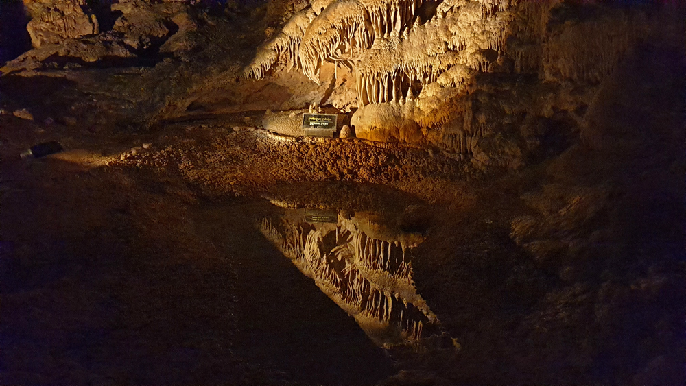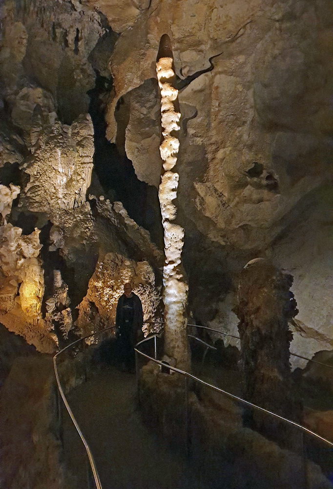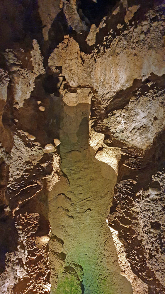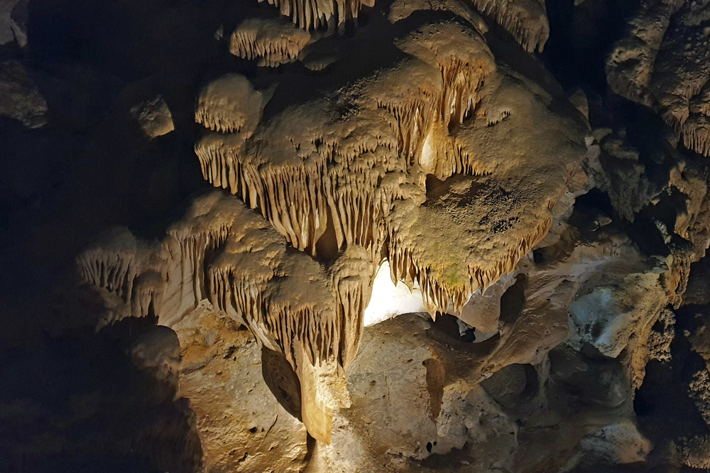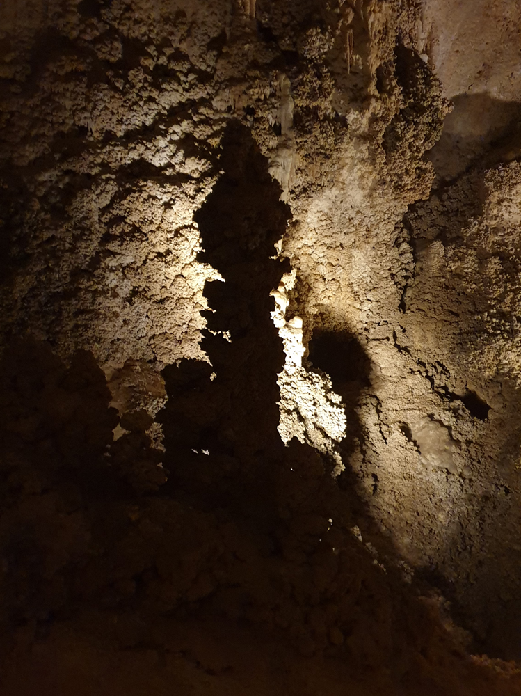Die nächsten zwei Stunden gehen wir den Rundgang durch die gesamte Kaverne. Leider ist der grösste Teil der Höhle (schon Jahrhunderte) trocken, aber die Späleotheme sind auch so sehr beeindruckend. Viele Flächen sind mit «Popcorn» überzogen, kleinen Mineralkügelchen, die durch Spritzer entstanden sind, was grossen Teilen der Höhle ein geradezu «barockes» Aussehen gibt. Für den Weg nach oben nehmen wir den Lift, weil wir schon wieder zu spät für den Aufstieg sind (und natürlich nuuuur darum… 😉 )