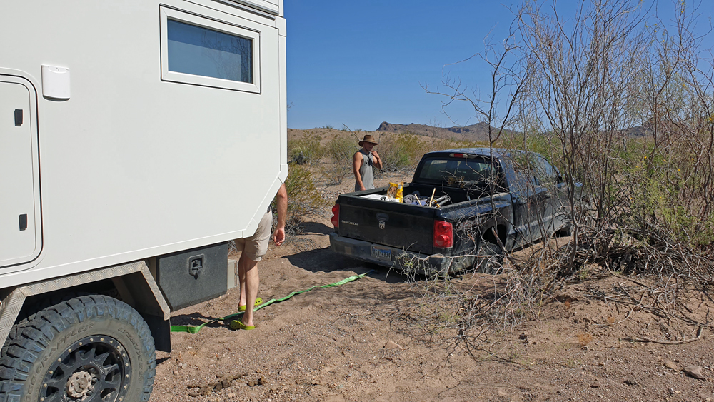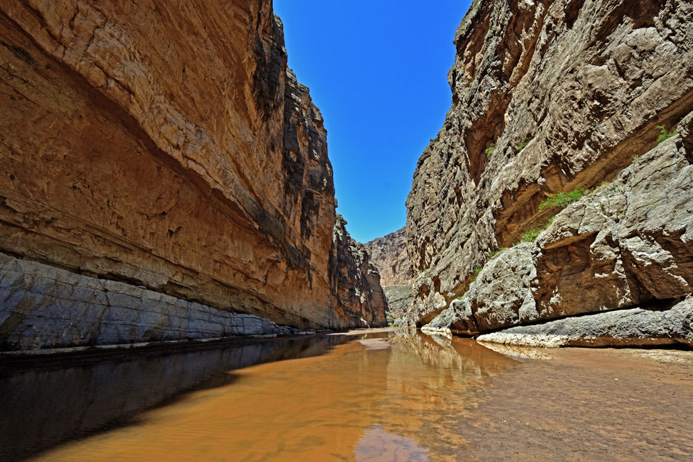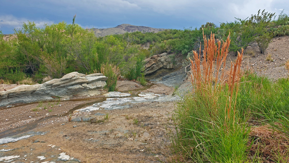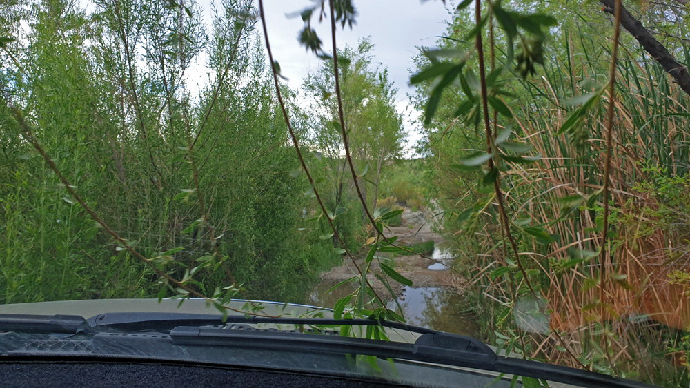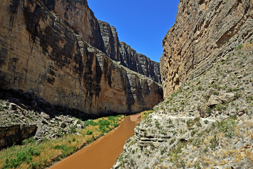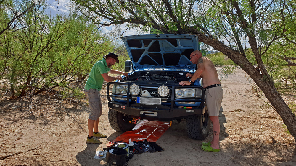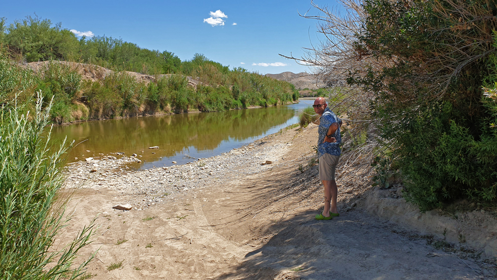 Immerhin können wir – was wir in zwei Jahren noch nie hatten – gestrandete Menschen retten. Und zwar gleich an zwei Tagen: zuerst treffen wir auf Simone und Björn aus Deutschland mit ihrem himmelblauen Toyota Landcruiser (www.2machenblau.de), die uns freudig zuwinken, als wir auf einem Strässchen in Richtung Rio Grande fahren in der vergeblichen Hoffnung, endlich mal den Fluss zu sehen. Es stellt sich heraus, dass sie sich nicht speziell über uns freuen, sondern darüber, dass überhaupt Menschen den Weg zu diesem versteckten und ein Stück von der sowieso wenig befahrenen River Road West-Piste entfernten Platz gefunden haben. Ihr Auto springt nämlich nicht mehr an! Nach einem ersten erfolgreichen Überbrückungsversuch parkieren wir uns alle in Richtung Schatten um (es ist deutlich über 30 Grad) und Ozy und Björn versuchen, das Problem zu lokalisieren. Nachdem Björn mit Hilfe von einigen von Ozys Werkzeugen die Kabel revidiert hat, stellt sich heraus, dass eine der beiden Batterien gestorben ist. Wir schlagen den beiden vor, diesen Abend Pause zu machen und erst morgen nach Alpine zu fahren, um dort eine neue zu besorgen. Da es eh schon recht spät am Nachmittag ist, lassen sie sich überreden und wir verbringen noch einen gemütlichen Abend mit Grillen, Schwatzen und dem Bewundern des buchstäblichen Blitzlichtgewitters in den umliegenden Wolkenbänken. Am nächsten Morgen wird wieder überbrückt und wir fahren zusammen auf der rumpligen River Road Richtung 30 km entfernte Teerstrasse. Auf halbem Weg treffen wir einen Fussgänger, der fast kein Wasser mehr hat. Sein Auto ist gestrandet und er hat versucht, zu Fuss zur Hauptstrasse zu kommen. Während Simone und Björn ihren Weg fortsetzen, wenden wir und fahren mit ihm zurück. Es stellt sich heraus, dass das Auto unweit von unserem Übernachtungsplatz und nicht weit von der Strasse steckengeblieben ist und wir direkt am von dichtem Gebüsch verborgenen Fahrzeug vorbeigefahren sind! Wenn er an der Strasse gewartet oder sein Kollege nicht geschlafen hätte (buchstäblich), hätten wir es auf dem Weg befreien können und damit viel Zeit gespart. Oh, well. Wir hängen den Pickup an und ziehen ihn aus dem weichen Sand im Bachbett, in das sie versehentlich falsch abgebogen waren. Wieder wenden und diesmal schaffen wir es bis zur Teerstrasse und weiter bis zum Santa Elena Canyon. Obwohl es durch das ganze Hin und Her jetzt Mittag und wieder deutlich über 30 Grad ist, lasse ich es mir nicht nehmen, den Trail in den Canyon hineinzulaufen. Im Fluss stehe ich direkt auf der Grenze zwischen den USA und Mexiko. Ozy hält derweil die Stellung und sorgt dafür, dass das Auto bei meiner Rückkehr schön kühl ist.