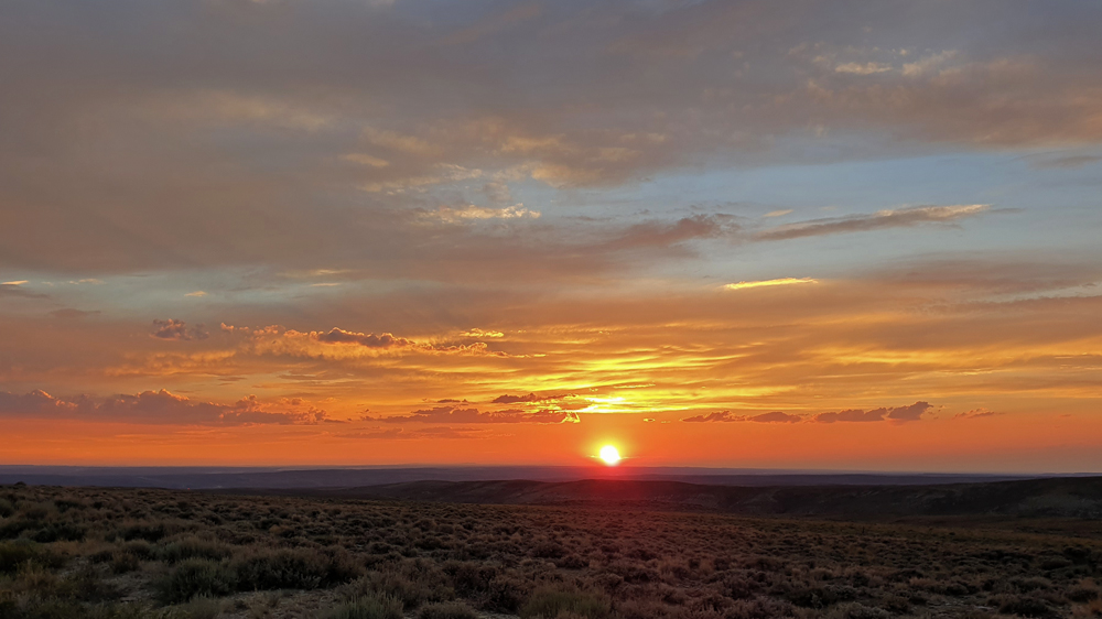 Die I-80 führt uns weiter über Gebirgszüge und Hochebenen bis Green River, WY. Hier hatte Ozy schon im Jahr 2019 übernachtet und auch wir schlagen auf dem mesa-förmigen White Mountain unser Lager auf. Das Licht hier ist ganz speziell und wir geniessen die grandiosen Sonnenauf- und untergänge und den atemberaubenden Blick über das farbige Tal. (Das Foto, das Ozy im 2019 von unserem Auto gemacht hat, wurde sogar in den TDR Calendar 2020 aufgenommen!). Es ist so schön, dass wir uns entschliessen, noch eine Nacht zu bleiben. Eine Entscheidung, die ich bereue, als ein heftiges ein Gewitter aufzieht. Ich weiss nicht, was Ozy durch den Kopf geht, aber zumindest mir ist es zuäusserst auf dem hohen Hügelsporn inmitten tosender Sturmböen, niederfahrender Blitze und am Auto abprasselndem Sand nicht mehr ganz so wohl…