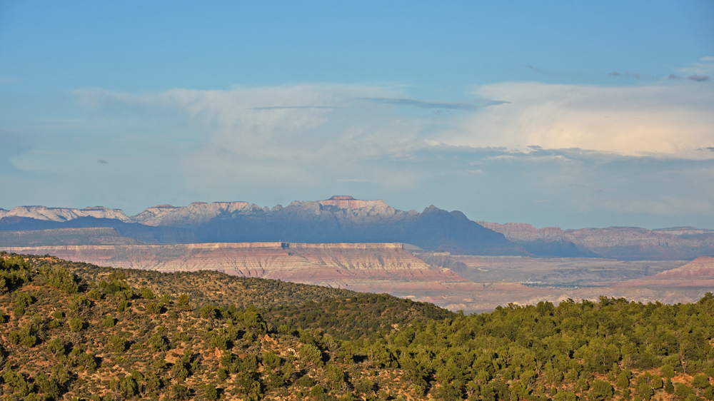 Nach dem langen Fahrtag gestern geht es heute nur bis ins gut 200 km entfernte St. George, wo wir auf dem auf rund 1’800 m gelegenen Oak Grove Campground (Dixie National Forest) übernachten wollen. Leider sind Strasse und Campground wegen extremer Feuergefahr gesperrt, doch finden wir nach einigem Suchen in der Umgebung ein Plätzchen mit schöner Aussicht.