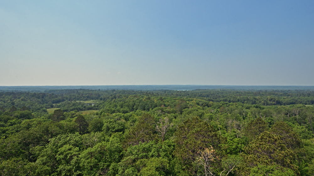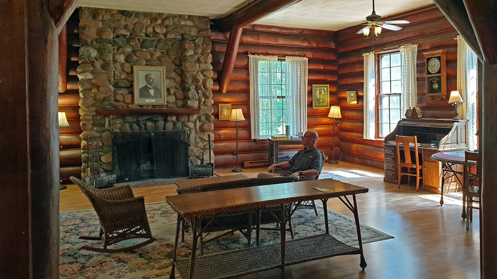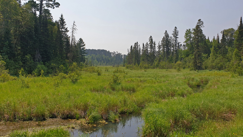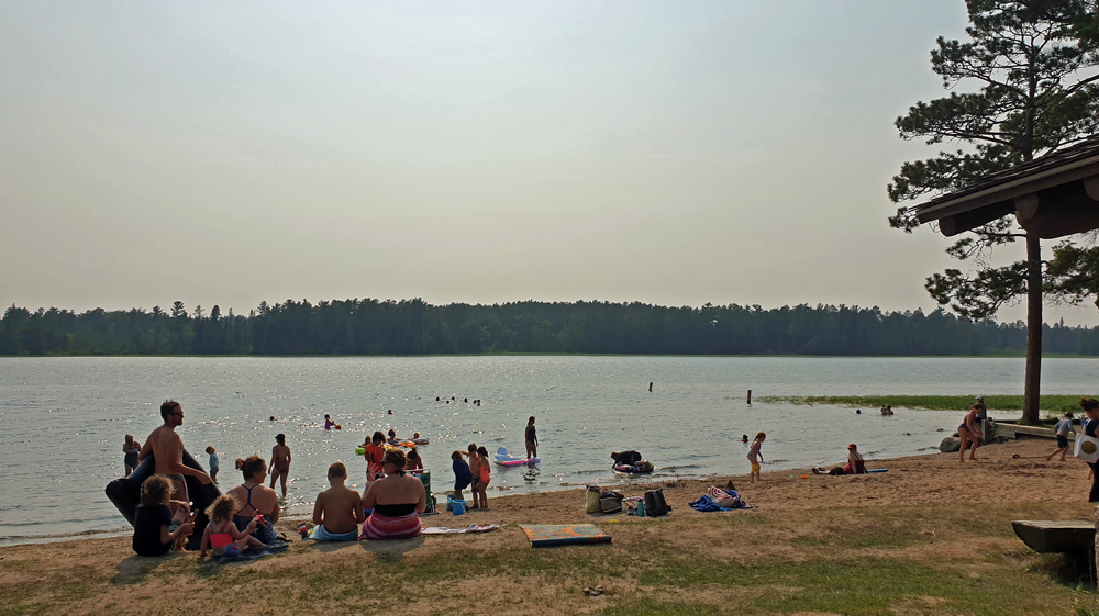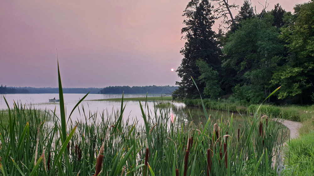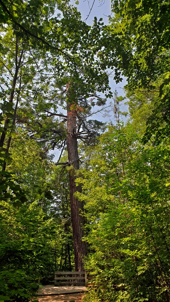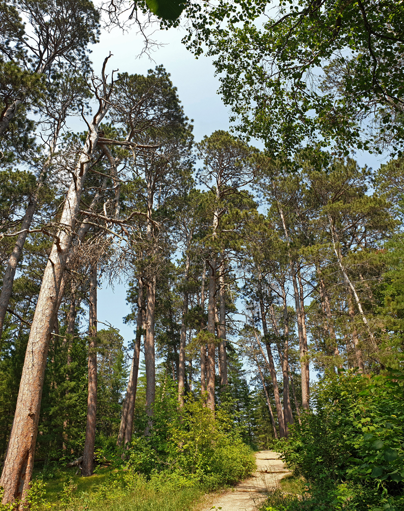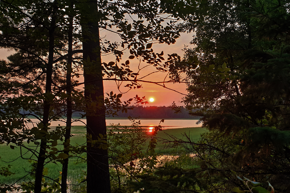 Schon seit zwei Tagen ist der Himmel sehr trübe. Über allem liegt ein dicker Haze (Dunstschleier), der von den Waldbränden im benachbarten Kanada herüberzieht. Dies sorgt für eine seltsame Lichtstimmung und rote Sonnenuntergänge, die man aufgrund der stark bewachsenen Seeufer gerade so erahnen kann. Wir besuchen zuerst das Visitor Center mit Museum, bevor wir den Wilderness Drive fahren, der in einem grossen Bogen um den See führt. Von diesem aus kann man immer wieder Trails zu verschiedenen Themen und Sehenswürdigkeiten laufen und wir besuchen unter anderem die (ehemals) grössten Rot- und Weymouth-Kiefern, (vom Wald völlig überwachsene und damit unsichtbare) Indianische Grabhügel, den Afton Heights Feuerausguck, die historische Douglas Lodge und die Old Timer’s Cabin aus nur 4 mächtigen Stämmen. Dabei sehen wir Loons, diverse Schmetterlinge, Frösche und Wachteln, die immer wieder verschreckt über die Strasse rennen. Ozy fährt von der Lodge zum Campground und bezieht die neue Site, während ich entlang des östlichen Arms des Lake Itasca durch den Primärwald zurückwandere (der Hauptgrund für die Einrichtung des State Parks. Heute schützt der Park 25% des noch in Minnesota vorhandenen primären Kiefernbestandes).