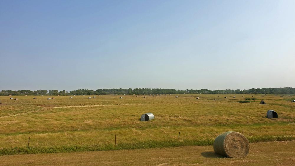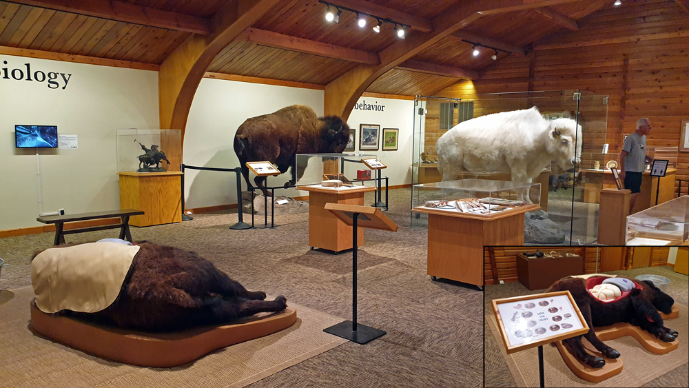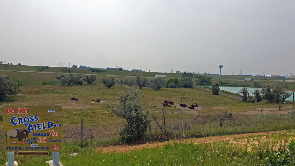 Bei 18 Grad und Nieselregen (hatten wir ein Wetterglück übers Wochenende!) geht es auf Nebenstrassen durch eine schwach besiedelte Gegend. Durch Wälder und vorbei an Sümpfen und Seen fahren wir nach Südwesten, bis wir bei Detroit Lakes auf die US-10 stossen, die uns direkt nach Westen führt. Hier befindet sich auch die Grenze zwischen dem stark bewaldeten und dem weiten, rollenden, mit einigen Gewässern durchzogenen und fast ausschliesslich landwirtschaftlich genutzten Land. Bei Fargo (im Sommer viel freundlicher als im Winter… 😉 ), das direkt hinter der Grenze in North Dakota liegt, fahren wir auf die I-94, die uns noch zügiger Richtung Westen bringt. Auf dem Weg machen wir einen kleinen Abstecher zum National Buffalo Museum in Jamestown, ND, wo es neben einer kleinen, aber feinen Ausstellung auch ein paar echte Bisons zu sehen gibt. Auch «The Worlds Largest Buffalo Monument» befindet sich in der Nähe (wir beschränken uns jedoch darauf, die Skulptur aus der Ferne zu bewundern).