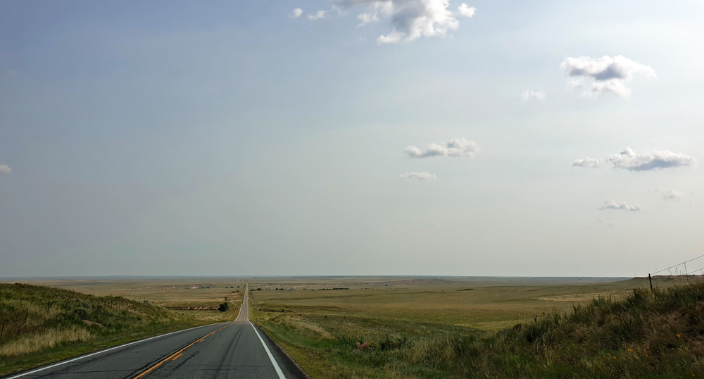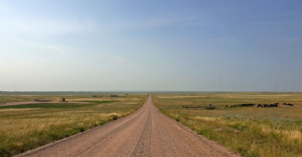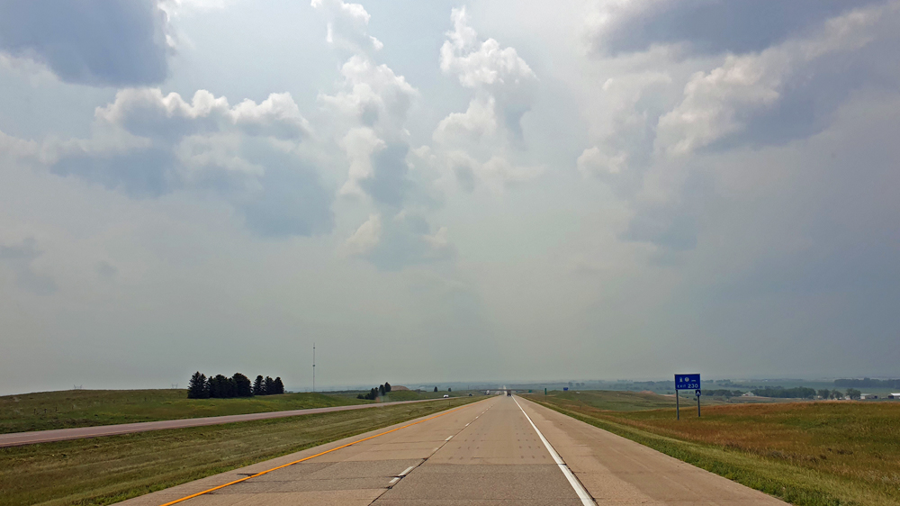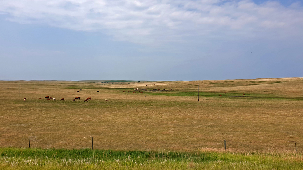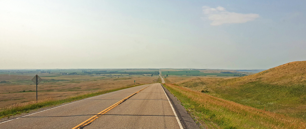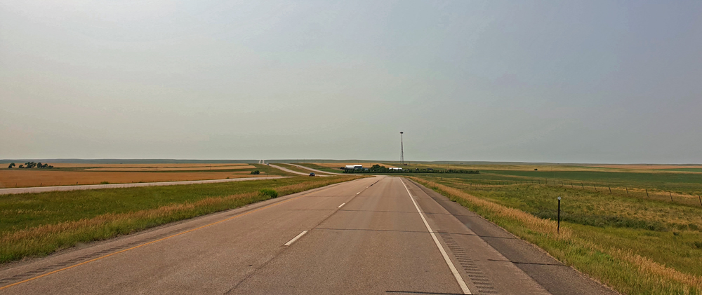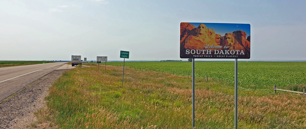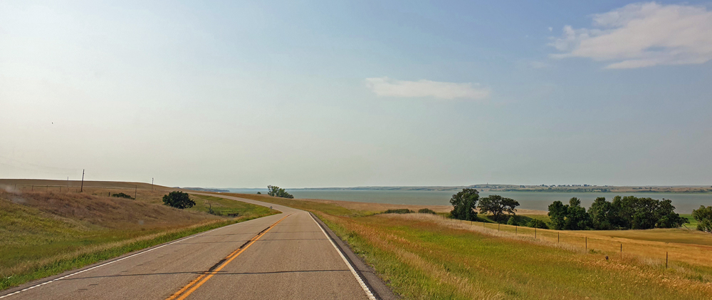 Also ab nach Süden! Wir folgen dem Missouri auf der Staatsstrasse 1804 und lassen die Meilen unter uns durchziehen. Weizenfelder wechseln sich ab mit Mais und Weideland und immer wieder erblicken wir den zum Lake Oahe aufgestauten Fluss. Wir hatten vorher noch nie von diesem See gehört, aber mit 372 km Länge und 1500 km2 Oberfläche ist er nach Lake Mead, Lake Powell und Lake Sakakawea (in Zentral-North Dakota gestauter Missouri) offenbar das viertgrösste Reservoir der USA. Nach etwa 100 km überqueren wir die Grenze zu South Dakota. Wir steigen aus, um die Tafeln zu fotografieren – und werden fast weggeweht! Ein starker Wind bläst uns entgegen und lässt die nahen Getreidefelder wie einen gelbgrünen See mit Wellengang erscheinen.