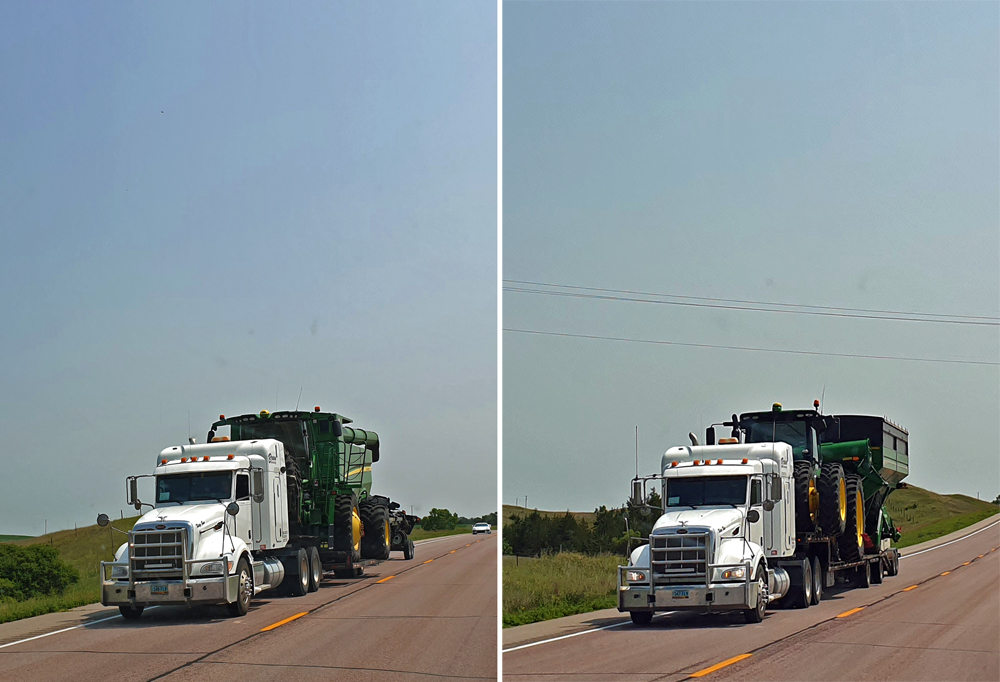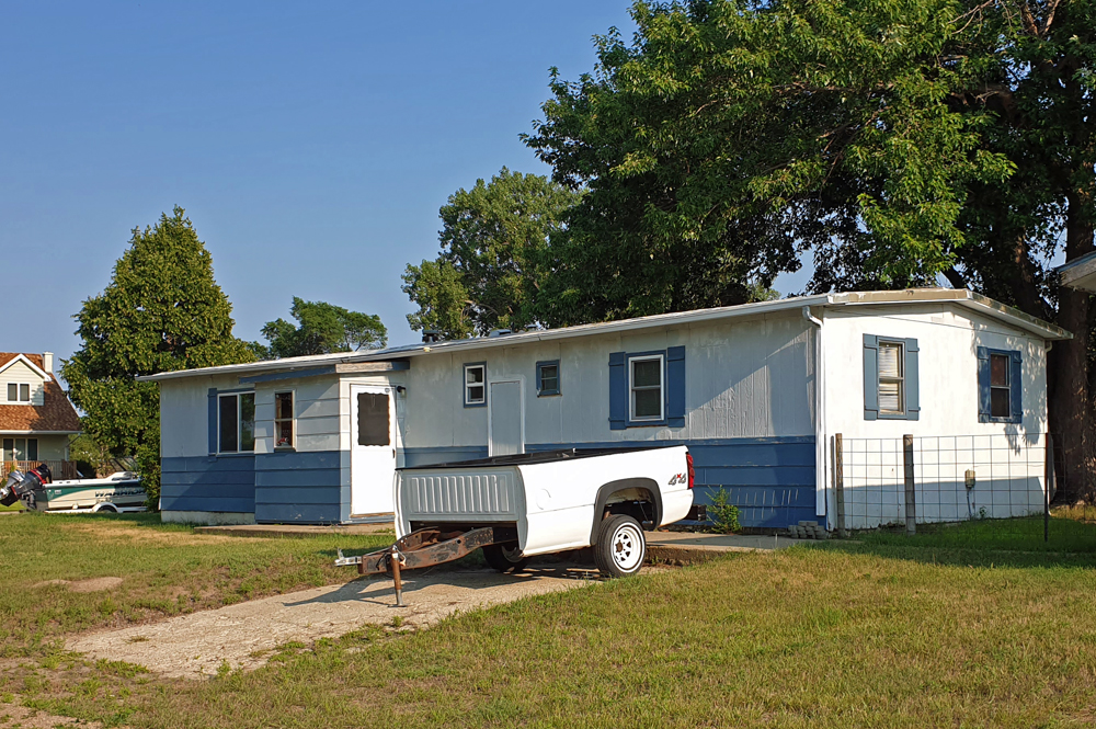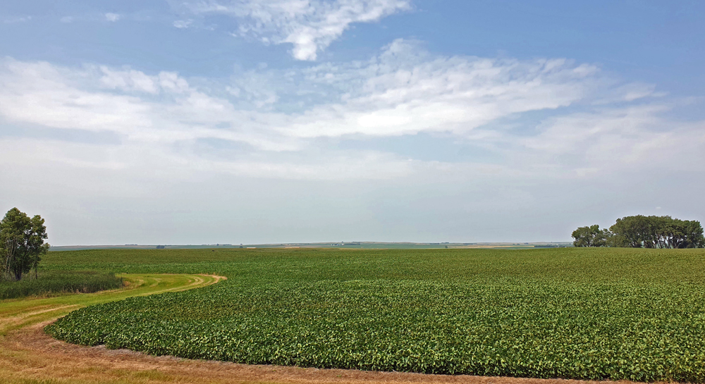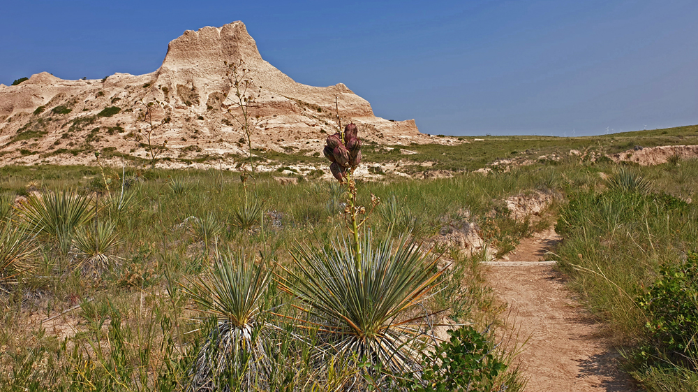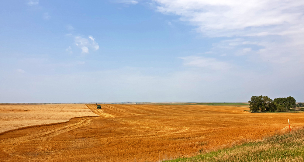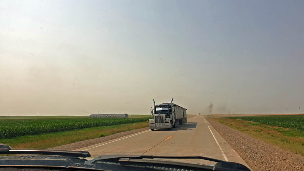 Also ab nach Süden! Wir folgen dem Missouri auf der Staatsstrasse 1804 und lassen die Meilen unter uns durchziehen. Weizenfelder wechseln sich ab mit Mais und Weideland und immer wieder erblicken wir den zum Lake Oahe aufgestauten Fluss. Wir hatten vorher noch nie von diesem See gehört, aber mit 372 km Länge und 1500 km2 Oberfläche ist er nach Lake Mead, Lake Powell und Lake Sakakawea (in Zentral-North Dakota gestauter Missouri) offenbar das viertgrösste Reservoir der USA. Nach etwa 100 km überqueren wir die Grenze zu South Dakota. Wir steigen aus, um die Tafeln zu fotografieren – und werden fast weggeweht! Ein starker Wind bläst uns entgegen und lässt die nahen Getreidefelder wie einen gelbgrünen See mit Wellengang erscheinen.