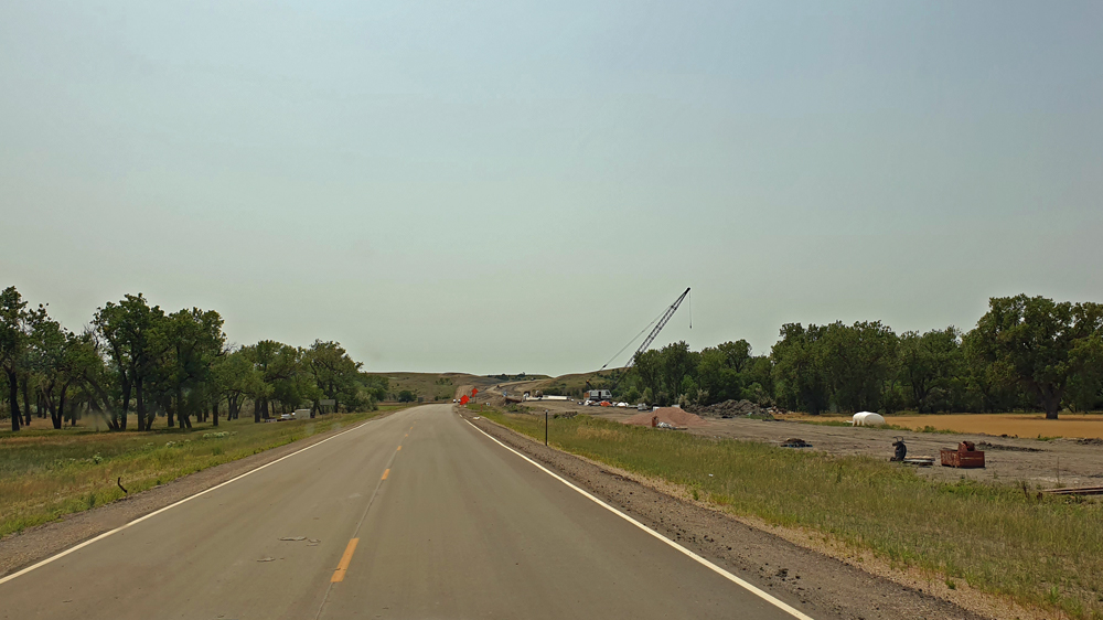 In Pierre, SD sehen wir den Missouri, der hier nach Südosten abbiegt, vorläufig zum letzten Mal. Wir behalten den Südkurs bei und folgen der US-83, die uns zunächst durch die Fort Pierre National Grasslands führt – das Prärie-Äquivalent zum National Forest. Südlich der I-90 sehen wir beim Vorbeifahren plötzlich eine Leuchttafel, dass die Strasse gesperrt sei oder so (es ging ein bisschen schnell…). Wir beschliessen, einfach mal zu schauen, und gelangen tatsächlich irgendwann an eine Baustelle, wo eine Brücke und ein Stück Strasse ersetzt werden. Und die Strasse komplett gesperrt ist…