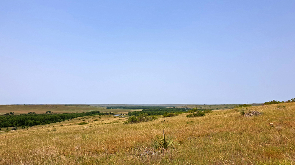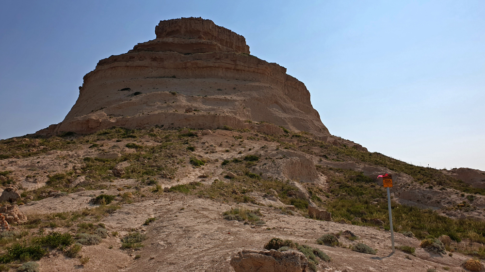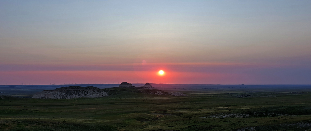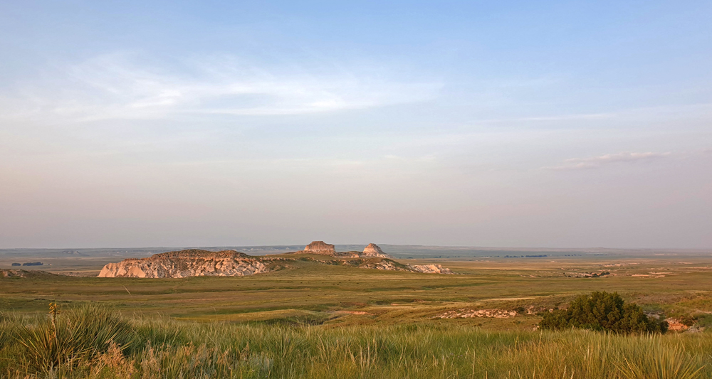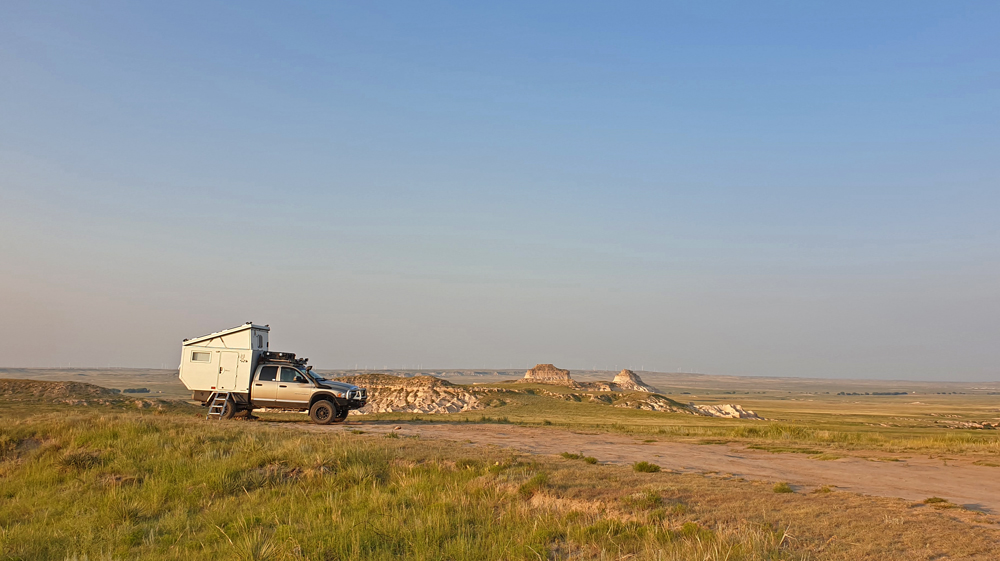 Ab hier folgen wir so ungefähr der Strecke, die Ozy im Herbst 2019 während seines Roadtrips befahren hatte. Damals hatte es Ozy sehr gut in den Pawnee National Grasslands gefallen (in Nord-Colorado gelegen) und auch wir bleiben mit herrlicher Aussicht gleich 2 Tage stehen. Es ist heiss, aber da wir hier keine Nachbarn haben, können wir den Generator zum Glück immer wieder laufen lassen. Trotz der sommerlichen Temperaturen unternehme ich eine schöne Wanderung zu den Pawnee Buttes, die gerade so am Rand des National Grassland stehen bzw. als Einzelmonument geschützt sind.