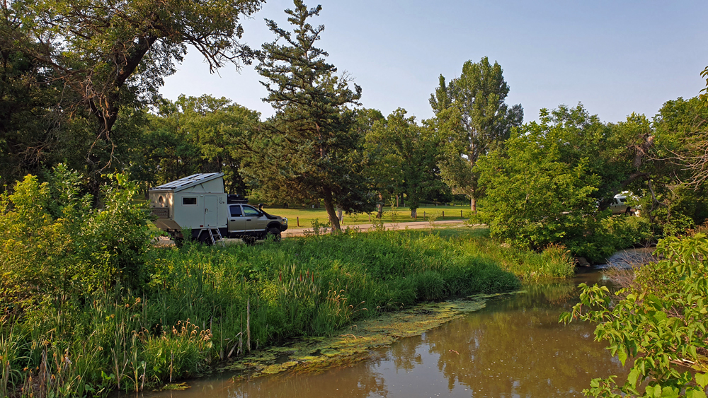 Wir freuen uns, dass wir wieder im ehemaligen Neuland westlich des Mississippi unterwegs sind, denn es wird wieder einfacher, einen Übernachtungsplatz zu finden. Im Städtchen Gettysburg, SD, das den Reisenden mit einer grossen Tafel «Where the battle wasn’t» begrüsst (der Ort wurde 1883 durch Veteranen der Unionsarmee gegründet und nach der Schlacht benannt), darf man z.B. direkt im City Park mit Strom und sehr gepflegten WCs gratis bzw. gegen eine freiwillige Spende übernachten.