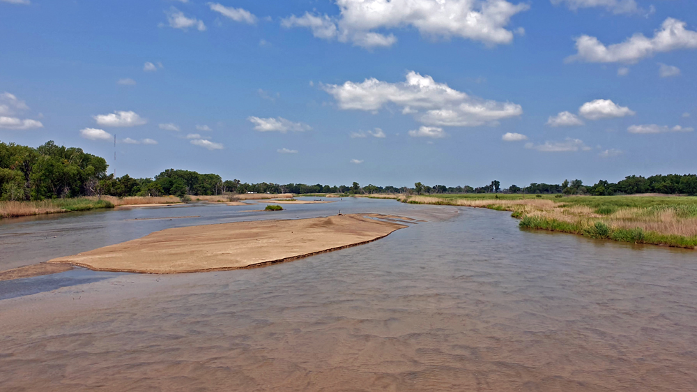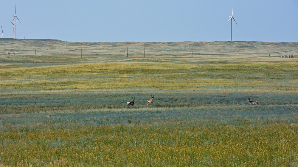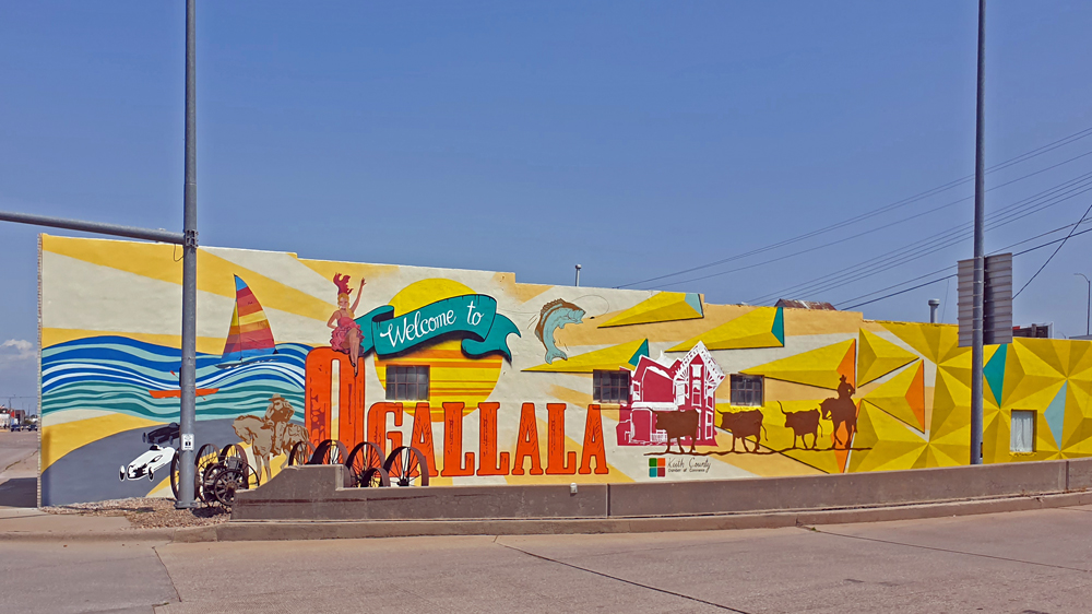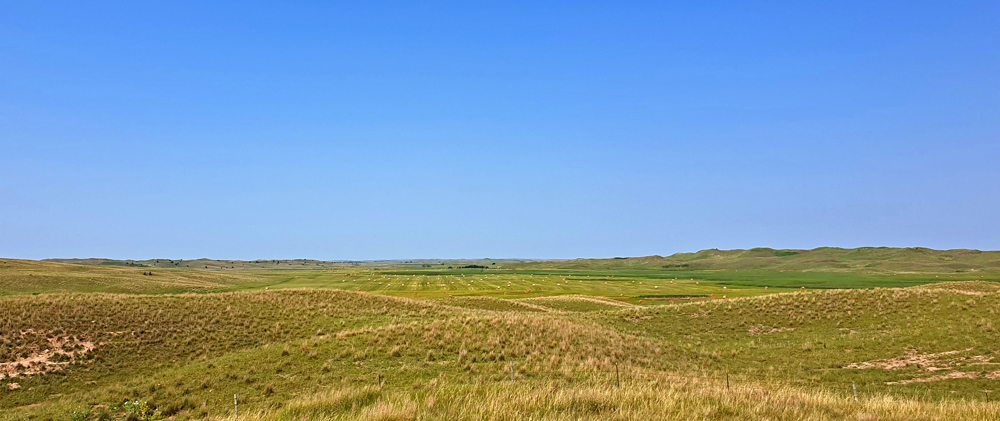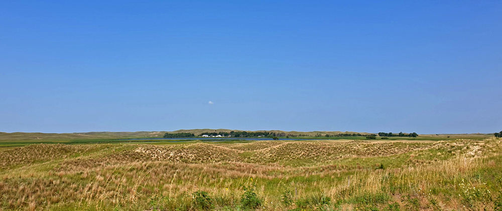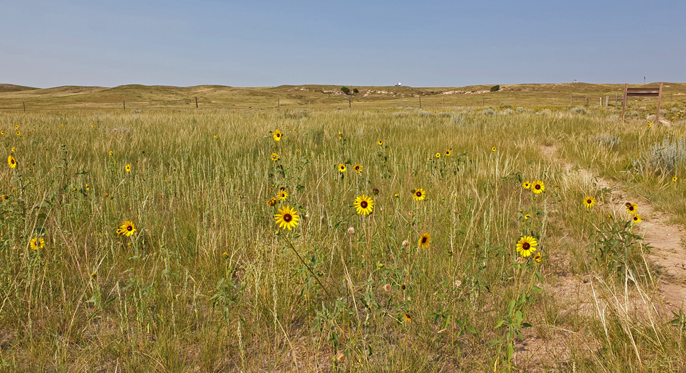 Weiter geht’s durch die Prärie bzw. Grasslands. Die gewellte, hügelige Gegend wird immer trockener, geleichzeitig sind die Senken oft mit kleinen Seen und Sümpfen gefüllt. Felder (oder auch Bäume) gibt es nur noch in einigen halbwegs flachen und geschützten Niederungen und die Farmen liegen immer weiter auseinander. In North Platte, NE, das zwischen den Armen von North und South Platte River liegt, füllen wir den Tank und decken uns wieder einmal mit Vorräten ein, bevor wir Richtung Westen abdrehen.