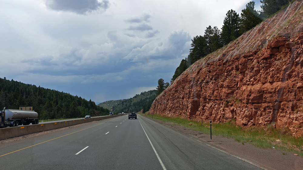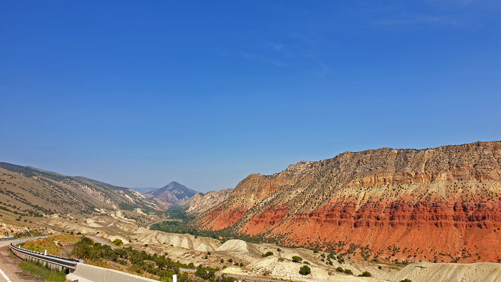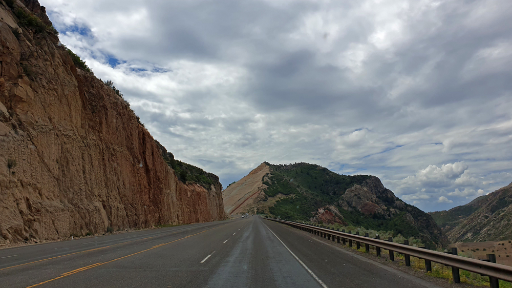 Am nächsten Tag wagen wir uns wieder hinunter, diesmal auf der Südroute in Richtung Bountiful, die als «Scenic Backway» (das gibt’s auch!) ein bisschen besser ausgebaut ist; ein bisschen weiter unten wird die Strasse angenehm breit und es gibt sogar Leitplanken! Yipee!