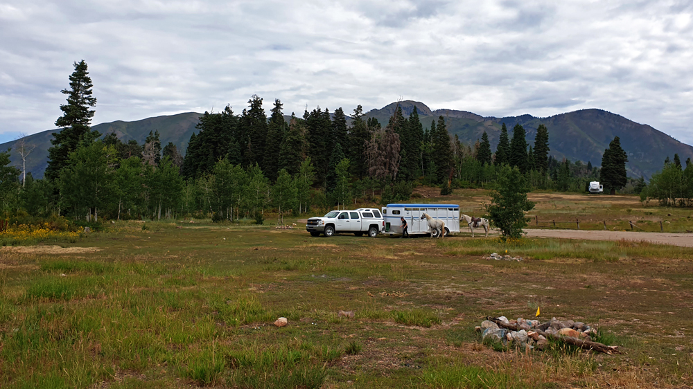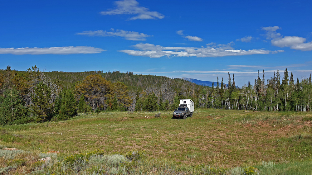 Ozy meint, ein Platz am Utah Lake wäre doch nett. Es tönt so, doch als wir dort ankommen, entpuppt sich die (freie) Übernachtungsmöglichkeit als sehr heisser Wüstenflecken mit einem Haufen herumliegendem Abfall, einem See, dem wir lieber nicht zu nahe kommen, und vielen Moskitos. Also weiter, am besten wieder etwas in die Höhe. Nicht allzu weit südöstlich des Utah Lake folgen wir der Mt. Nebo Road in den Spanish Fork Ranger District (Uinta-Wasatch-Cache National Forest), wo es neben zahlreichen – entweder geschlossenen oder vollen – Campgrounds auch freie Stellmöglichkeiten gibt. Auch diese sind sehr gut besucht, oft von Gruppen, die gleich ihre Pferde mitgebracht haben, aber wir finden gerade noch rechtzeitig ein Plätzchen auf einer Lichtung mit weiteren Campern, bevor es dunkel wird. Leider ist dann die Fortsetzung der Strasse wegen Waldbrandschäden und Wiederaufforstung gesperrt, so dass wir am Morgen die gleiche Strecke wieder zurückfahren.