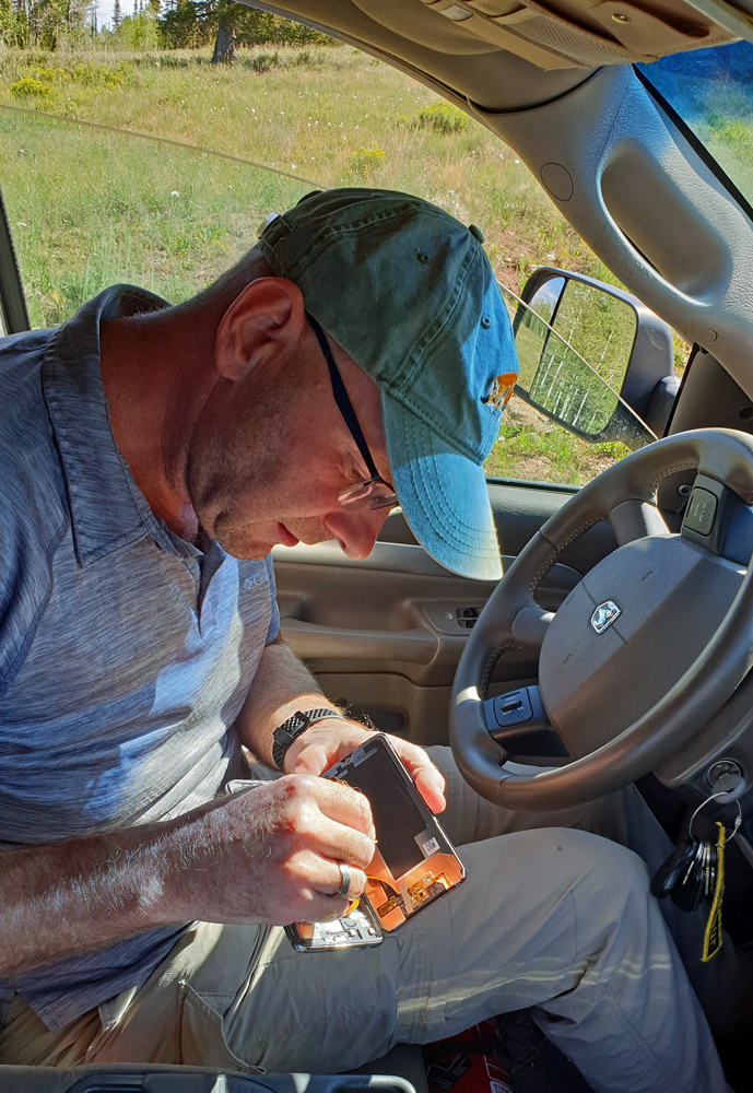Wir müssen noch eine weite, von kleineren Gebirgszügen unterbrochene Hochebene überqueren, bevor wir im Medicine Bow-Routt National Forest einen hübschen Übernachtungsplatz auf einer blumenübersäten Waldlichtung finden. (Die riesigen hölzernen Schneezäune lassen erahnen, dass es im Winter hier oben nicht so gemütlich ist…). Irgendwie fühlen wir uns beide elend, kaputt und abgeschlagen und haben einen brummenden Kopf. Wir fragen uns, ob wir etwas aufgelesen haben, bis uns klar wird, dass wir hier auf 2’650 m ü. M. sind und vermutlich nach so langer Zeit im Flachland Probleme mit der Höhe haben. Wir werden aber sehr plötzlich und unsanft von unseren Beschwerden abgelenkt: wir haben unser Google Fi-Motorola meistens in der Mittelablage, wo es uns als Hotspot dient. Heute Abend wollte die Verbindung aber – wieder mal – nicht so richtig klappen und ich schleppe mich entnervt nach vorne, um den Anbieter manuell auszuwählen. Als ich das Gerät in die Hand nehme, bemerke ich, dass sich der Bildschirm ganz leicht wölbt! Der Akku beginnt sich zu blähen!!! Wir trennen das Gerät sofort vom Strom und legen es draussen in einiger Entfernung auf eine Felsplatte. Zum Glück haben wir es rechtzeitig gemerkt und das Teil ist nicht im Auto explodiert oder in Flammen aufgegangen! Die Wölbung bleibt stabil und Ozy rettet erst mal die Google Fi-Haupt-SIM-Karte, bevor er am nächsten Morgen den Akku ausbaut (die Arbeit, den Bildschirm zu entfernen, hat dieser uns immerhin schon selbst abgenommen…).