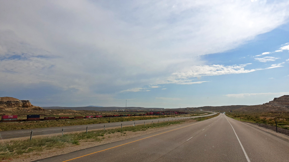 In Cheyenne endet die Ebene (die hier auch schon auf rund 1’850 m liegt) und wir kommen in die Rocky Mountains. Auf der I-80 überwinden wir – anders als die Eisenbahn im Jahr 1868 – mühelos den Sherman Summit auf 2’630 m ü. M. (der höchste Punkt der gesamten transkontinentalen I-80 und ehemals auch der höchste Punkt der First Transcontinental Railroad). Es mitten am Nachmittag und wir haben plötzlich grosse Lust auf Panda Express, den es laut Google in Laramie geben soll. Leider stellt sich heraus, dass es sich dabei nur um eine (geschlossenen) Dependance innerhalb des Campus der University of Wyoming handelt… Oh well. Ein Hamburger tut’s auch…