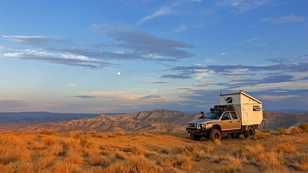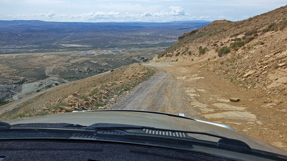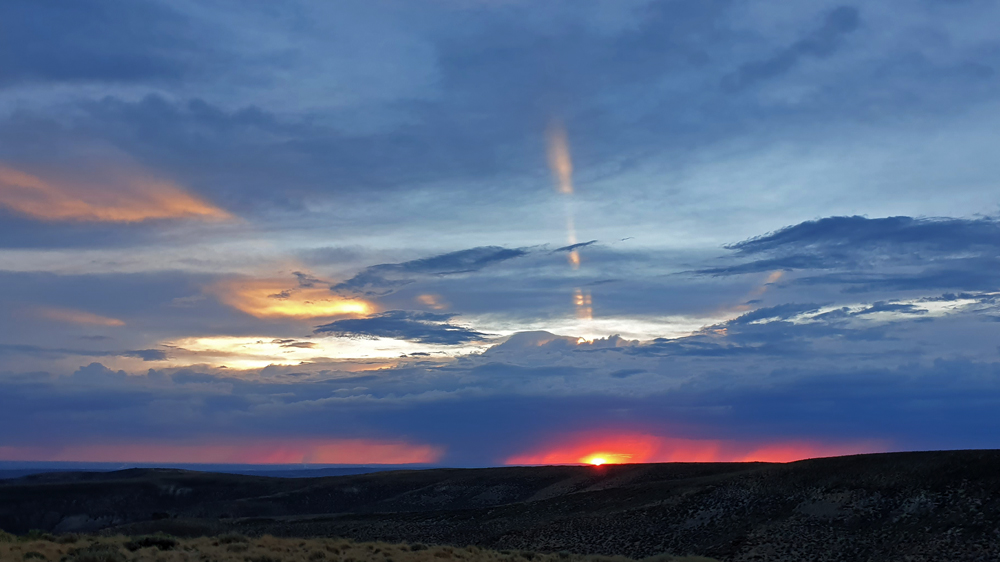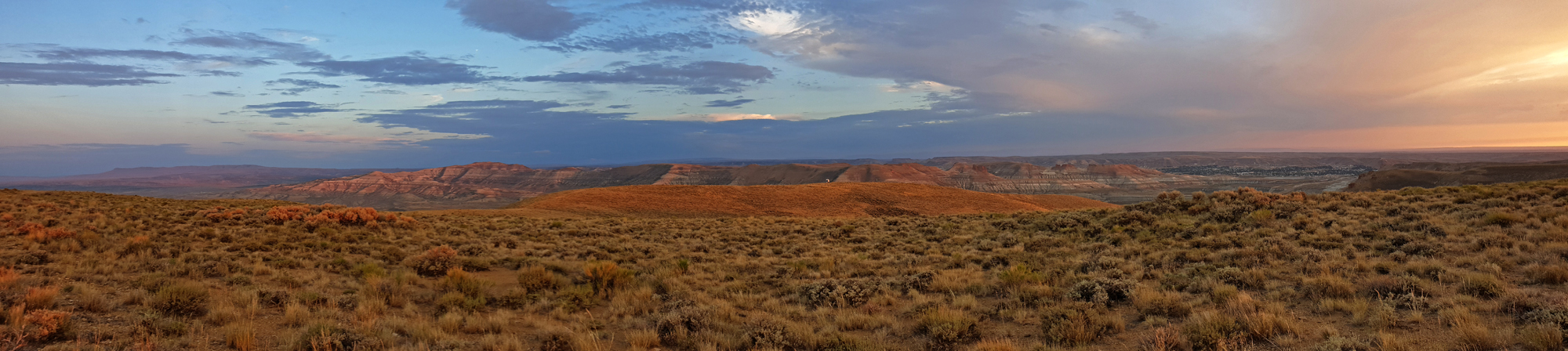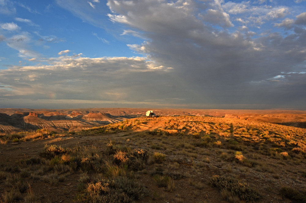 Die I-80 führt uns weiter über Gebirgszüge und Hochebenen bis Green River, WY. Hier hatte Ozy schon im Jahr 2019 übernachtet und auch wir schlagen auf dem mesa-förmigen White Mountain unser Lager auf. Das Licht hier ist ganz speziell und wir geniessen die grandiosen Sonnenauf- und untergänge und den atemberaubenden Blick über das farbige Tal. (Das Foto, das Ozy im 2019 von unserem Auto gemacht hat, wurde sogar in den TDR Calendar 2020 aufgenommen!). Es ist so schön, dass wir uns entschliessen, noch eine Nacht zu bleiben. Eine Entscheidung, die ich bereue, als ein heftiges ein Gewitter aufzieht. Ich weiss nicht, was Ozy durch den Kopf geht, aber zumindest mir ist es zuäusserst auf dem hohen Hügelsporn inmitten tosender Sturmböen, niederfahrender Blitze und am Auto abprasselndem Sand nicht mehr ganz so wohl…