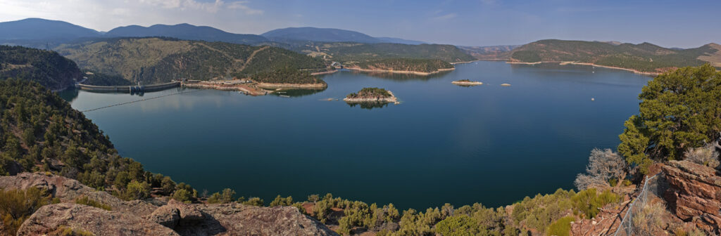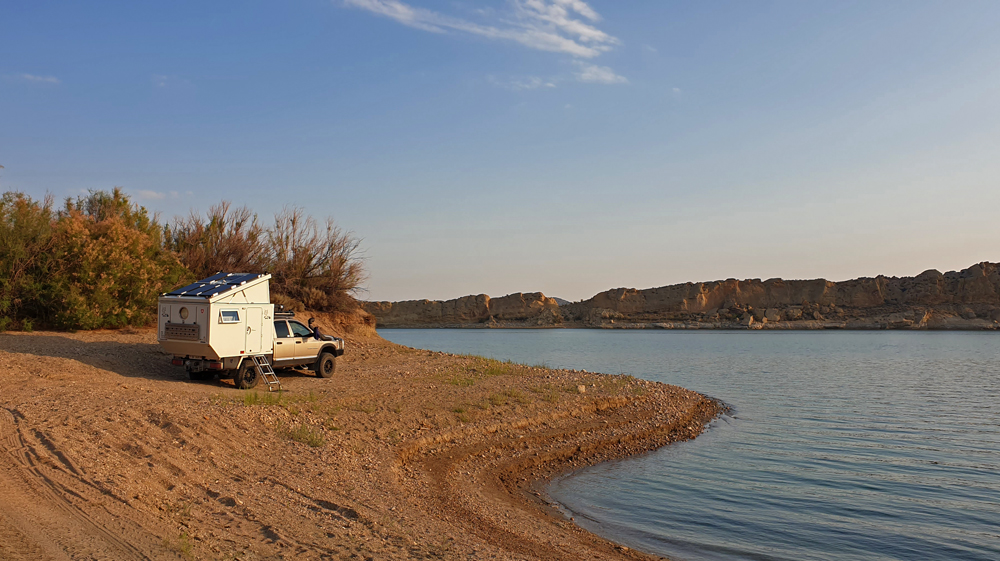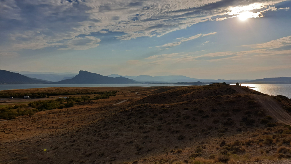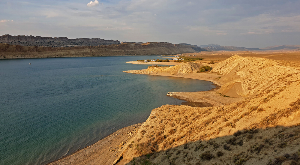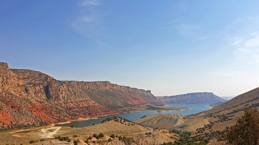 Meine Zweifel (und Visionen von uns samt Auto unten im Tal) erweisen sich glücklicherweise als unbegründet. Wir erleben den Morgen intakt und wollen als nächstes dem nahegelegenen Flaming Gorge Reservoir einen Besuch abstatten. Es ist heiss und es ist uns definitiv nach Abkühlung zumute! Rund um den See in der Flaming Gorge National Recreation Area gibt es zahlreiche «wilde» Stellplätze, die jetzt am Wochenende allerdings gut besucht sind… Trotzdem finden wir noch ein brauchbares Fleckchen (vielleicht auch, weil da ohne 4 WD und High Clearance nicht jeder hinkommt…) mit einer hübschen Badebucht gleich ums Eck.