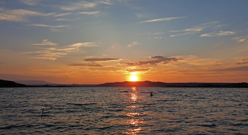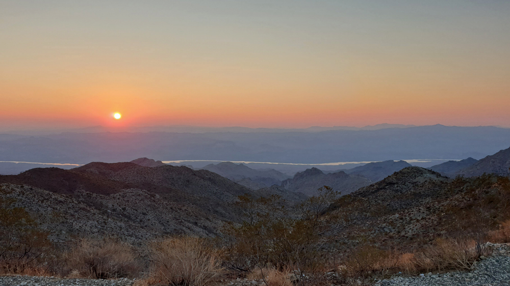 Wir hüpfen schnell ins Wasser (wenn schon, denn schon, aber der Colorado ist mit 27 °C auch nicht wirklich viel kühler…) und tuckern dann sofort wieder die gewundene Atztec Wash Road hinauf. Als wir wieder auf dem Berg sind geht gerade die Sonne unter und wir bleiben gleich oben stehen (hier kühlt es in der Nacht wenigstens bis auf 29 °C ab).