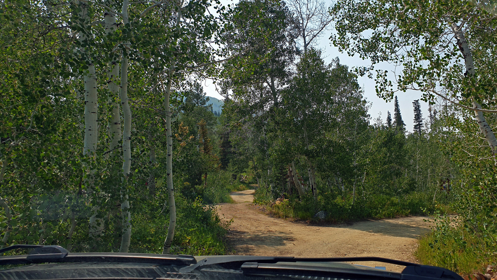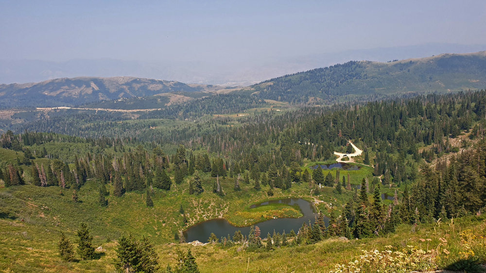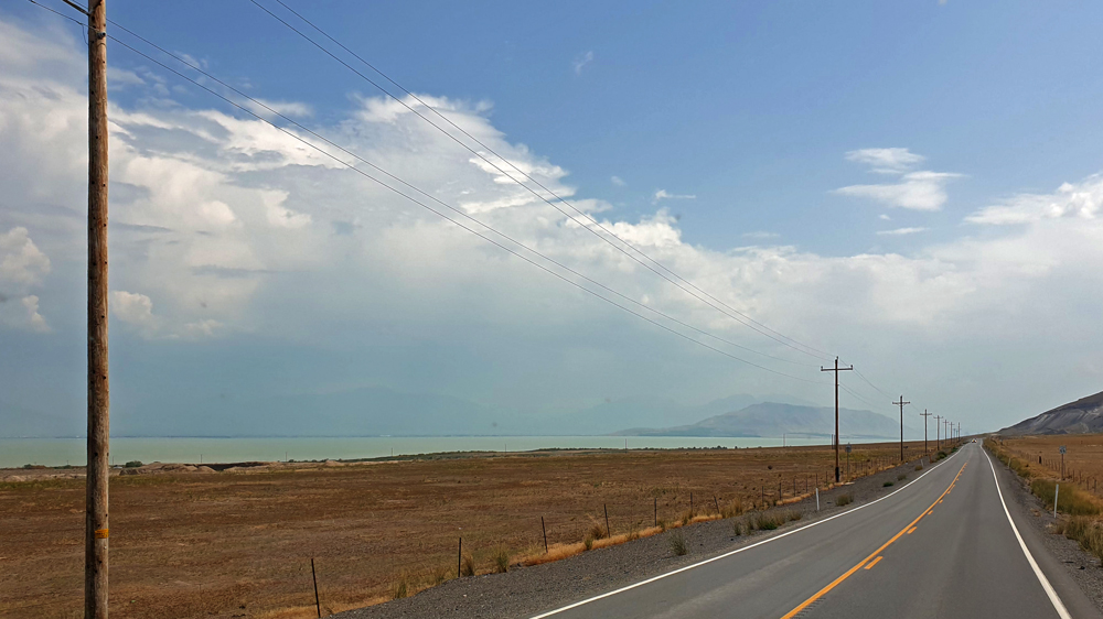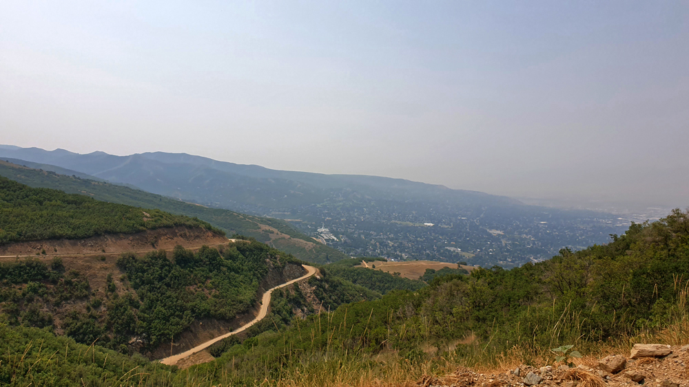 Via Flaming Gorge Dam geht es durch eine spannende Landschaft in einem Bogen wieder zurück zur I-80 (wieso das Reservoir «Flaming Gorge» heisst, wird uns erst auf dieser Seite klar…). In immer dichterem Verkehr fahren wir durch einige Basins und über ein paar Pässe und dann sind wir in Salt Lake City, wo wir als erstes den neuen Akku für den Google Fi im Locker abholen. Den Haze von den diversen Waldbränden, die wie jeden Sommer in Kanada und in den Rockies wüten, sind wir seit Nord-Minnesota nie mehr ganz losgeworden. In und um Salt Lake City ist es wieder ganz schlimm, es herrscht ein richtiger «Hochnebel». Dazu kommen noch Temperaturen von über 40 Grad, so dass wir uns nicht danach fühlen, auf Antelope Island mitten im Salzsee zu übernachten… Stattdessen ziehen wir uns in die über 2’700 m hohen Wasatch Mountains nordöstlich der Stadt zurück, wo es sich bei 25 Grad gut aushalten lässt. Die Fahrt dorthin ist allerdings der Horror (zumindest für mich – Ozy nimmt es zum Glück noch relativ gelassen): Die Zufahrt von Farmington her ist einspurig und stark gewunden, die bröcklige Strassenkante weder mit einer Leitplanke versehen noch vor dem Abrutschen gesichert. Zudem ist es Samstagnachmittag und es herrscht reger Gegenverkehr in Form von ATVs und Jeeps, die die Strecke fahren, als gäbe es kein Morgen – und die jeweils sehr abrupt abbremsen, wenn sie sich nach einer schwungvoll gefahrenen Kurve vor unserem Kühler wiederfinden…