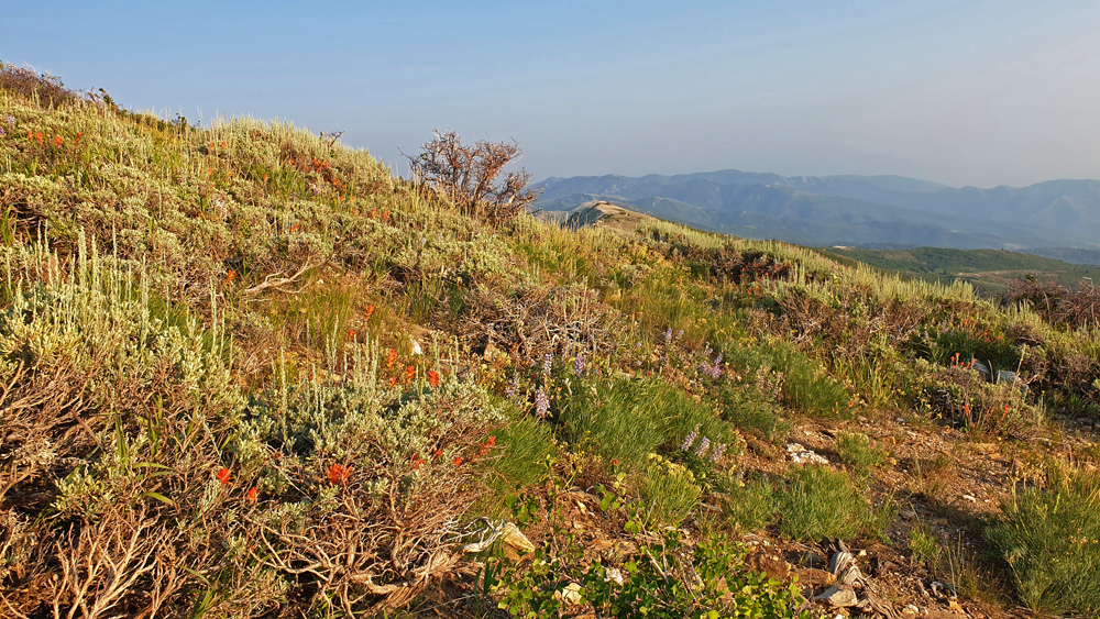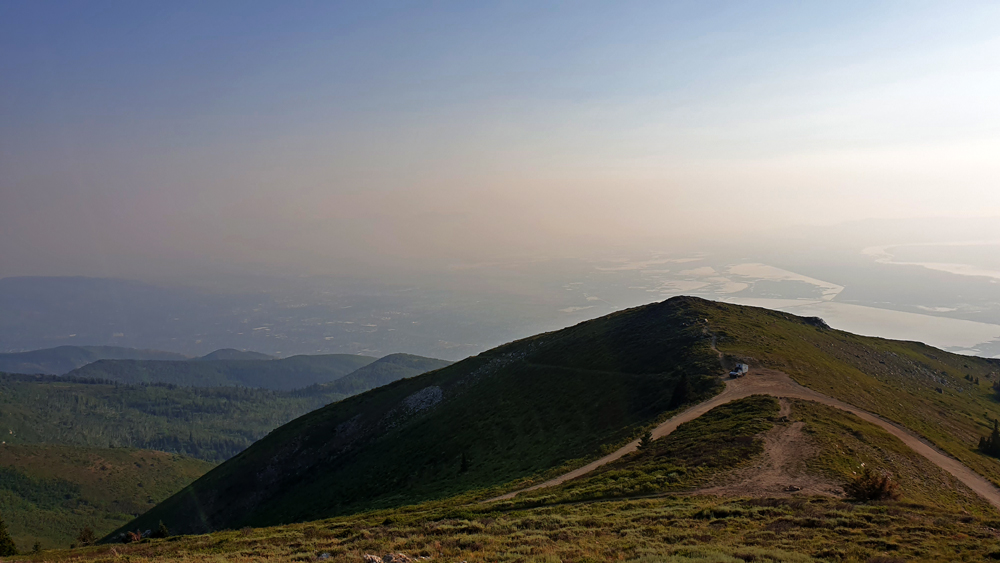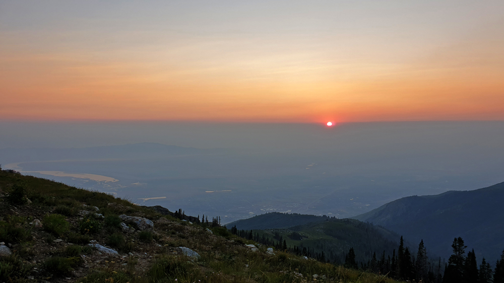 Der völlig zugewachsene und für die spärliche Ausstattung unserer Meinung nach überteuerte NF-Campground auf dem Berg (gemanagt von einer «Utah Recreation Company») gefällt uns nicht, aber wir haben Glück und finden einen schönen Platz direkt zu Füssen des Bountiful Peak. Nach unseren Erfahrungen mit dem Freizeitverkehr bleiben wir gleich das ganze Wochenende über stehen und geniessen in Ruhe die wunderbare Aussicht auf den Haze, unter dem sich irgendwo Salt Lake City verbirgt, sowie den Anblick der vielen ATVs und Jeeps, die in den Bergen herumkurven. Am Abend sehen wir rundum Feuerwerk – wissen die, das ich morgen Geburtstag habe? 😉 – und bewundern den noch fast vollen Mond. (Es handelte sich übrigens um die Festivitäten zu den Utah Pioneer Days, die jeweils am 24. Juli begangen werden).