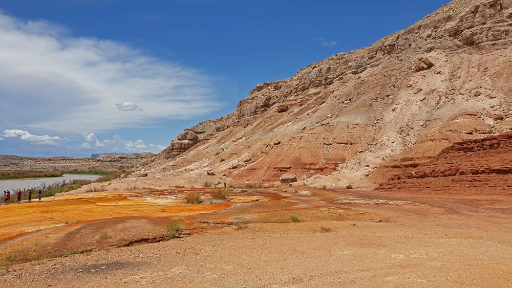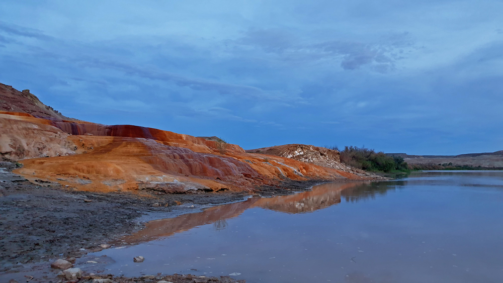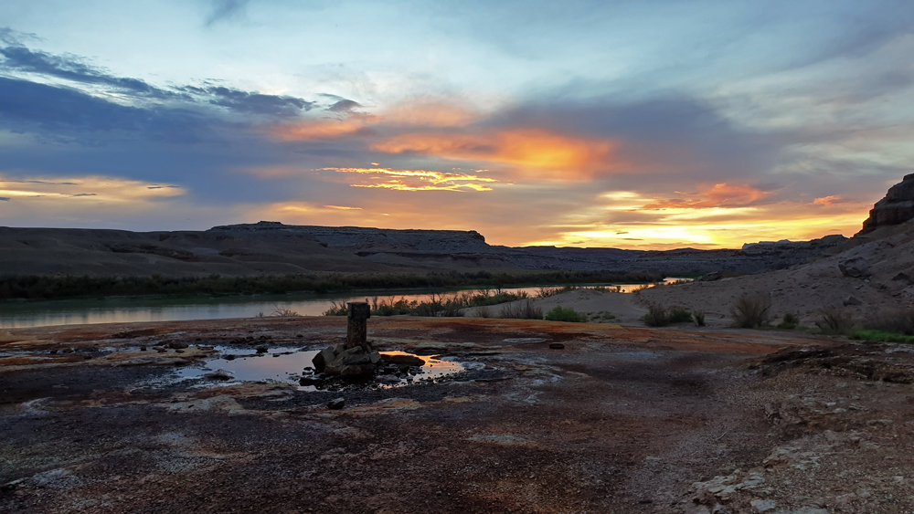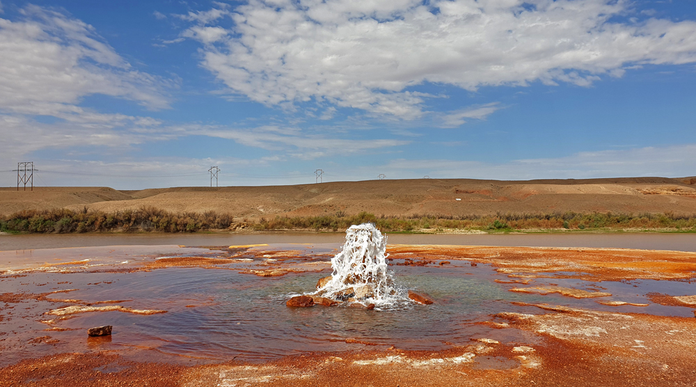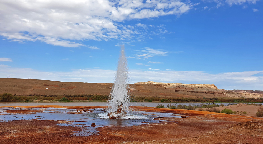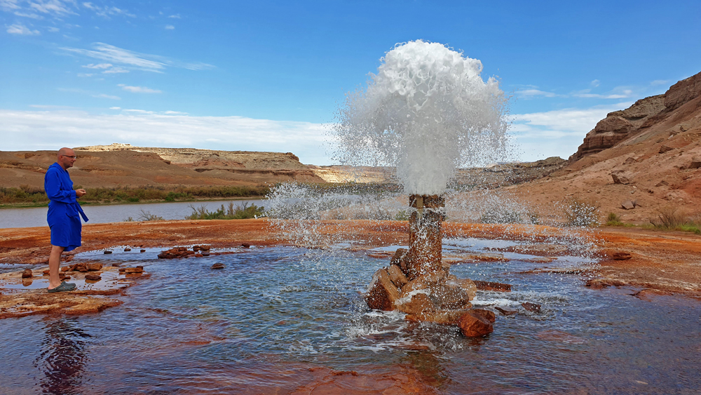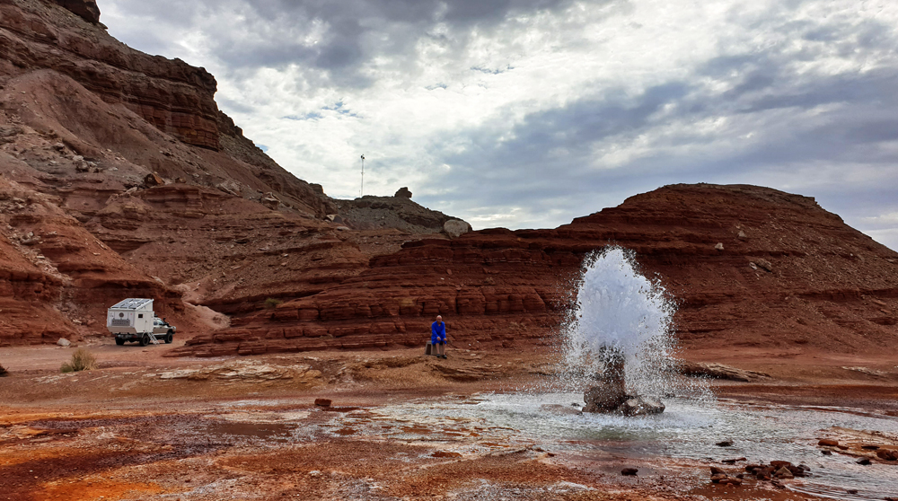 Ozy ist bei seinen Recherchen zu einem Übernachtungsplatz auf den Crystal Geysir südlich von Green River, UT gestossen. Ich liebe Geysire und so fahren wir auf rumpeligen Pisten zum Ufer des gleichnamigen Flusses, wo wir eine grosse, in allen Schattierungen von Orange leuchtende Travertinterrasse mit einem daraus aufragenden Eisenrohr vorfinden. Als wir vorsichtig den Finger in den flachen Pool stecken, ziehen wir ihn schnell und sehr überrascht wieder heraus: das Wasser ist 17 °C kalt! Der Geysir, der 1935 beim Bohren nach Öl in 800 m Tiefe erzeugt wurde, ist ein Kaltwassergeysir! Die Ausbrüche werden durch Kohlenstoffdioxid (CO2) verursacht, ein ähnlicher Effekt wie das Aufschäumen von Mineralwasser, wenn man die Flasche öffnet. Es dringen gurgelnde und blubbernde Töne aus dem Rohr und zwischendurch läuft weiss schäumendes Wasser über, während oberhalb des Rohres die Luft ob der freigesetzten Gase wabert. Trotzdem bleibt eine richtige Eruption aus. Wir haben gelesen, dass die Abstände zwischen den Ausbrüchen 8 bis 27 Stunden betragen können, aber wir haben keine Ahnung, wann er das letzte Mal ausgebrochen ist. Da machen wir es uns erst mal gemütlich und plaudern zwischendurch mit einer Gruppe von Kayakern, die auf einem mehrtägigen Green River Trip ist. Ausser uns sind noch zwei Camper auf dem Platz, wie wir in Erwartung eines Ausbruchs. Aber passieren tut nichts.