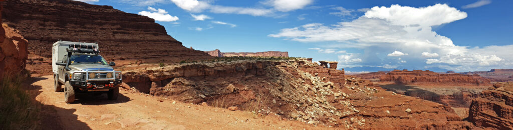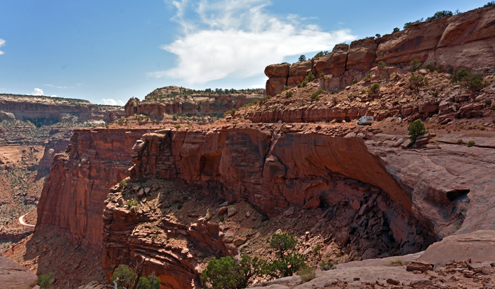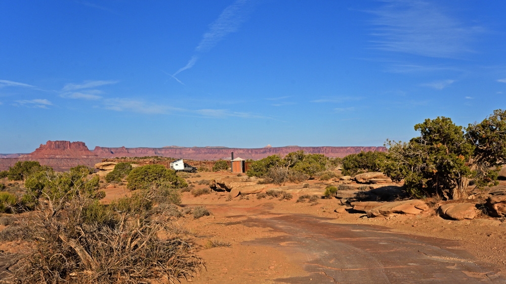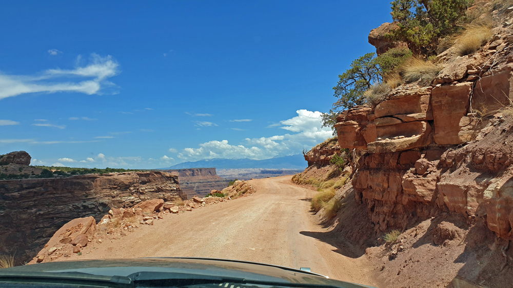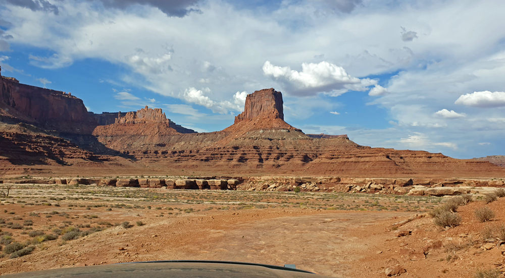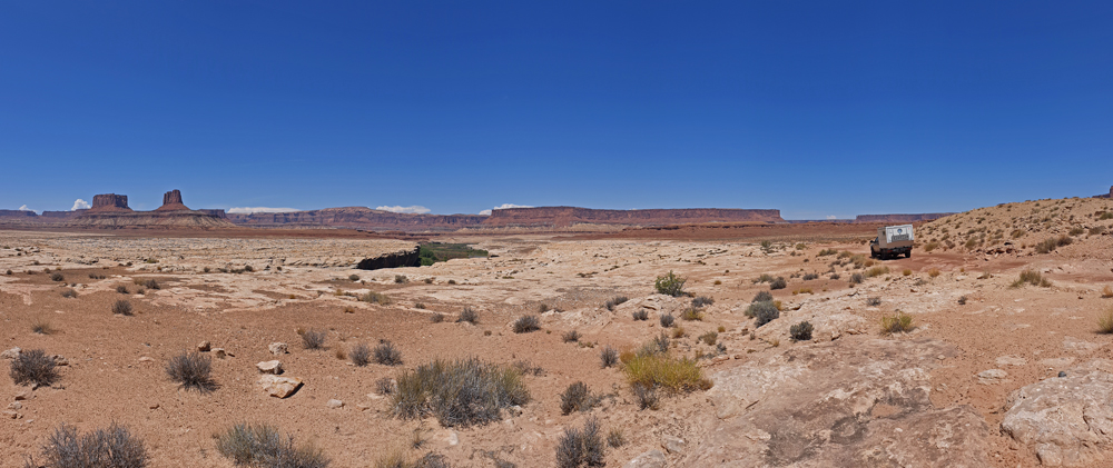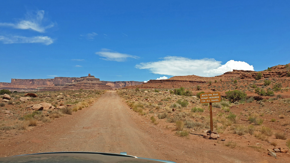 Jetzt geht’s aber zum Canyonlands National Park! Die Gegend wird farbig und immer farbiger und bald gelangen wir zum Island in the Sky-Visitor Center, wo wegen der «Gesundheits-Vorschriften» wieder einmal arme Ranger in der Bruthitze vor dem Gebäude stehen müssen (wie zuträglich das deren Gesundheit ist, sei mal dahingestellt…). Nach der visuellen Inspektion unseres Gefährts und der Versicherung, dass wir 4WD and high clearance haben (d.h. echten Vierradantrieb und ausreichend Bodenfreiheit), bekommen wir für pauschal 36 $ die Erlaubnis, die White Rim Road zu fahren. Die Anzahl Fahrzeuge pro Tag ist aufgrund der schmalen Strasse limitiert, übernachtet werden muss auf einem der 9 designierten primitive campgrounds, die mehr oder weniger regelmässig entlang der Route verteilt sind (wenn man nicht gerade wie wir in der heissesten Zeit unterwegs sind, empfiehlt sich eine vorgängige Reservierung…).