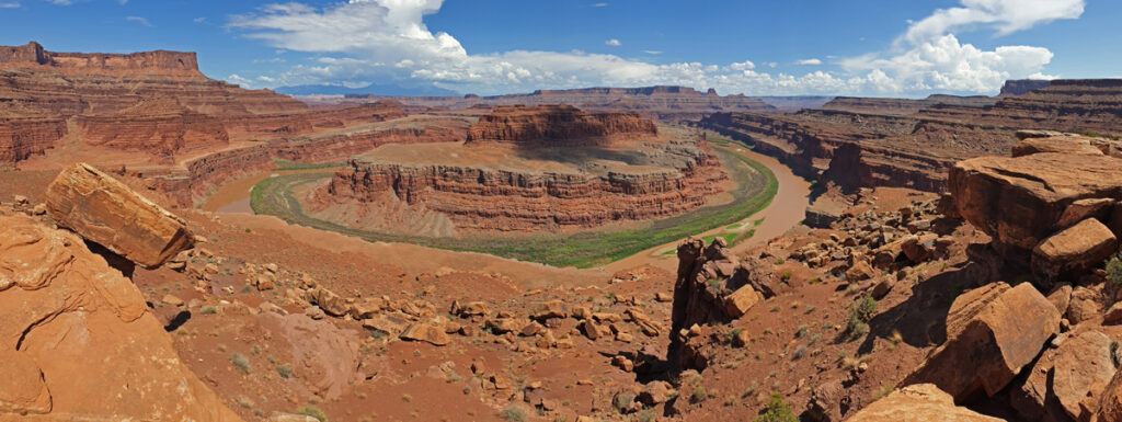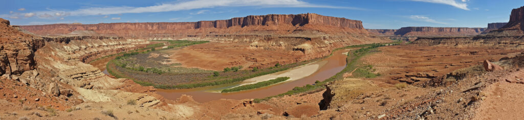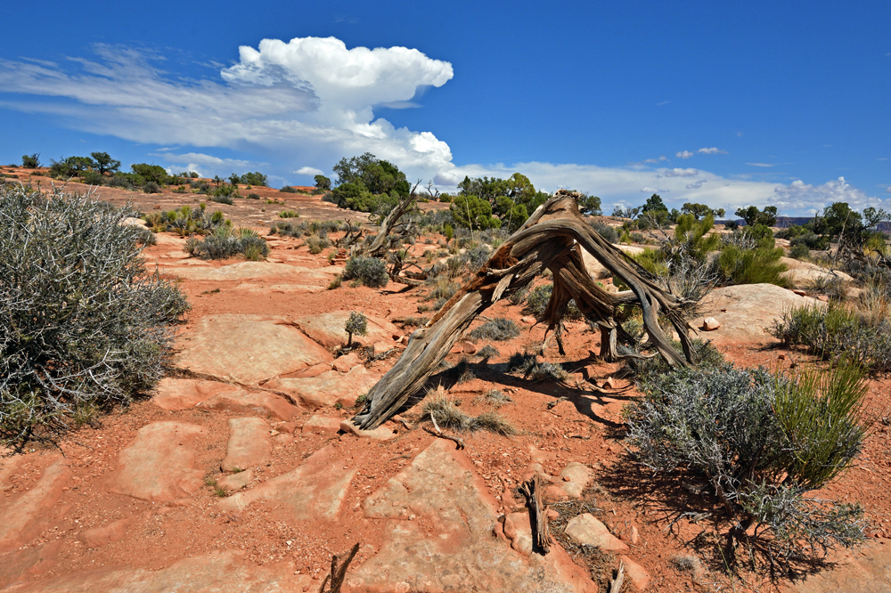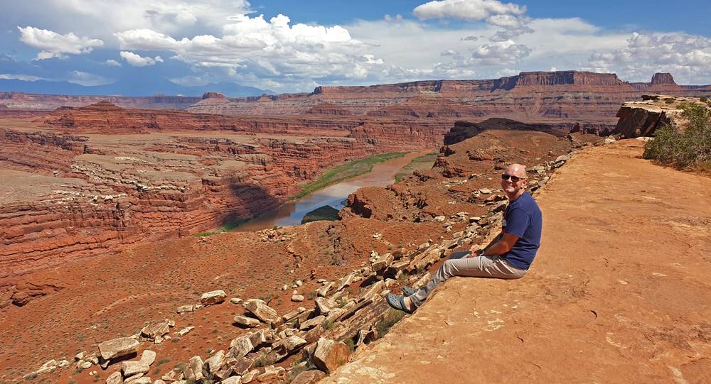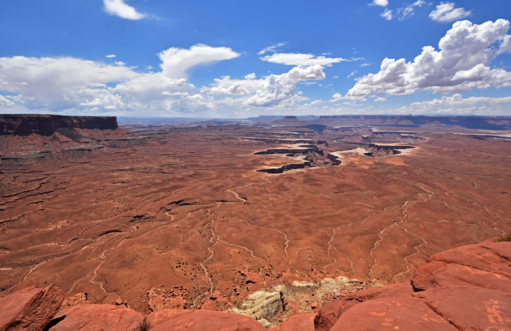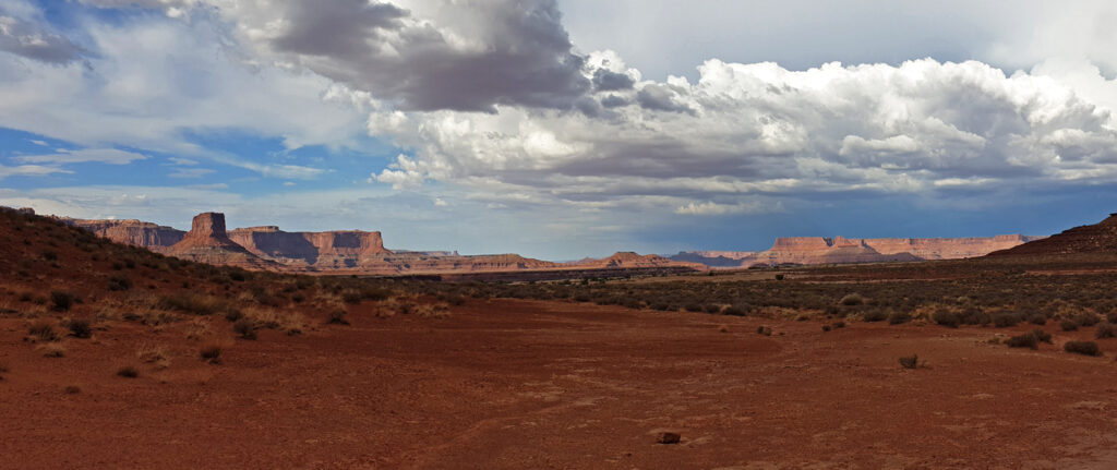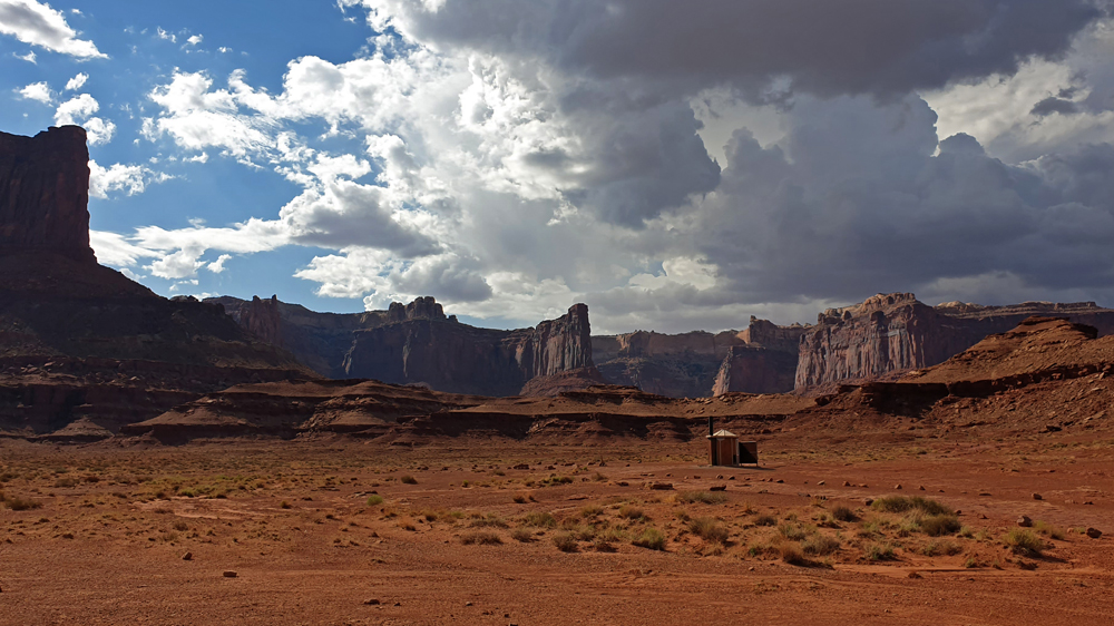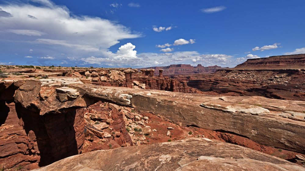 Jetzt geht’s aber zum Canyonlands National Park! Die Gegend wird farbig und immer farbiger und bald gelangen wir zum Island in the Sky-Visitor Center, wo wegen der «Gesundheits-Vorschriften» wieder einmal arme Ranger in der Bruthitze vor dem Gebäude stehen müssen (wie zuträglich das deren Gesundheit ist, sei mal dahingestellt…). Nach der visuellen Inspektion unseres Gefährts und der Versicherung, dass wir 4WD and high clearance haben (d.h. echten Vierradantrieb und ausreichend Bodenfreiheit), bekommen wir für pauschal 36 $ die Erlaubnis, die White Rim Road zu fahren. Die Anzahl Fahrzeuge pro Tag ist aufgrund der schmalen Strasse limitiert, übernachtet werden muss auf einem der 9 designierten primitive campgrounds, die mehr oder weniger regelmässig entlang der Route verteilt sind (wenn man nicht gerade wie wir in der heissesten Zeit unterwegs sind, empfiehlt sich eine vorgängige Reservierung…).