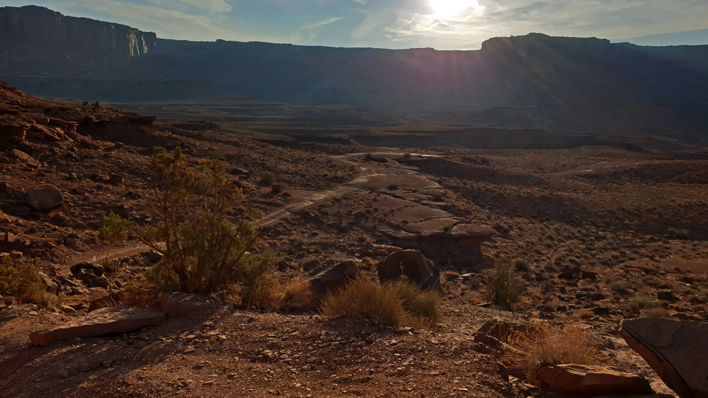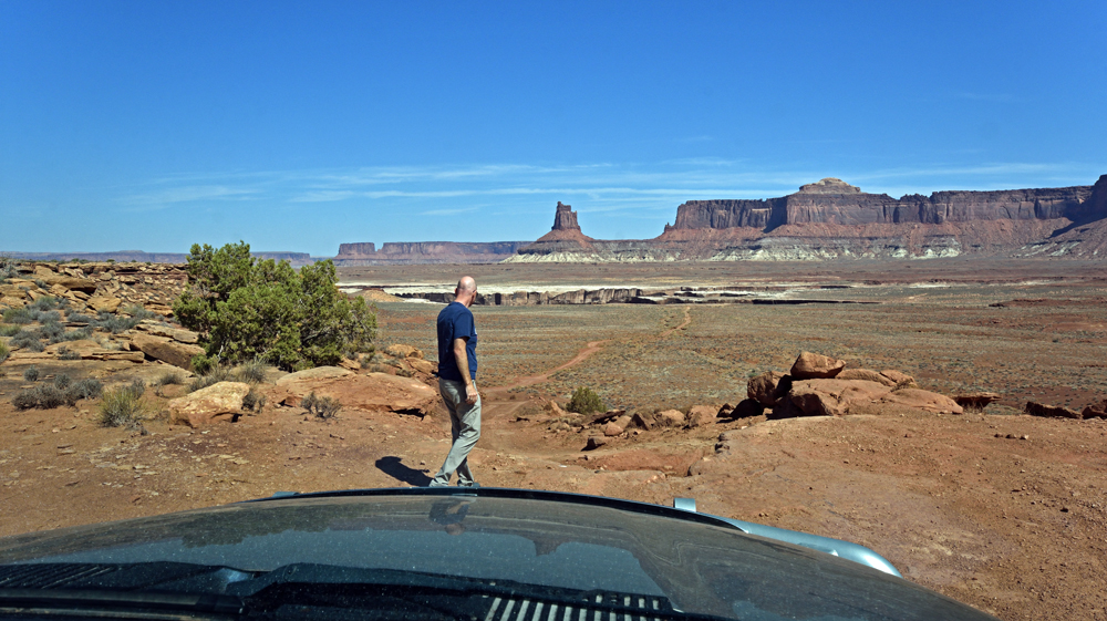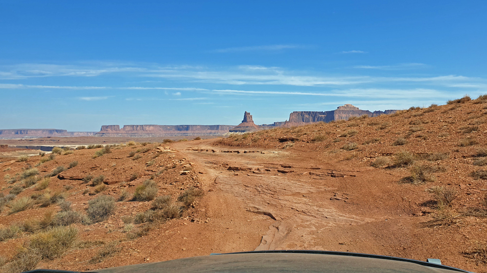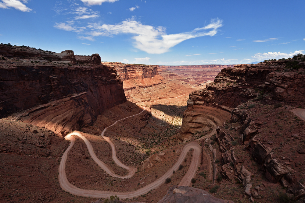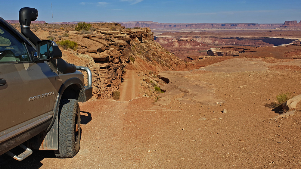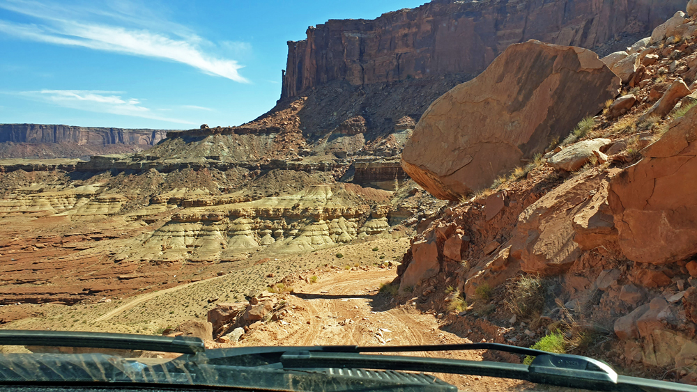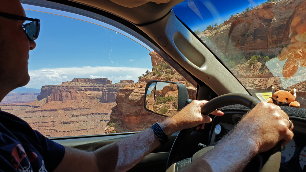 Es geht also los ins Abenteuer! Vom Canyonrand aus führt der 8 km lange, steile und gewundene, aber ansonsten recht gute und mit zahlreichen Ausweichstellen ausgestattete Shafer Trail auf den fast 500 m tiefer liegenden «White Rim» hinunter (es hat auch immer wieder Gegenverkehr). Beim «Weissen Rand» handelt es sich um einen harten, hellen Sandstein, der weniger stark erodiert ist als die darüberligenden orangen, roten und beigen Formationen, und der seinem Namen dadurch sehr gerecht wird. Am Ende des Shafer Trails würde die Potash Road Richtung Moab führen, wir biegen aber rechts auf den Trail ab, nachdem Ozy den Reifendruck verringert hat.