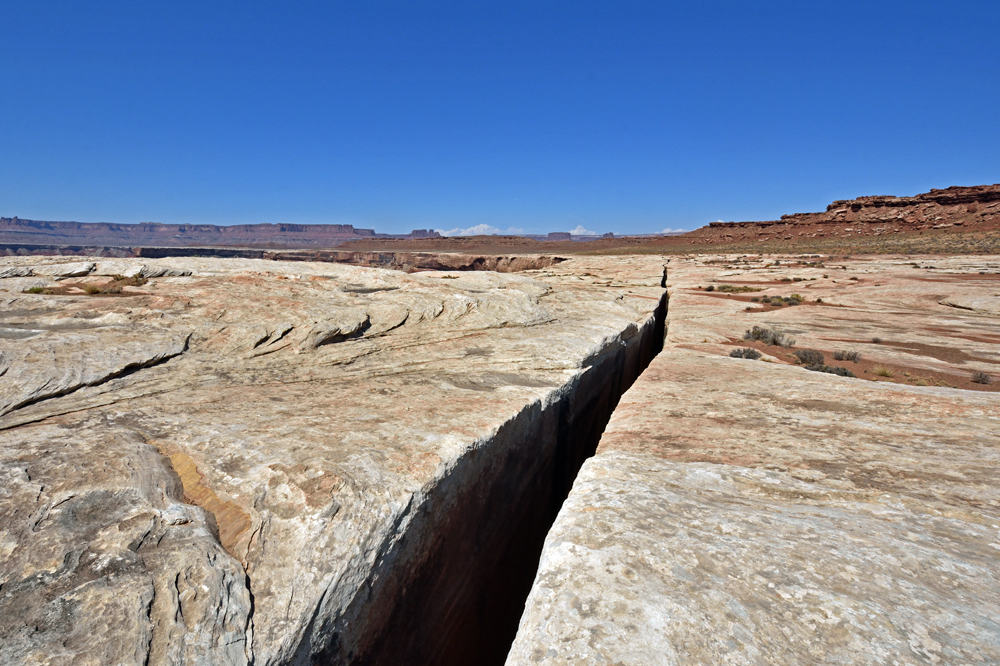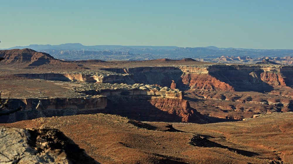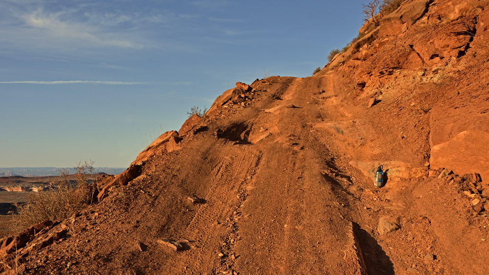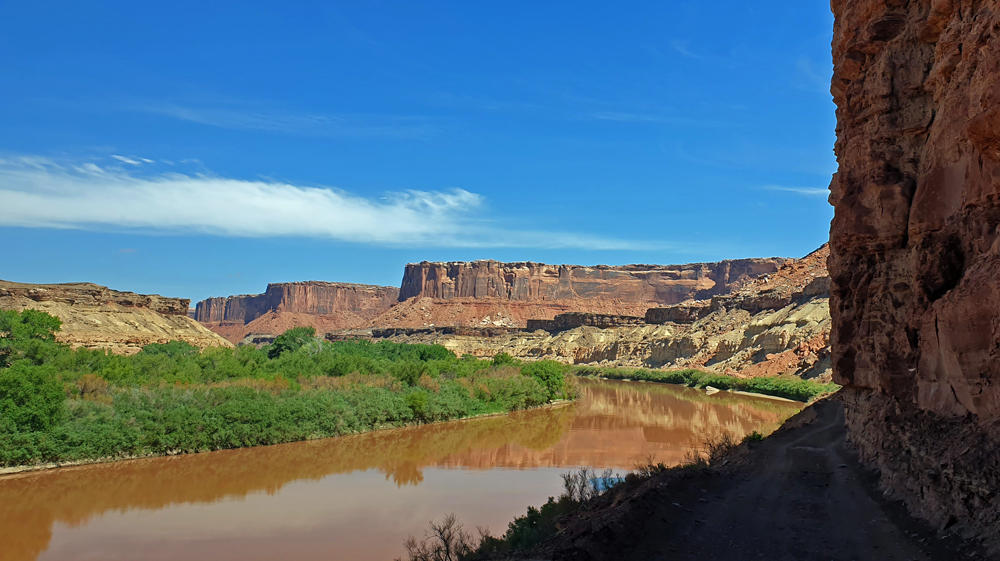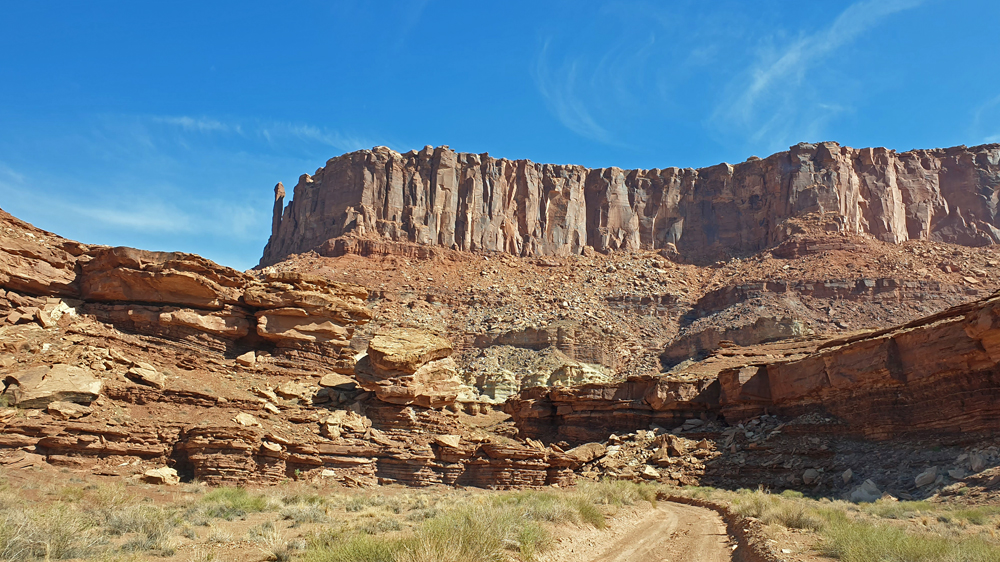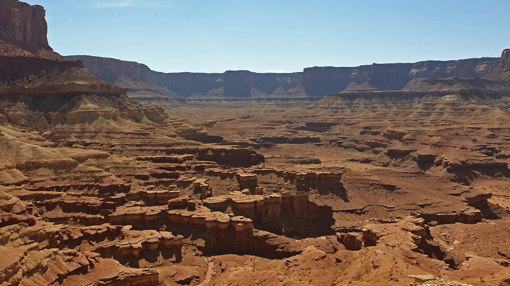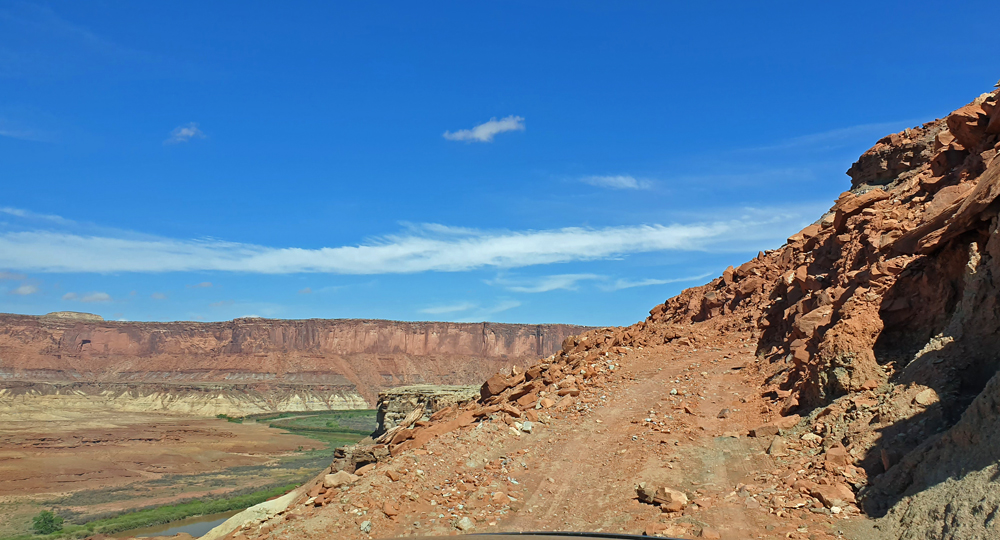 Es geht also los ins Abenteuer! Vom Canyonrand aus führt der 8 km lange, steile und gewundene, aber ansonsten recht gute und mit zahlreichen Ausweichstellen ausgestattete Shafer Trail auf den fast 500 m tiefer liegenden «White Rim» hinunter (es hat auch immer wieder Gegenverkehr). Beim «Weissen Rand» handelt es sich um einen harten, hellen Sandstein, der weniger stark erodiert ist als die darüberligenden orangen, roten und beigen Formationen, und der seinem Namen dadurch sehr gerecht wird. Am Ende des Shafer Trails würde die Potash Road Richtung Moab führen, wir biegen aber rechts auf den Trail ab, nachdem Ozy den Reifendruck verringert hat.
