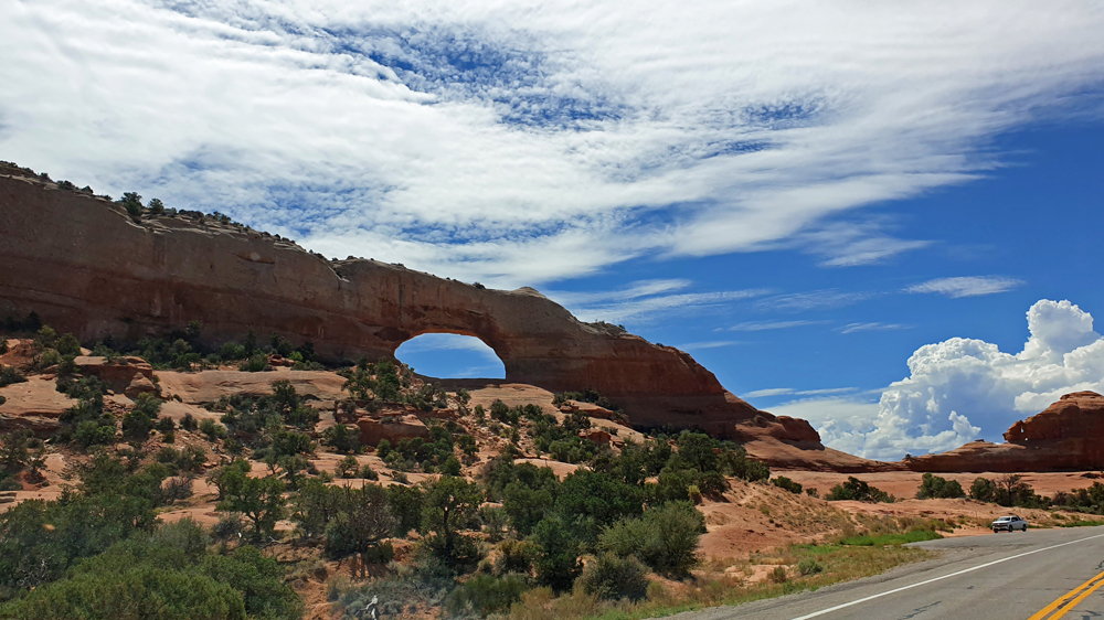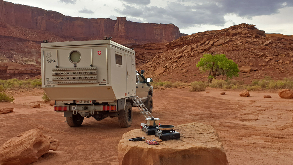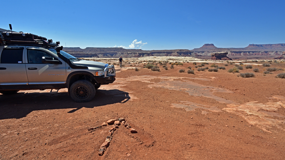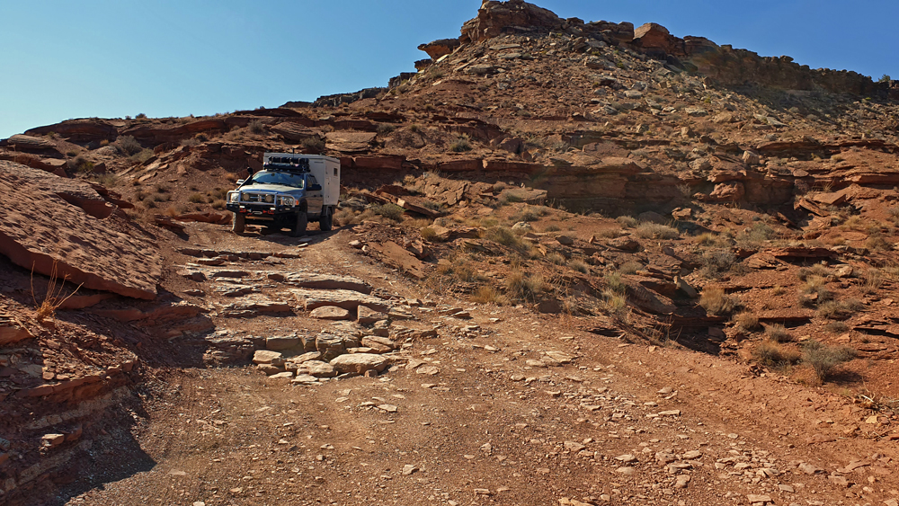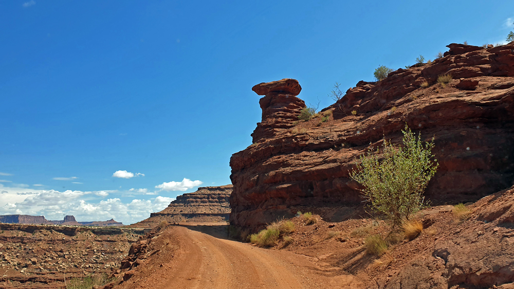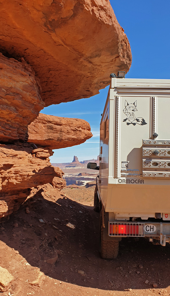 Von der Abzweigung ist unser Übernachtungsplatz noch rund 60 km entfernt und wir witzeln ein bisschen über die Besorgnis von wegen 4×4 und High Clearance und geniessen die Fahrt. Wir sind total begeistert von der Gegend! Für uns ist es wie eine Mischung aus Grand Canyon, Monument Valley und Brice Canyon. Absolut spektakulär und atemberaubend! Ozy muss immer wieder anhalten, damit ich Fotos machen kann (es werden am Schluss über 500 Fotos und Videos. Schluck). Am Musselman Arch treffen wir auch auf eine Gruppe mit Mehrplätzer-Geländewagen, deren Leiter mir erklärt, dass der Felsbogen der Endpunkt der typischen Jeeptouren sei.