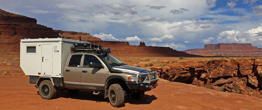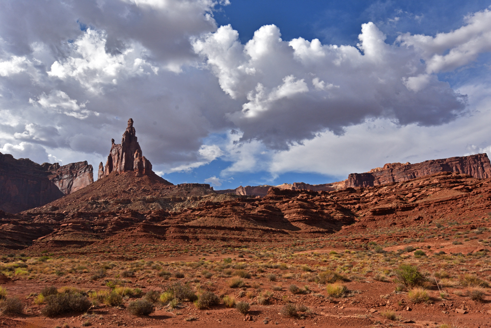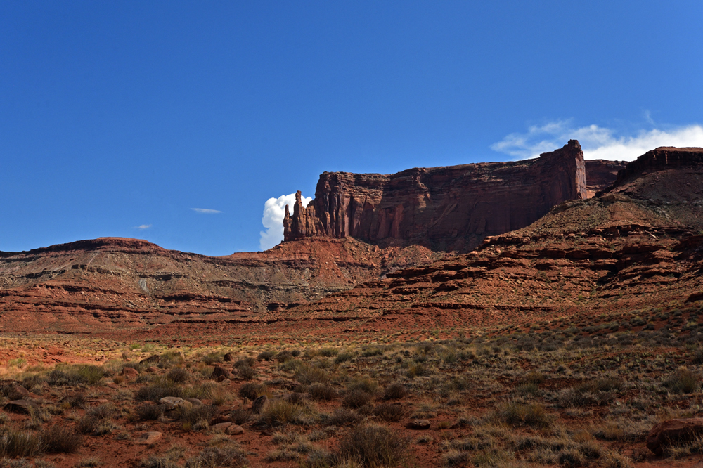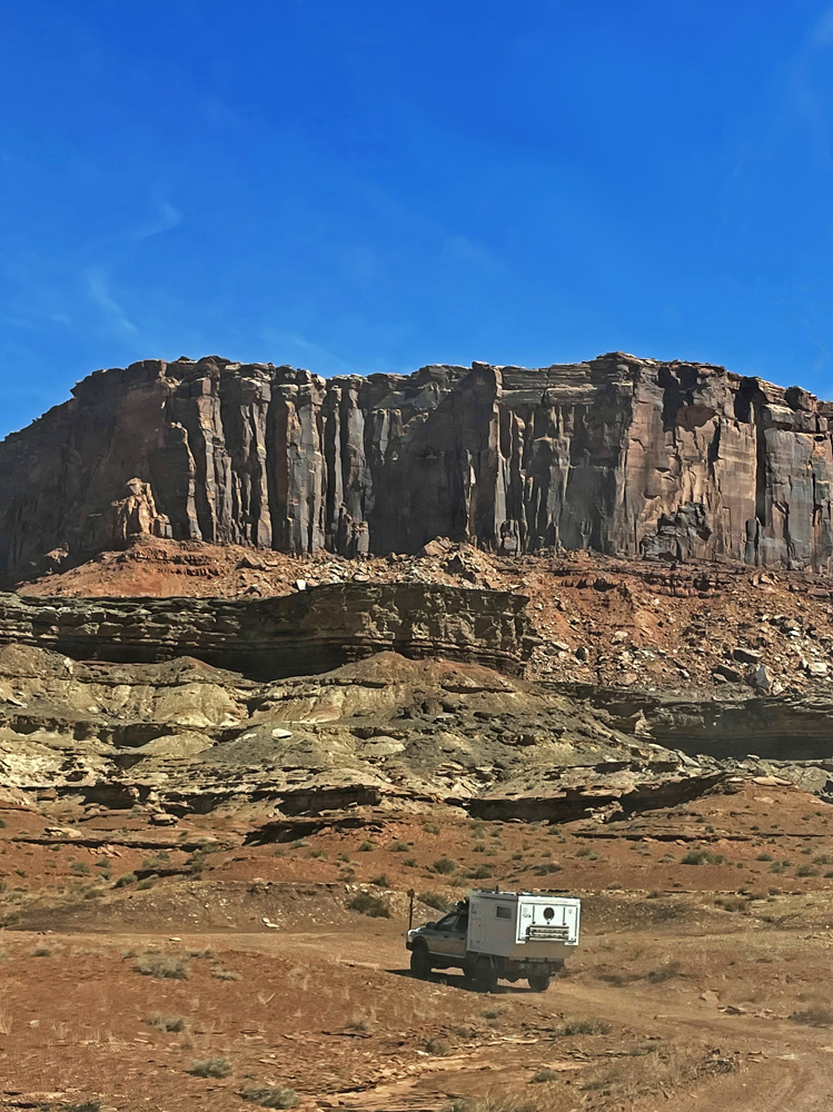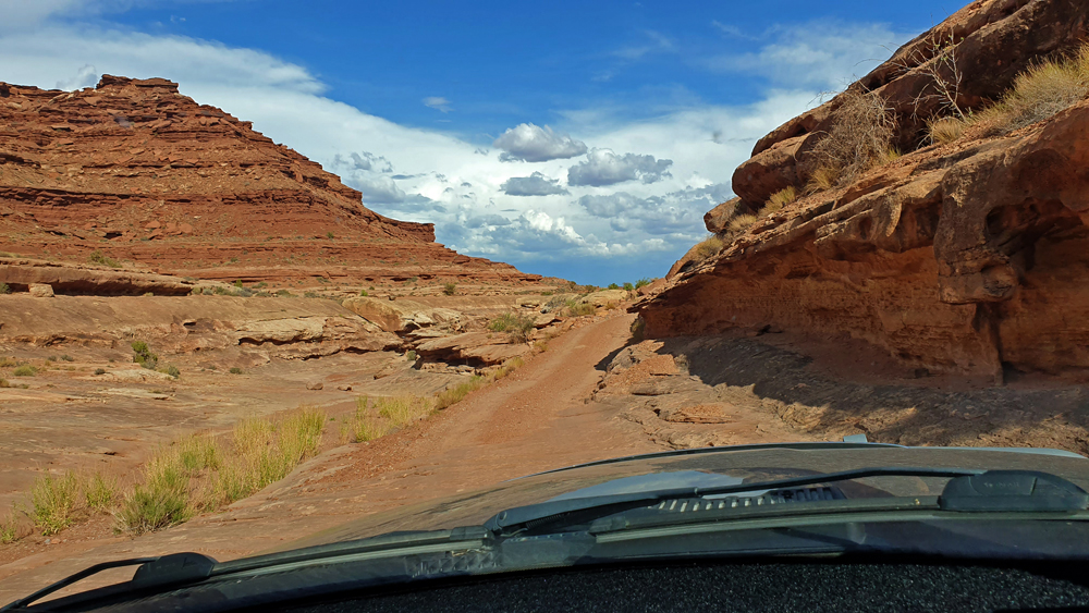 Von der Abzweigung ist unser Übernachtungsplatz noch rund 60 km entfernt und wir witzeln ein bisschen über die Besorgnis von wegen 4×4 und High Clearance und geniessen die Fahrt. Wir sind total begeistert von der Gegend! Für uns ist es wie eine Mischung aus Grand Canyon, Monument Valley und Brice Canyon. Absolut spektakulär und atemberaubend! Ozy muss immer wieder anhalten, damit ich Fotos machen kann (es werden am Schluss über 500 Fotos und Videos. Schluck). Am Musselman Arch treffen wir auch auf eine Gruppe mit Mehrplätzer-Geländewagen, deren Leiter mir erklärt, dass der Felsbogen der Endpunkt der typischen Jeeptouren sei.