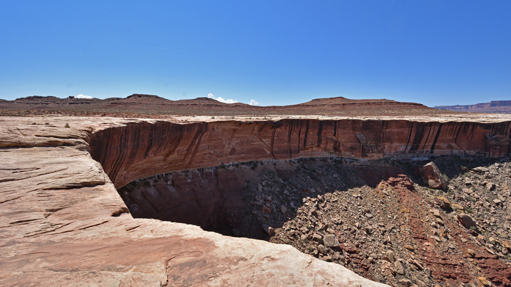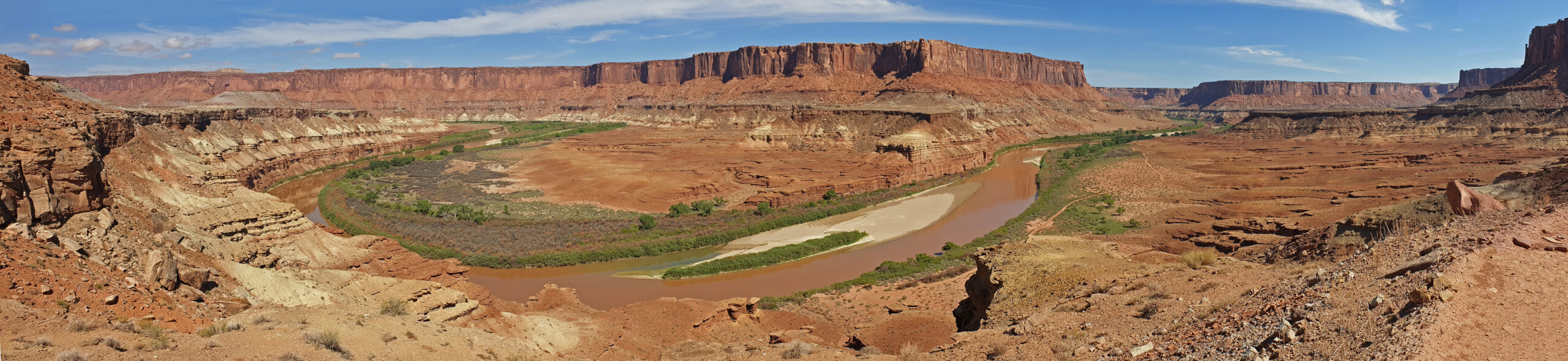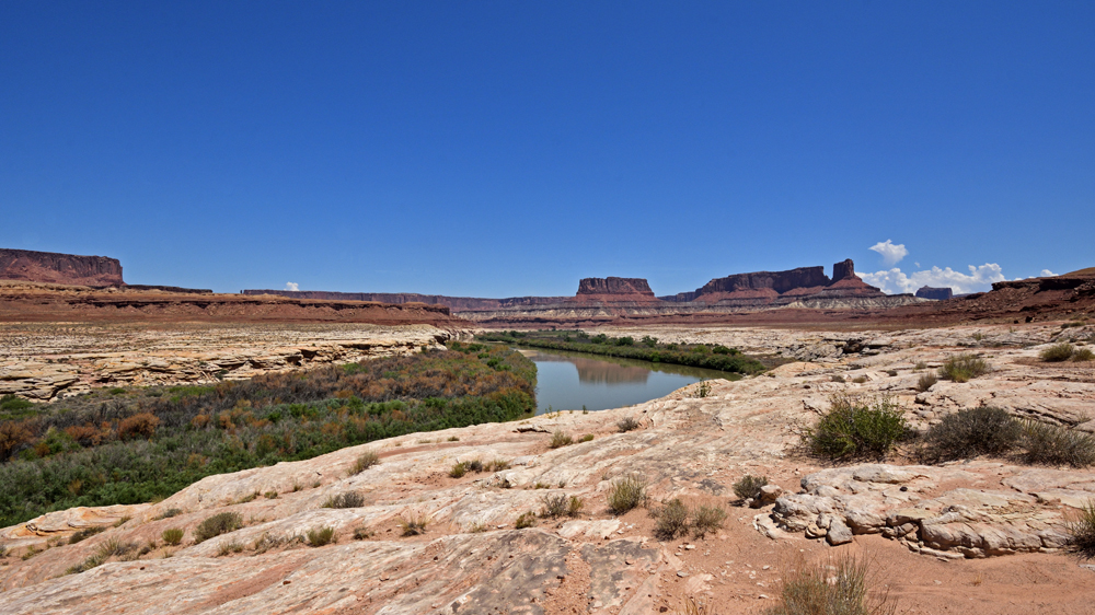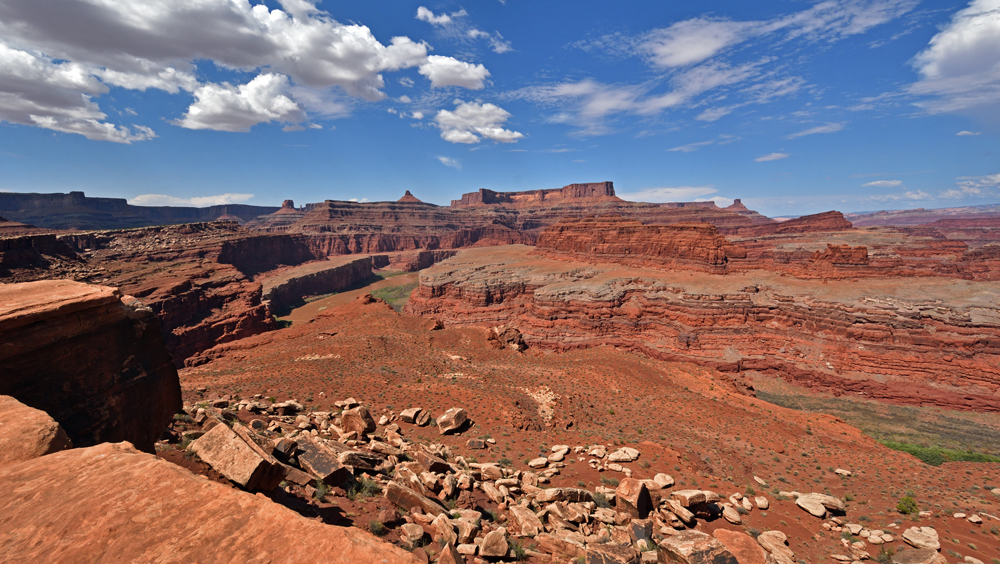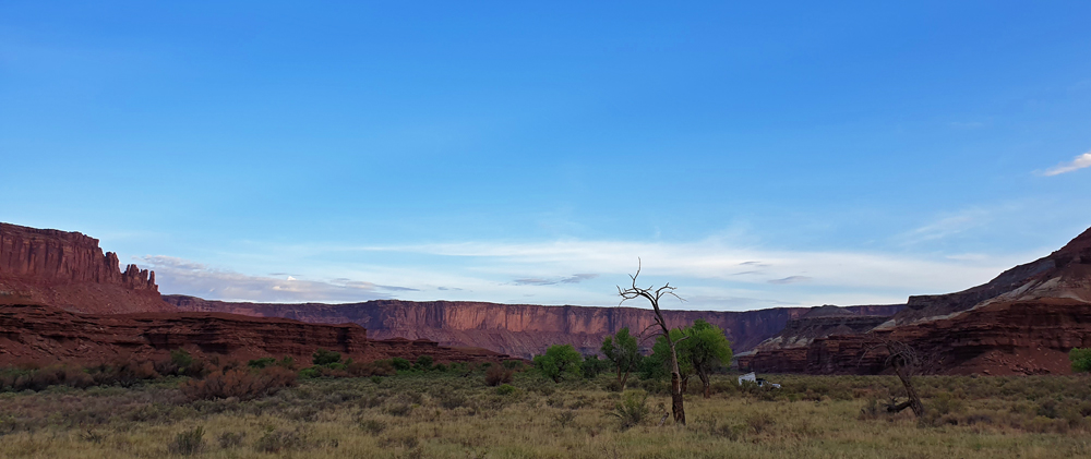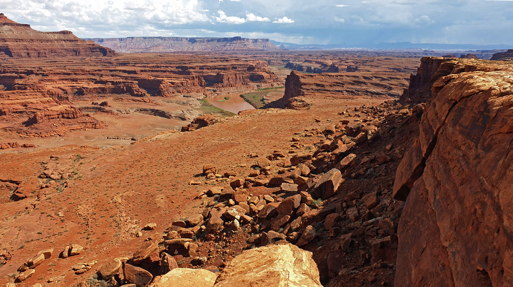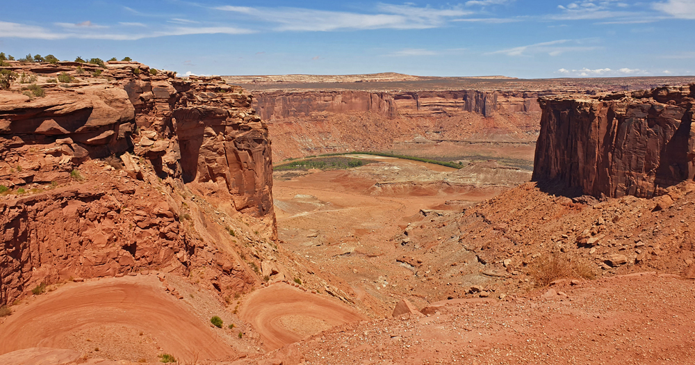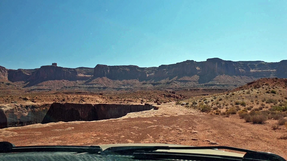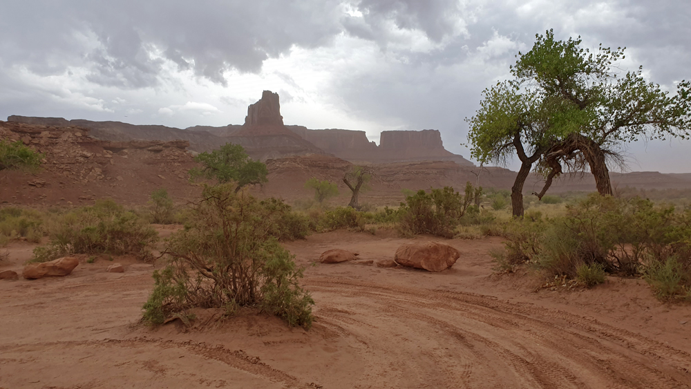 Was hoch kommt, muss auch wieder runter: Zunächst geht auf einer steilen, teils mit Überhängen «ausgestatteten» Piste wieder auf den White Rim hinunter. Ich filme die fiesesten Stellen und nehme mir fest vor, einen Film daraus zu machen (wenn ich mal viiiiieeeel Zeit habe…). Die Strecke bleibt rumpelig, aber so, dass wir auch die grandiose Aussicht auf das Soda Springs Basin und den Green River geniessen können. Immer wieder bleiben wir staunend an den steilen Abbrüchen der Seitencanyons stehen und betrachten mit mulmigem Gefühl den «Black Crack», einen langen und sehr tiefen Spalt im White Rim. Die Piste changiert immer wieder zwischen ein bisschen weniger rumpligem, jedoch von mehr oder weniger tiefen Wasserläufen durchzogenem Sand und etwas rumpligerem Felsuntergrund. Zügig Fahren ist auch hier nicht möglich. Schliesslich kommen wir auf dem «Kartoffelgrund» an, wo es einige hübsche Cottonwood-Bäume gibt, es aber spürbar heisser ist als auf dem luftigen Murphy Hogback…