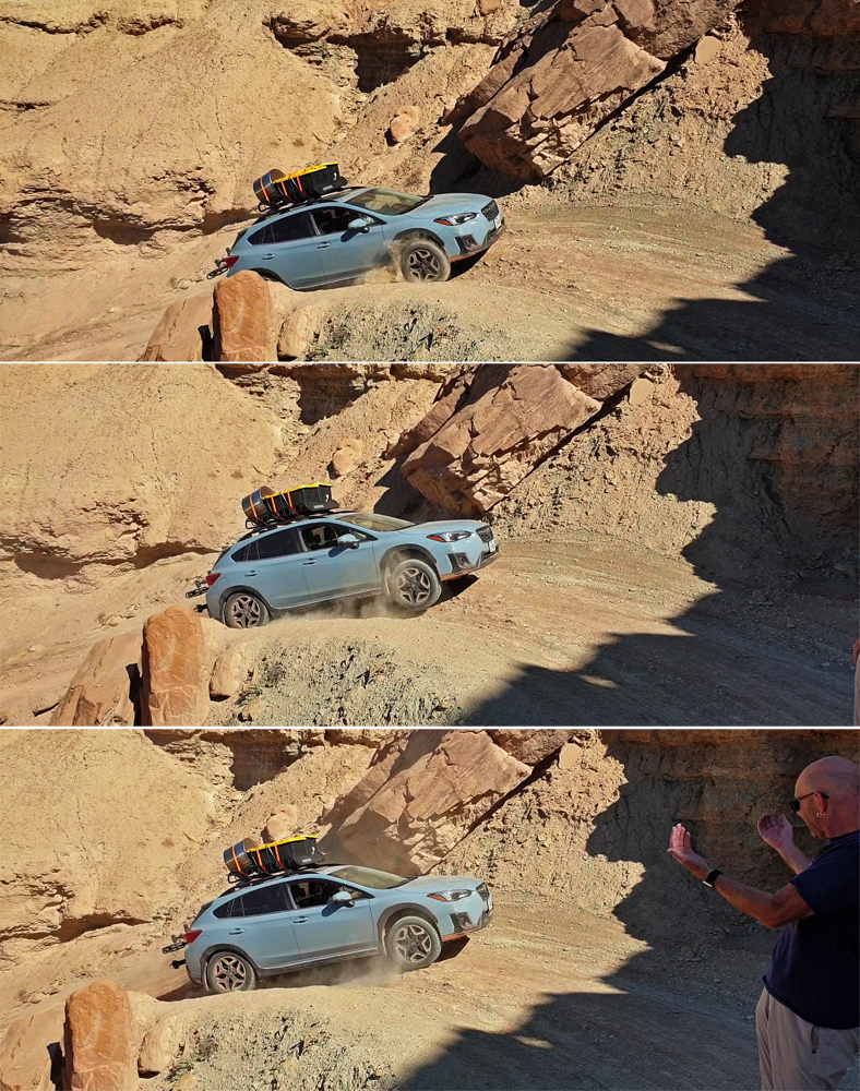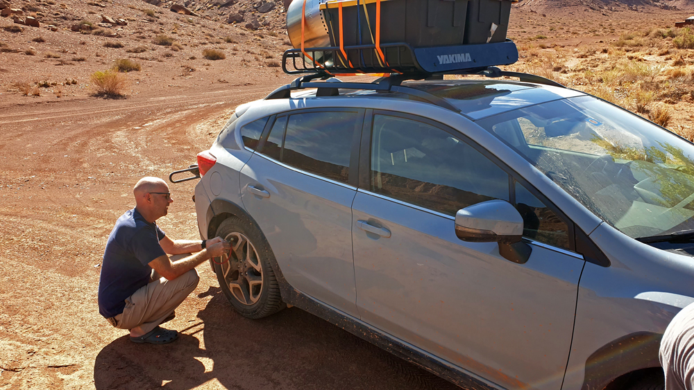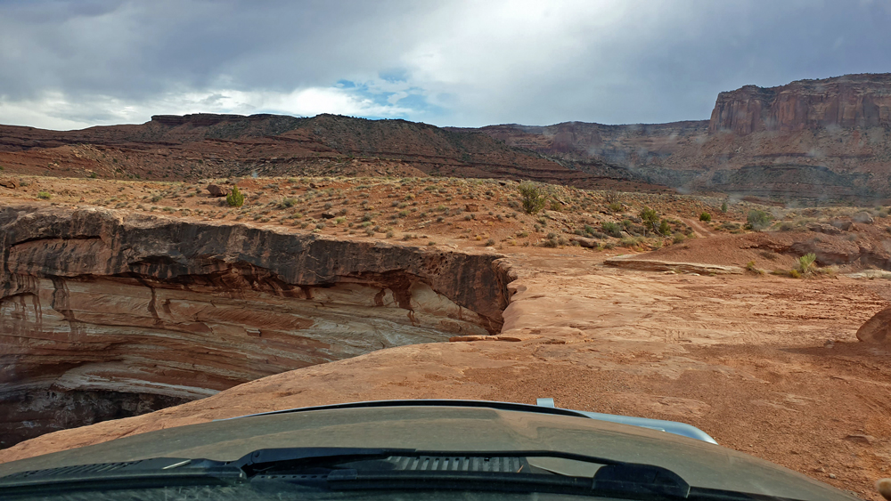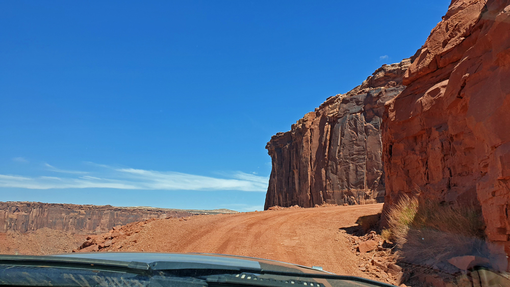 Wir machen alles bereit für die Abfahrt und Ozy und Derrick lassen am Subaru erst mal Luft ab. Wir fahren vor den beiden her, um sie im Notfall ziehen zu können. Derrick meistert jedoch alles prima, bis zu einer fiesen Stelle, wo es am Ende eines steilen Abschnitts scharf rechts geht und schon unzählige Autos vor ihm ein tiefes Loch gegraben haben. Er probiert es einmal, zwei Mal. Die elektronischen Systeme nehmen aber beim Traktionsverlust kurz vor der Kurve immer so viel Leistung weg, dass das Auto stehen bleibt und Derrick wieder rückwärts hinunterrollen muss (bei der unübersichtlichen Strasse ohne seitliche Befestigung nicht lustig). Ozy geht schliesslich hinunter und wirft einen Blick ins Auto. Die Ranger hatten ja gemeint, dass auch der Subaru White Rim Road-tauglich sei (Lynette sagt, sie würde diesen Punkt gern nochmals mit ihnen diskutieren…). Er entdeckt schliesslich den X-Mode-Knopf, der für genau solche Situationen gedacht ist. Und siehe da: mit aktiviertem X-Mode schafft es Derrick, die haarige Stelle zu überwinden!