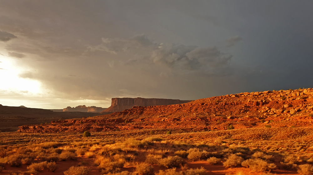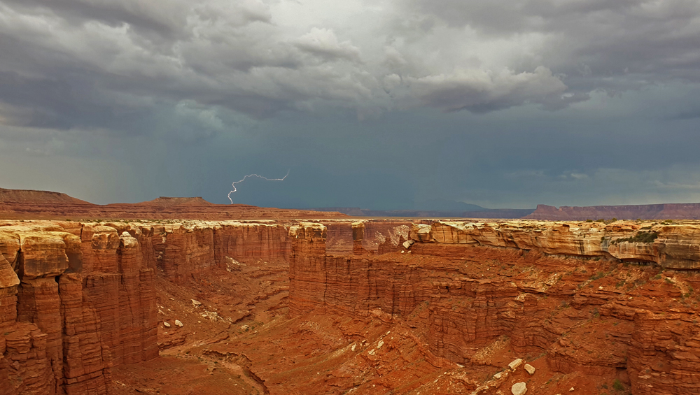 Es ist nicht umsonst so drückend. Am Abend ziehen wieder allseits Gewitter auf. Innert Kürze fällt die Temperatur von fast 40 auf unter 25 Grad – und steigt nach Ende des Gewitters sofort wieder auf 30 Grad an…. Wir unten im Canyon bekommen aber nur einen Staubsturm und ein paar Tropfen ab.